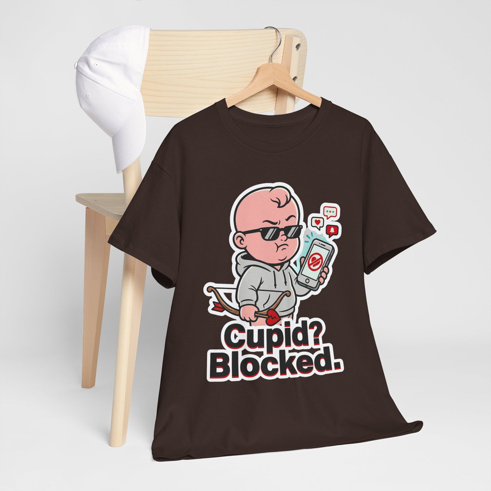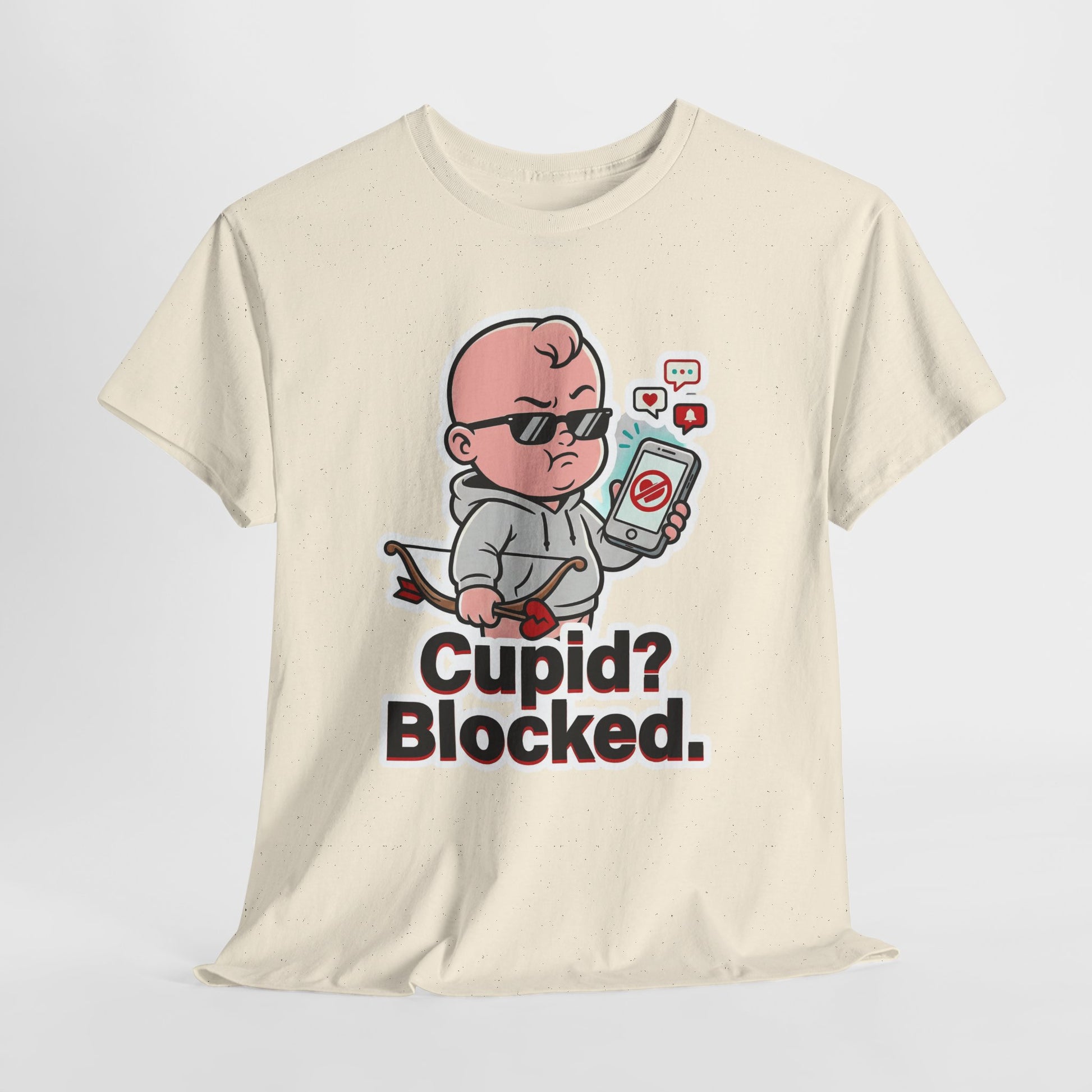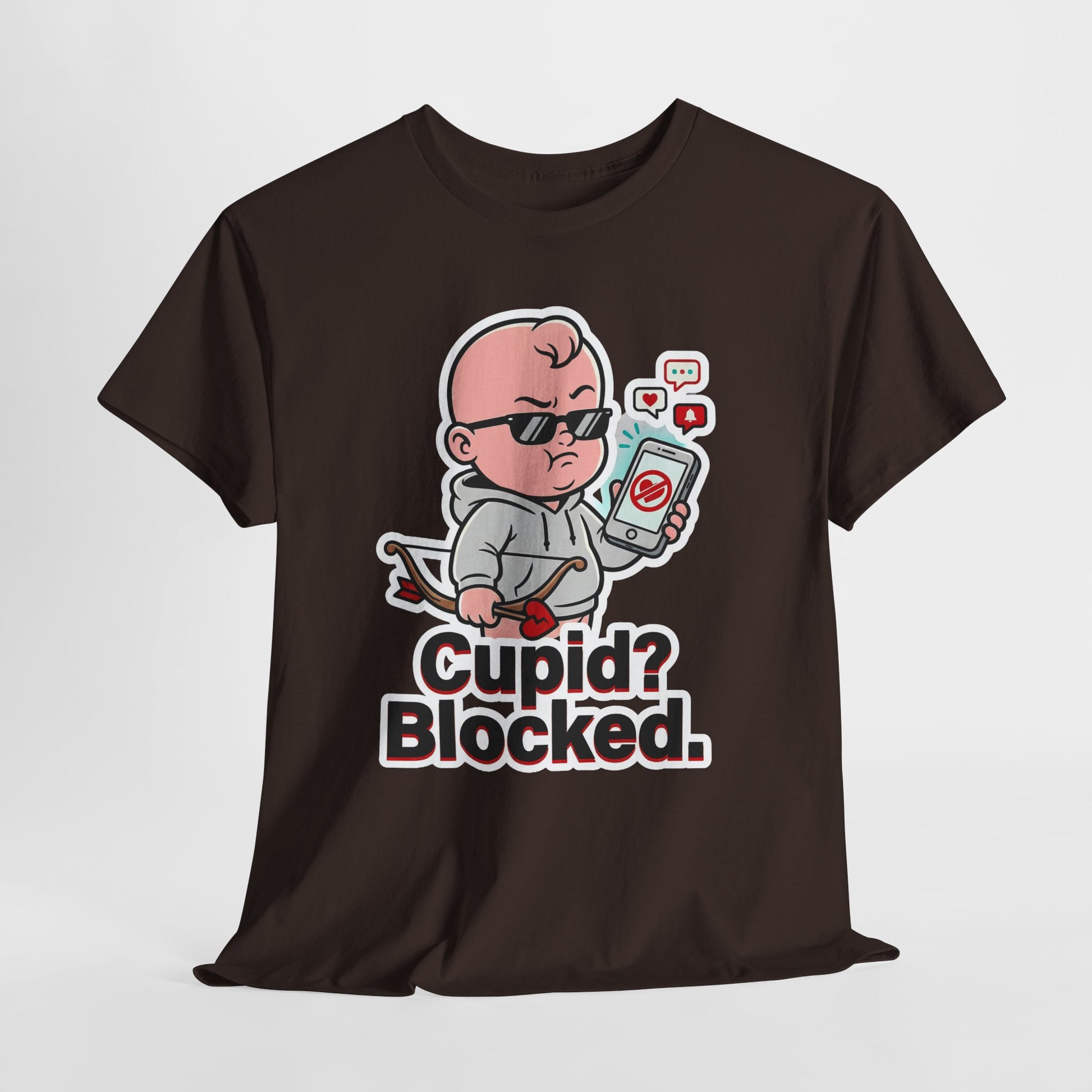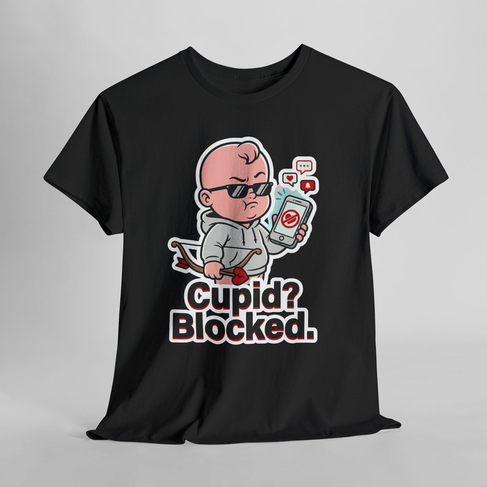 The design spotlights a tough little cupid in black sunglasses holding up a phone with a big blocked symbol on the screen. Around the phone, cute notification icons pop up like a heart, chat bubble, and alert—adding to the joke without needing any extra words. Cupid’s bow and arrow get a twist too, featuring a broken-heart detail that seals the anti-romance energy. The thick sticker-style outline makes the illustration stand out cleanly on a dark tee. Underneath it all, the text reads “Cupid? Blocked.” in big, high-contrast lettering that’s easy to read at a glance. Wear it to a party, a casual hang, or just a regular day when you want your style to be funny and blunt. It pairs perfectly with jeans, joggers, or layered streetwear for maximum attitude.