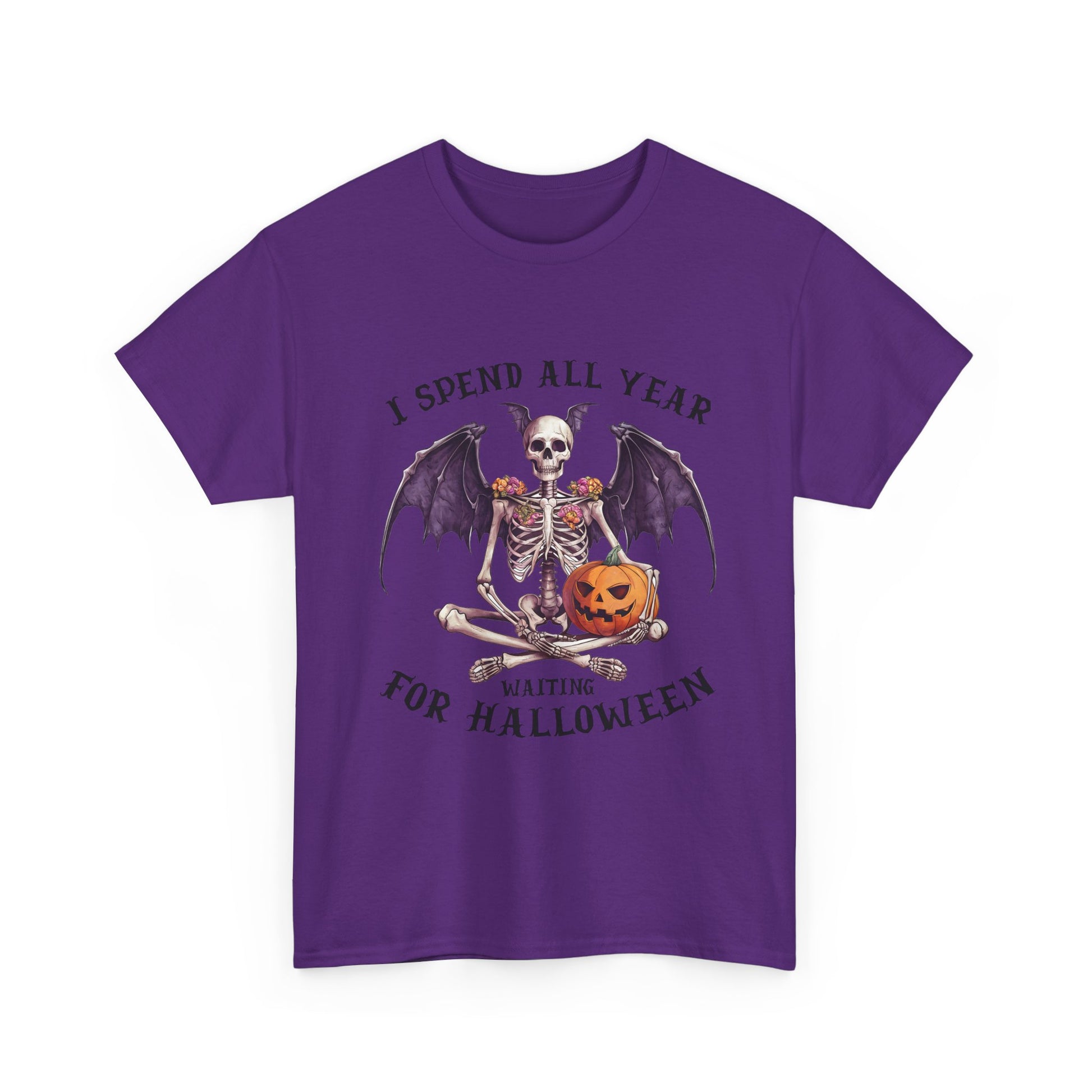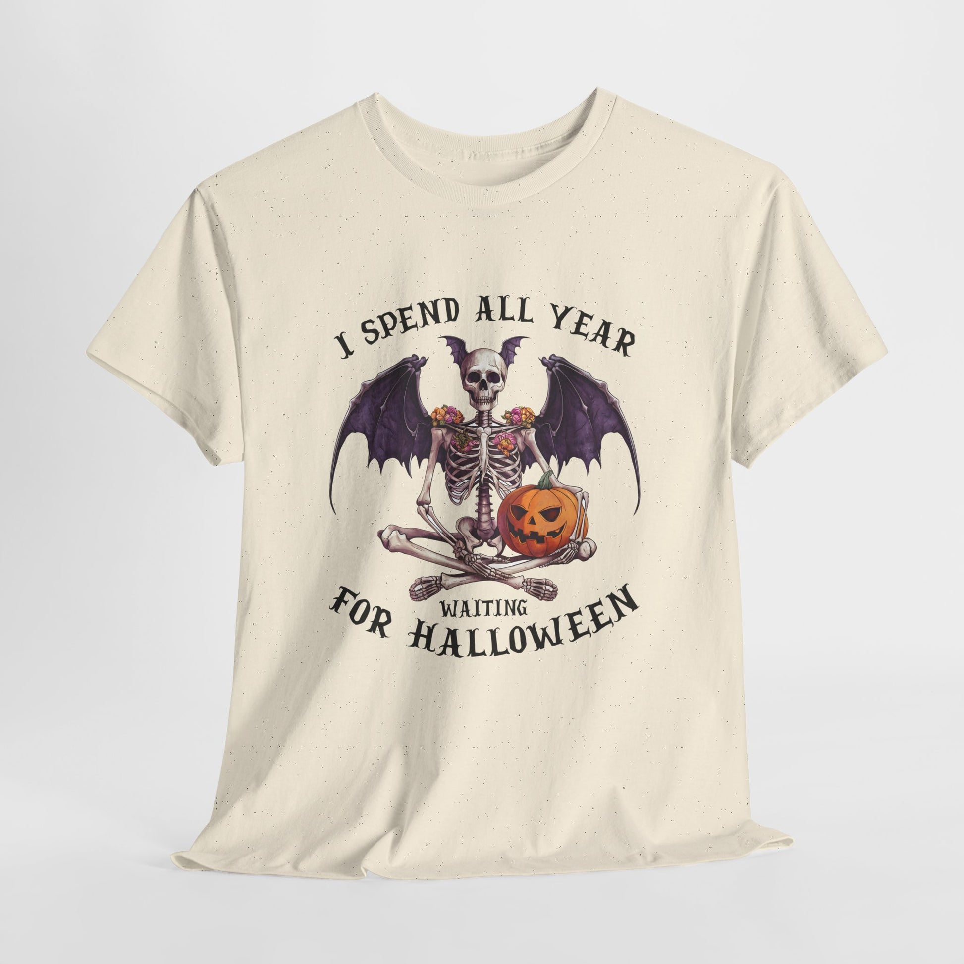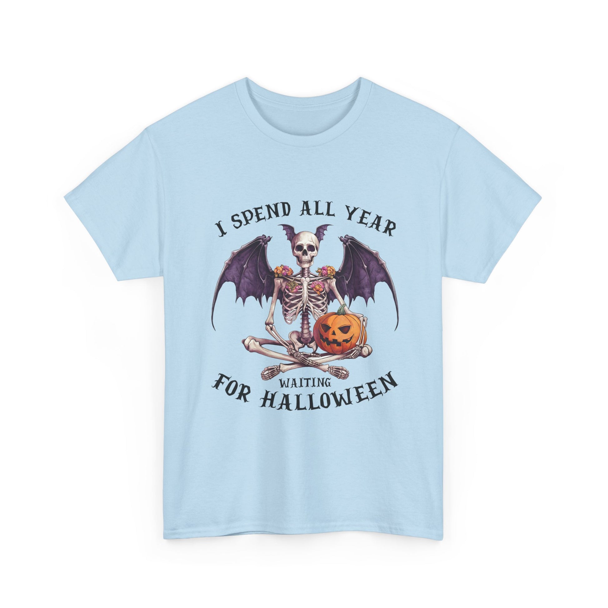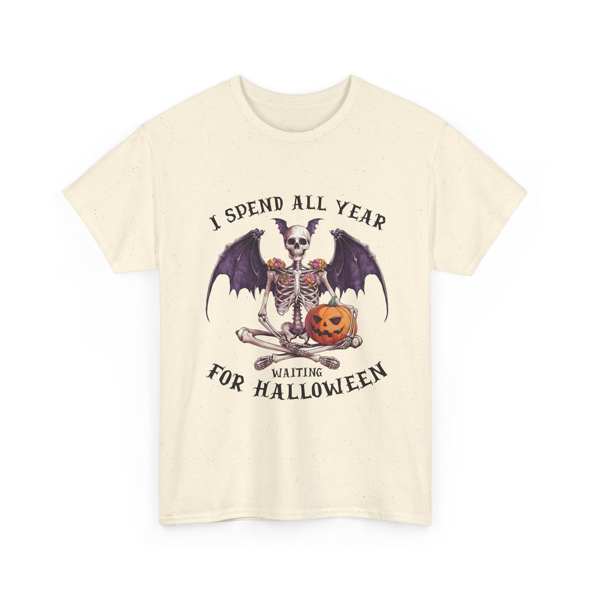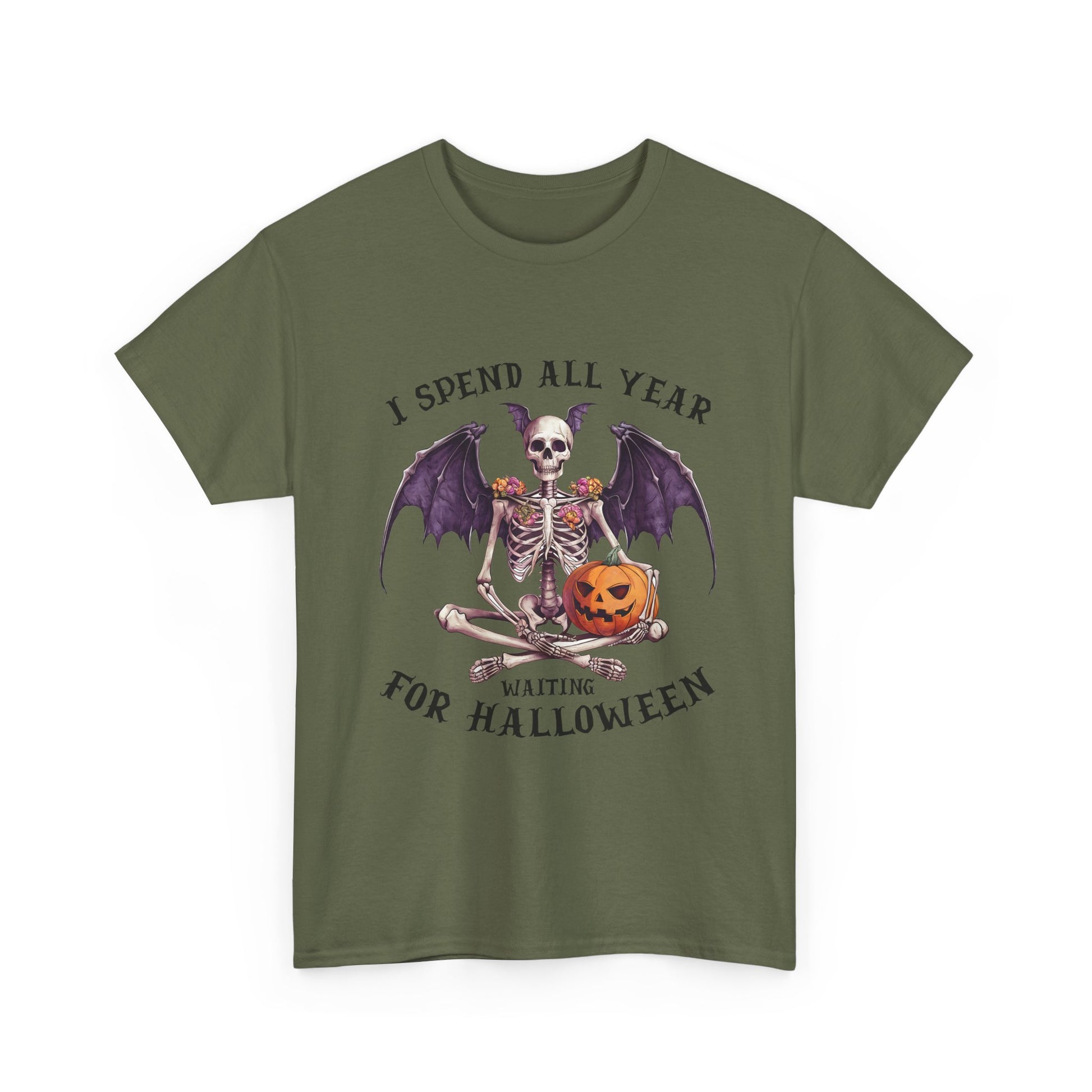 Ta efektowna koszulka przedstawia siedzącego szkieletu z efektownymi skrzydłami nietoperza, kwiatowymi zdobieniami na ramionach i uśmiechniętą dynią. Łączy gotycką estetykę z przytulnym, upiornym urokiem, idealny dla każdego, kto kompletuje mroczną, jesienną garderobę.