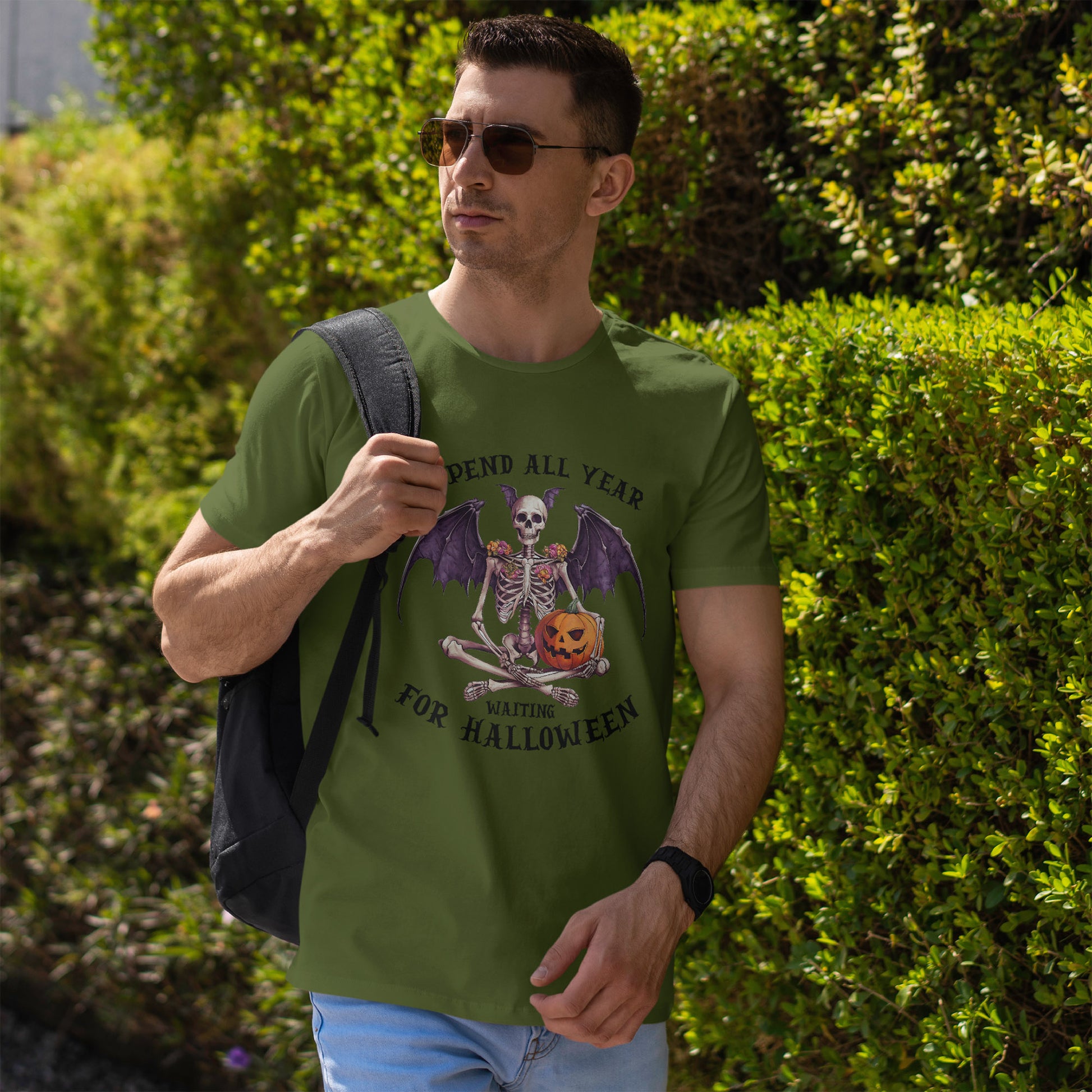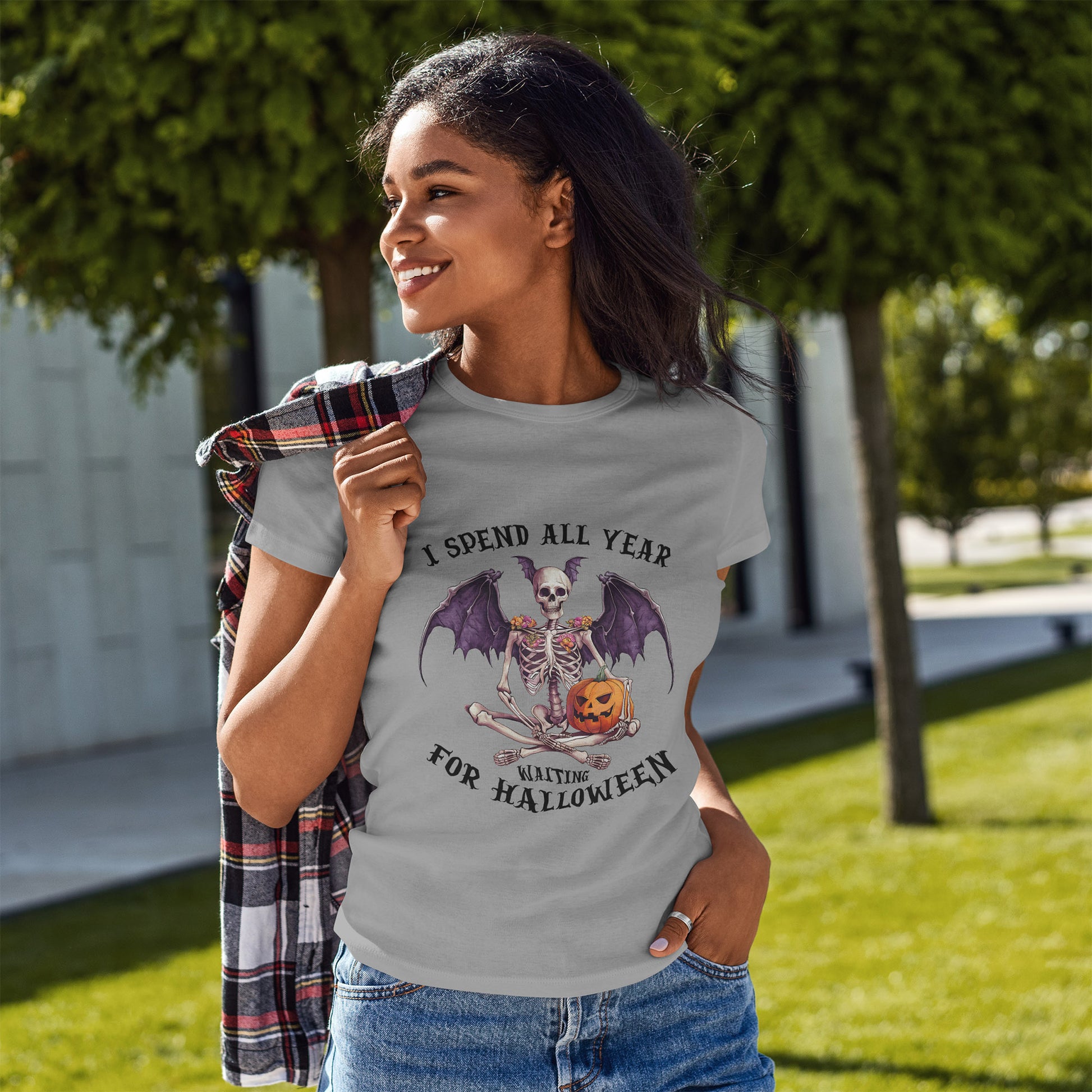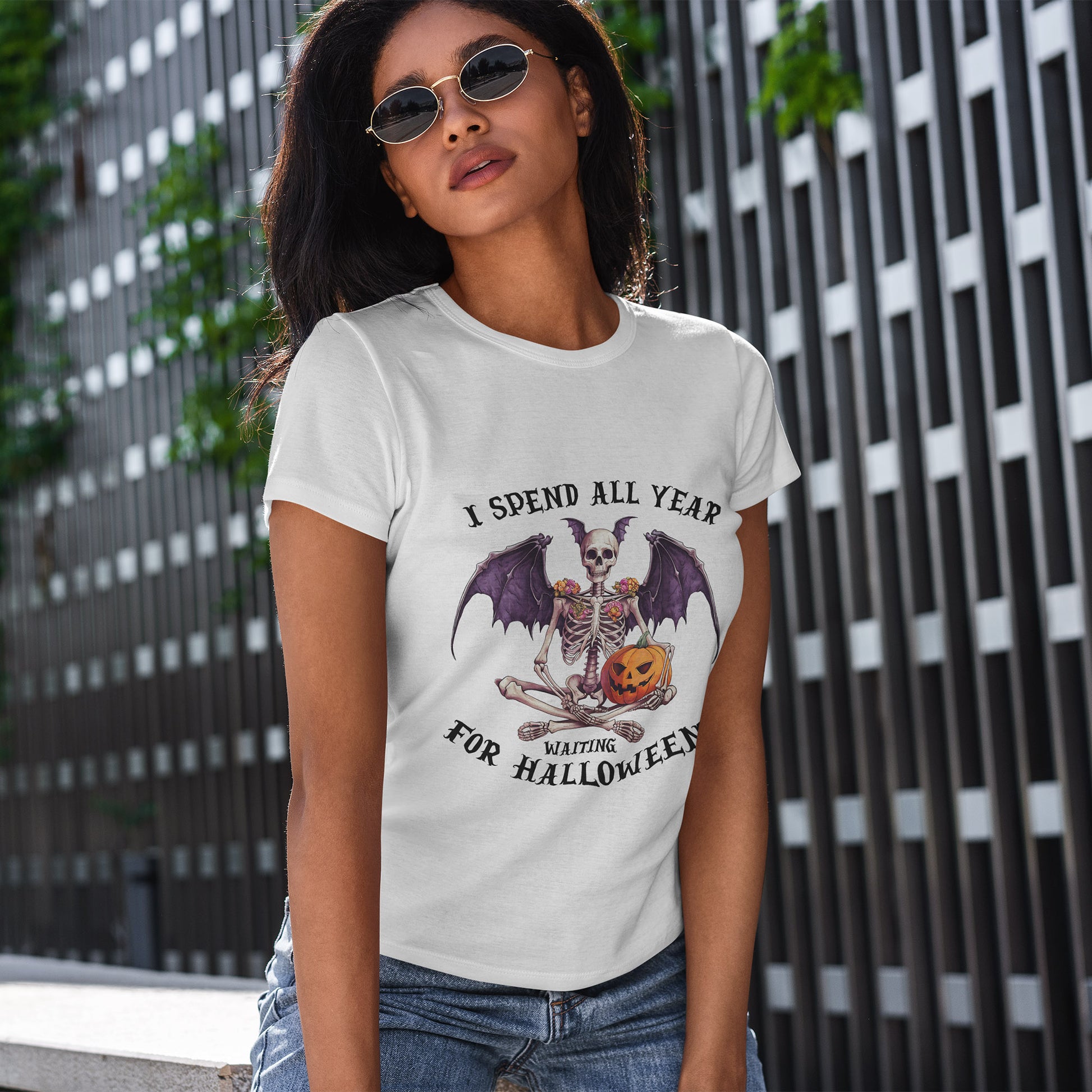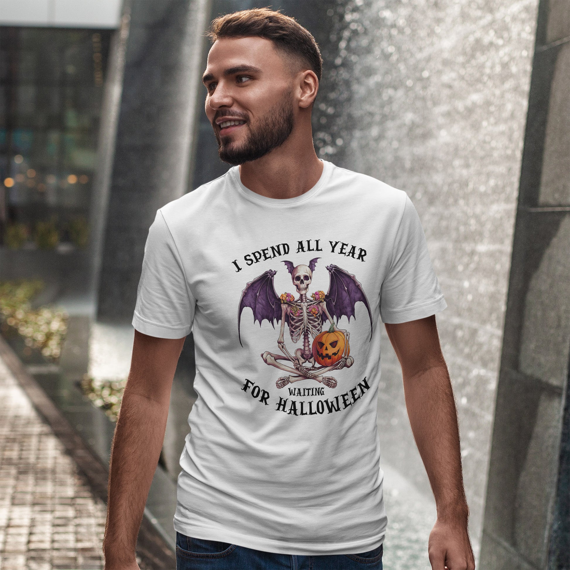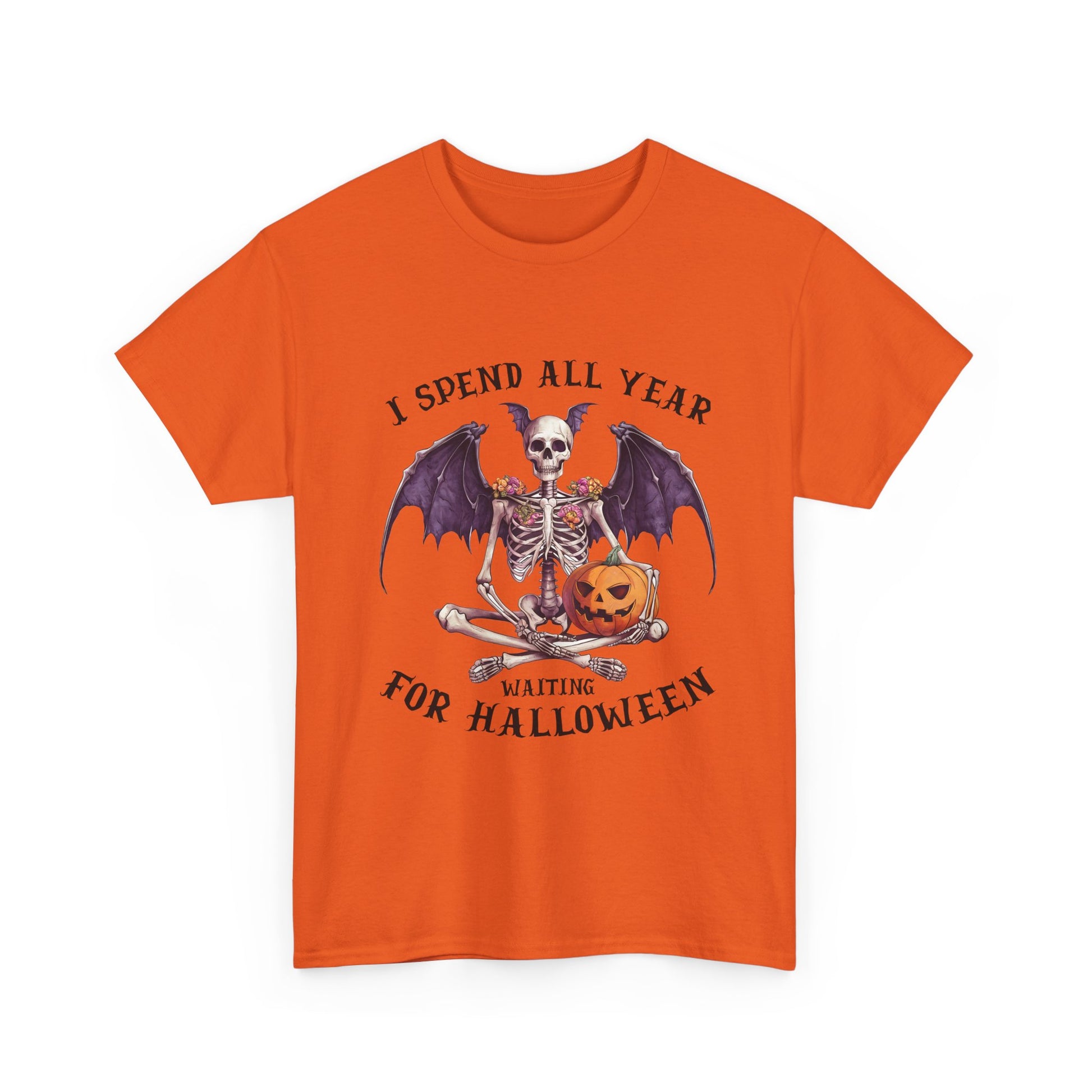 Ta efektowna koszulka przedstawia siedzącego szkieletu z efektownymi skrzydłami nietoperza, kwiatowymi zdobieniami na ramionach i uśmiechniętą dynią. Łączy gotycką estetykę z przytulnym, upiornym urokiem, idealny dla każdego, kto kompletuje mroczną, jesienną garderobę.