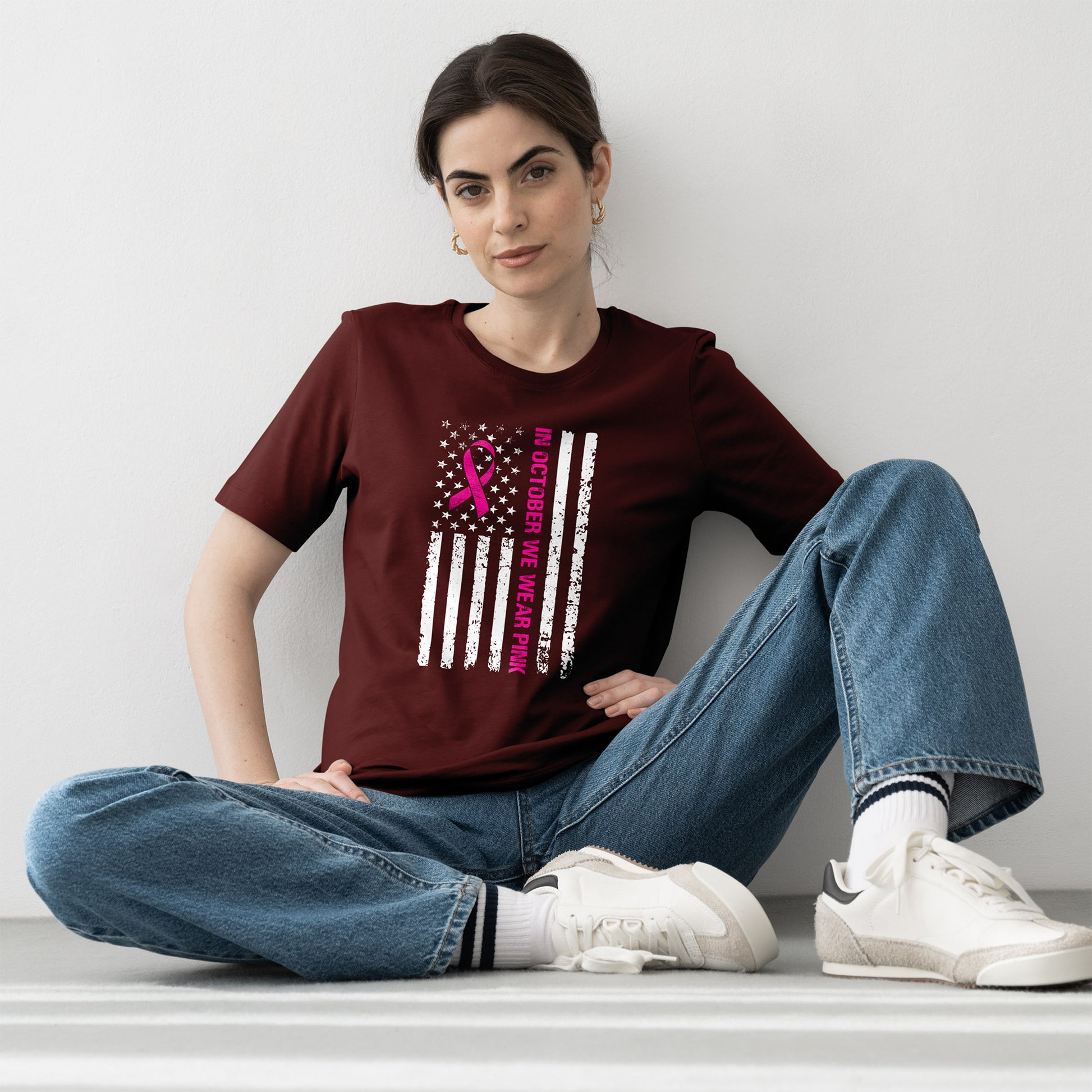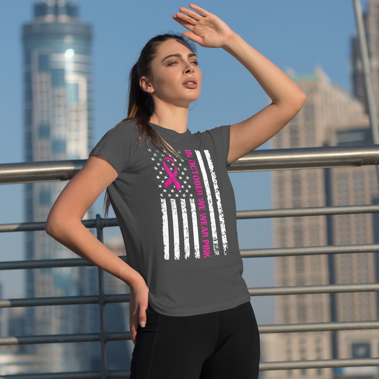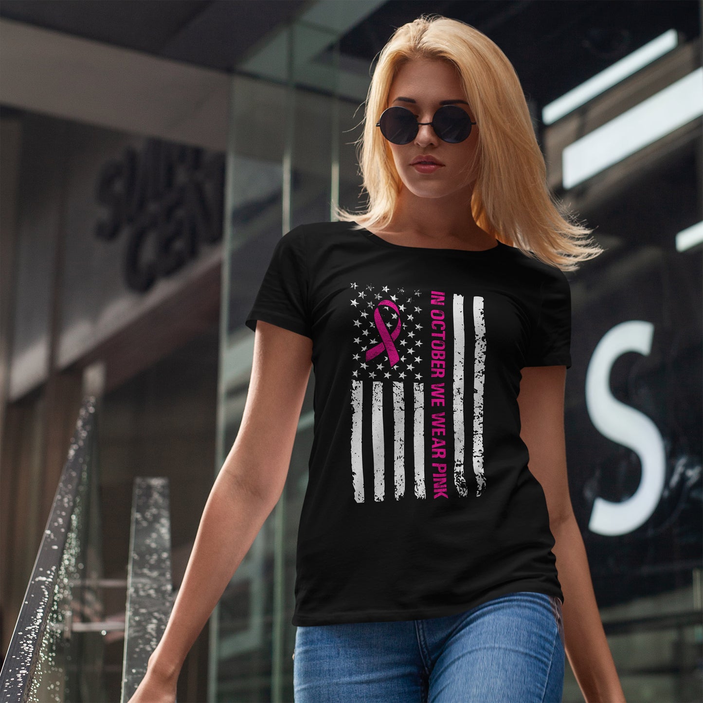 W październiku nosimy różową koszulkę – koszulka z motywem świadomości raka piersi z różową wstążką i flagą USA w stylu grunge, koszulka z wyrazami wsparcia i zbiórką funduszy