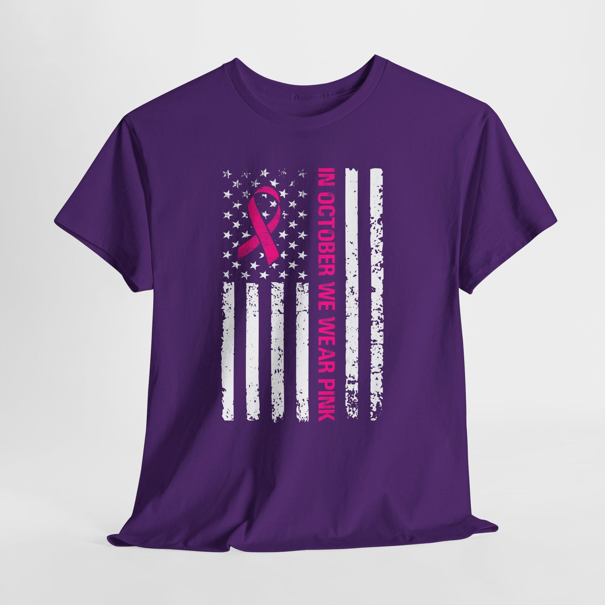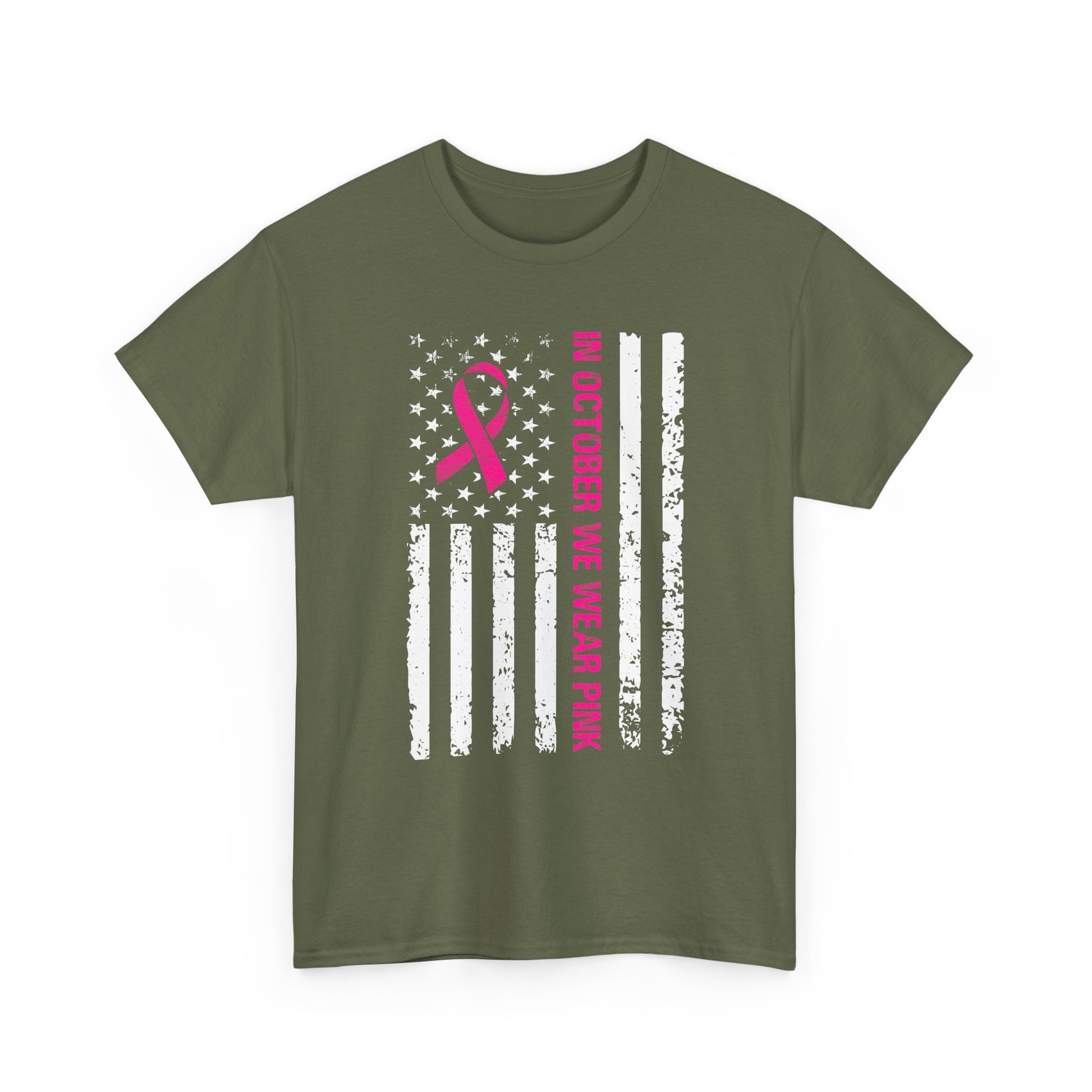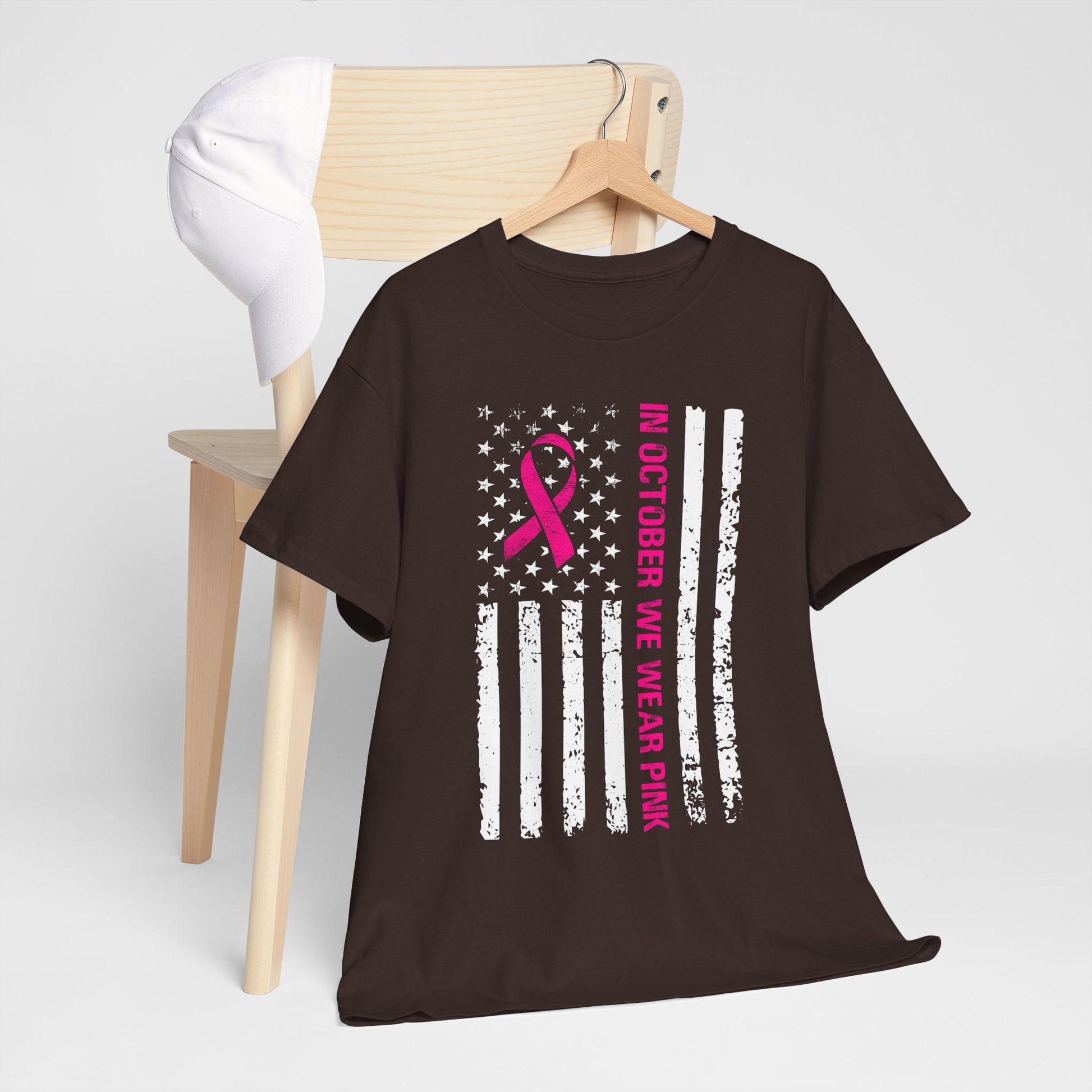 W październiku nosimy różową koszulkę – koszulka z motywem świadomości raka piersi z różową wstążką i flagą USA w stylu grunge, koszulka z wyrazami wsparcia i zbiórką funduszy