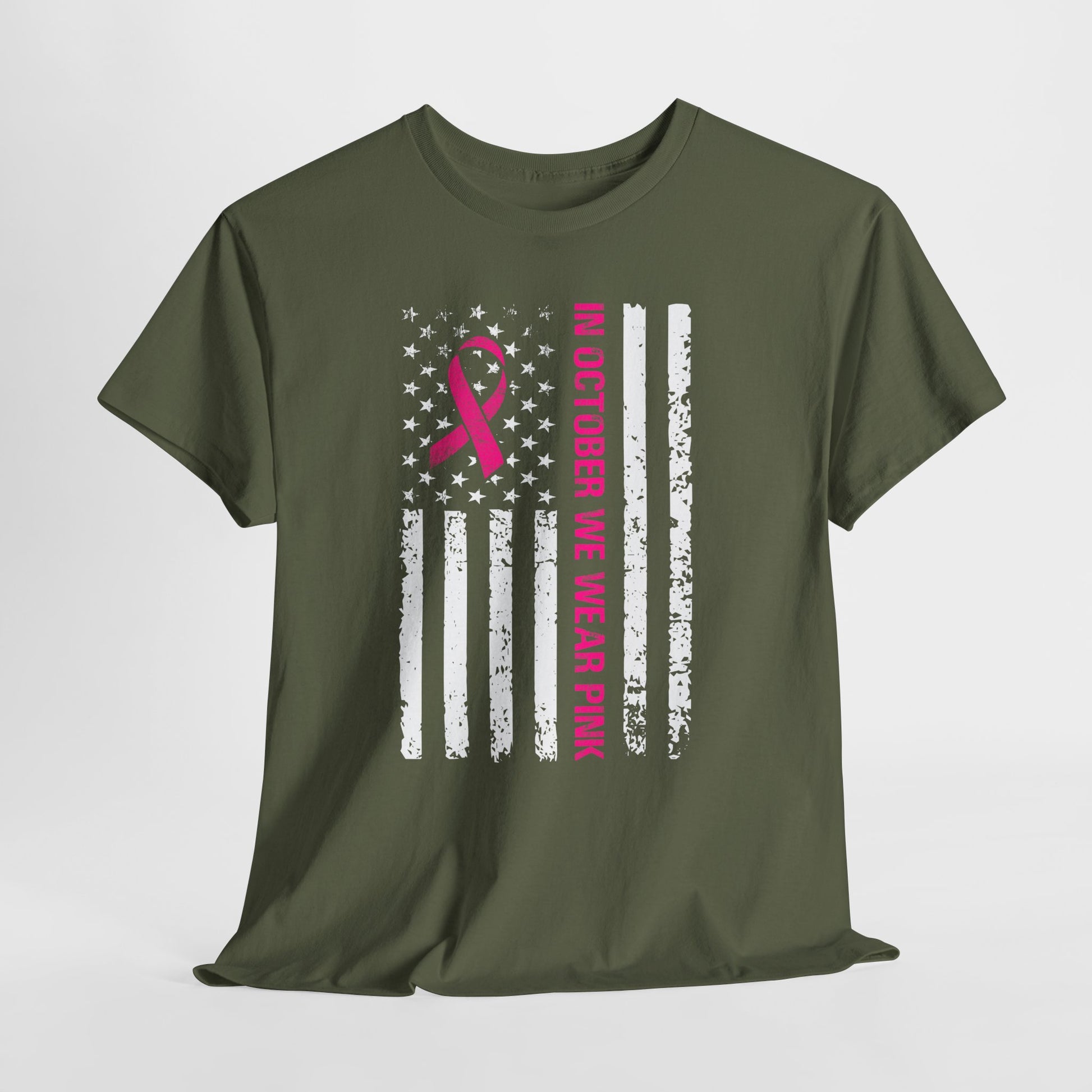 Ta odważna koszulka z nadrukiem przedstawia kultową różową wstążkę promującą walkę z rakiem piersi na tle zniszczonej amerykańskiej flagi. Z mocnym przesłaniem „W październiku nosimy róż” to coś więcej niż zwykła koszulka – to symbol nadziei, solidarności i walki o znalezienie lekarstwa.
