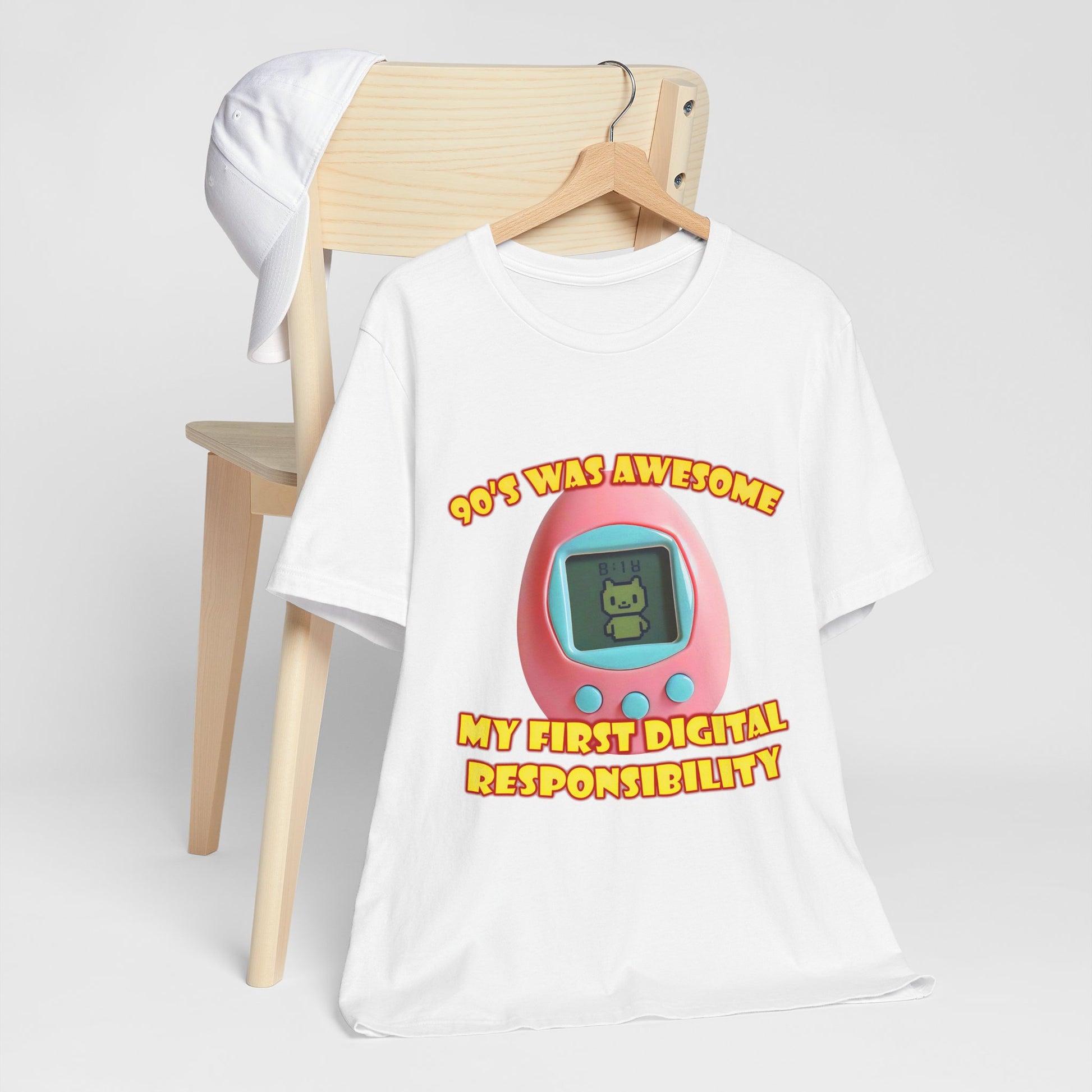 Koszulka „Moja pierwsza cyfrowa odpowiedzialność” – koszulka z wirtualnym zwierzakiem z lat 90.