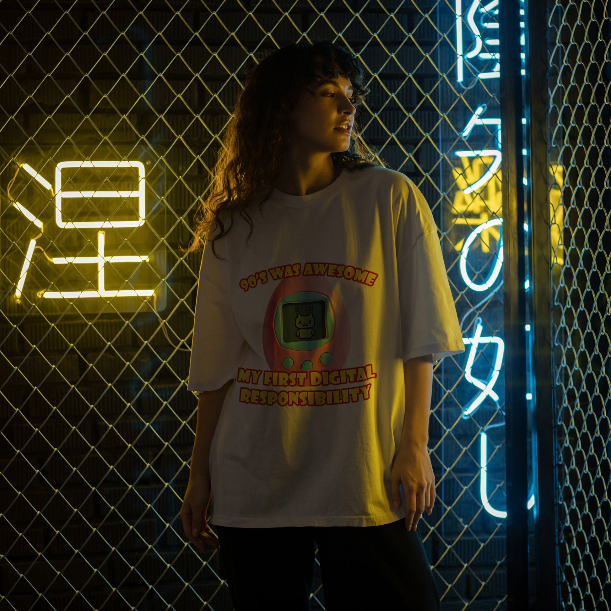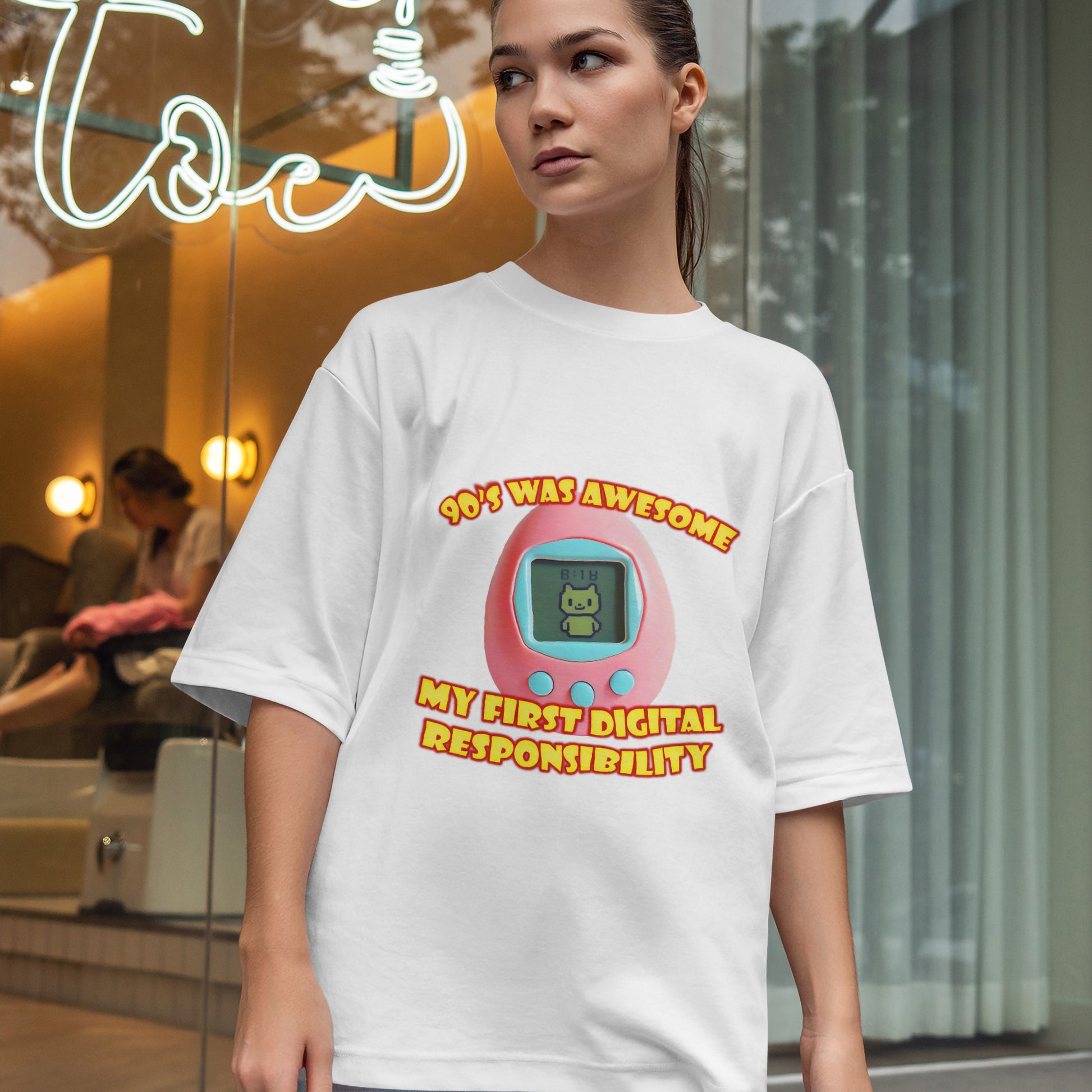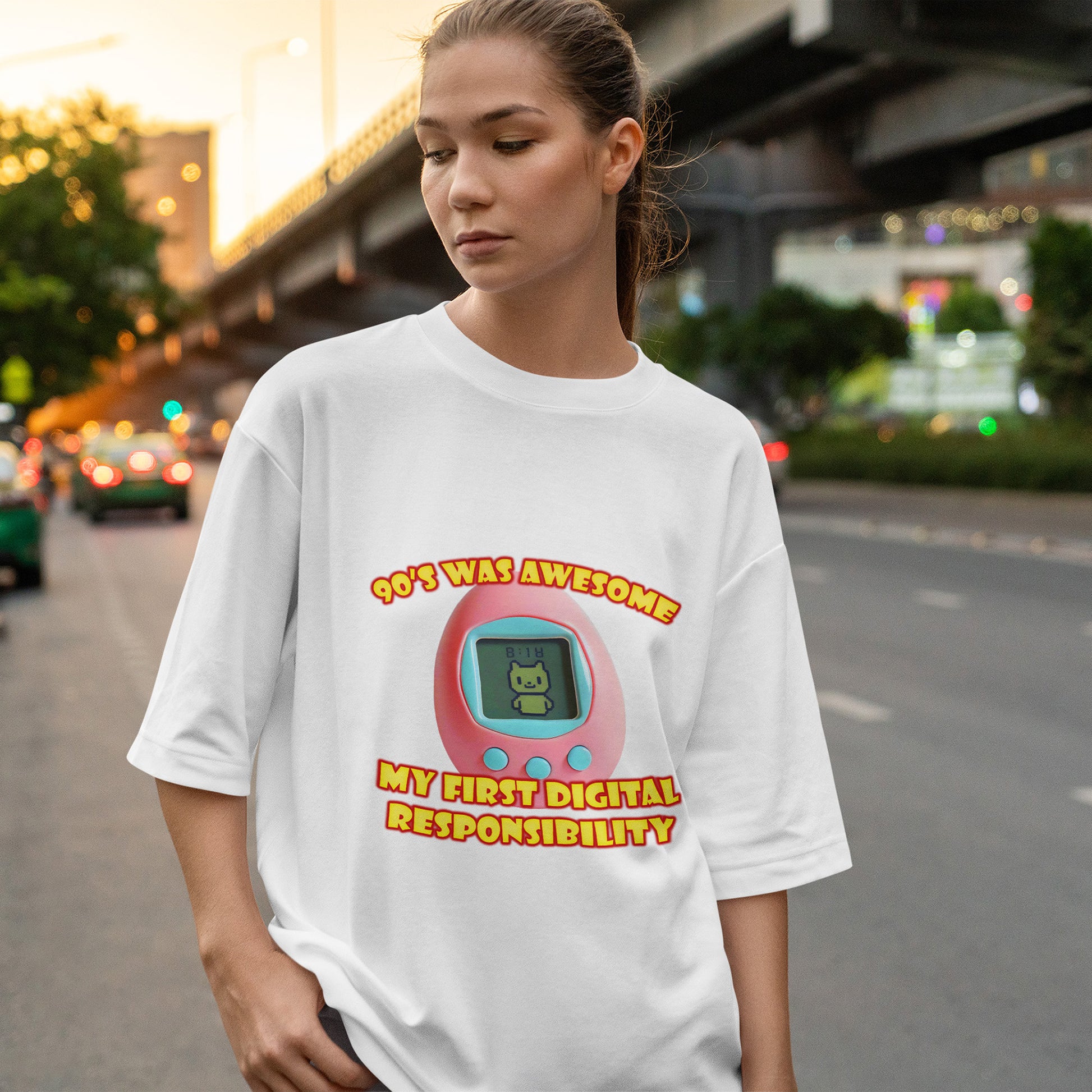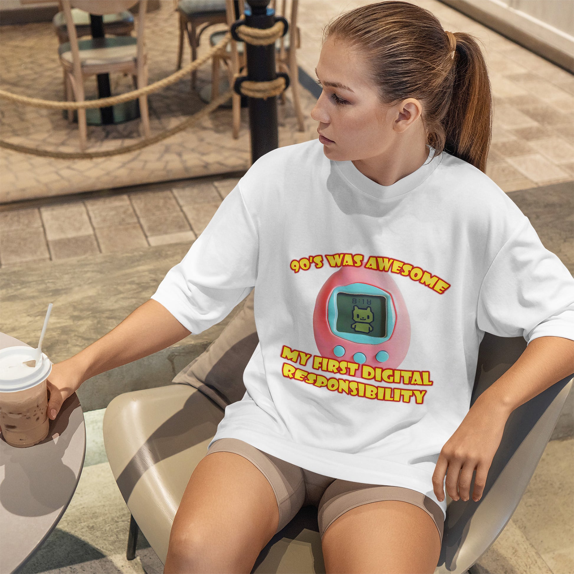 Przed pojawieniem się smartfonów mieliśmy pikselowe zwierzaki, którymi trzeba było się opiekować. Retro cyfrowa grafika zwierzaka z napisem „Moja pierwsza cyfrowa odpowiedzialność” oddaje nocne piknięcia, mały jajowaty ekran i panikę, gdy zapomnisz nakarmić wirtualnego przyjaciela. Czysty klimat lat 90. z serii „90s Was Awesome”.