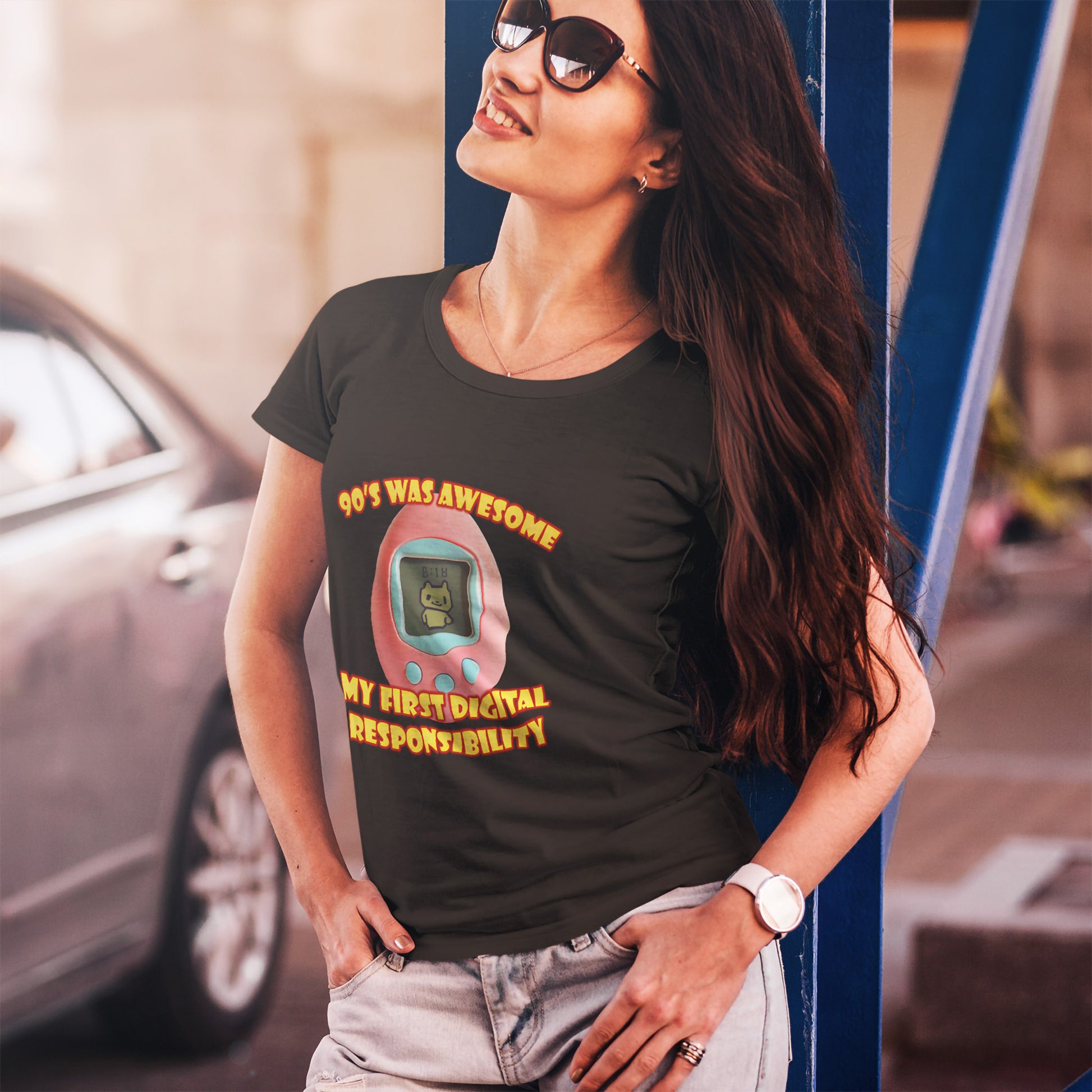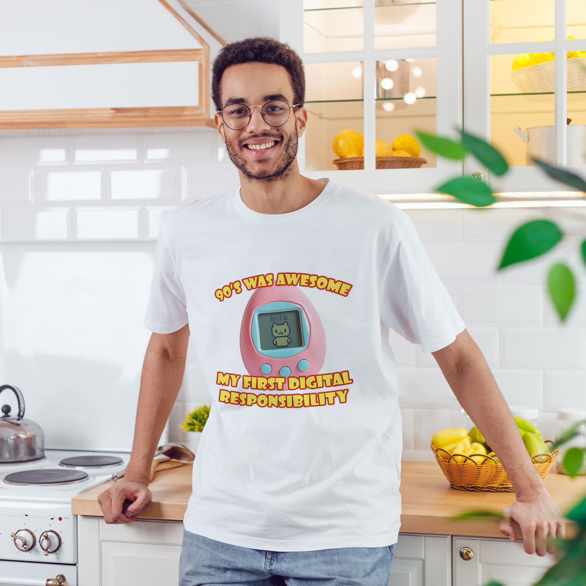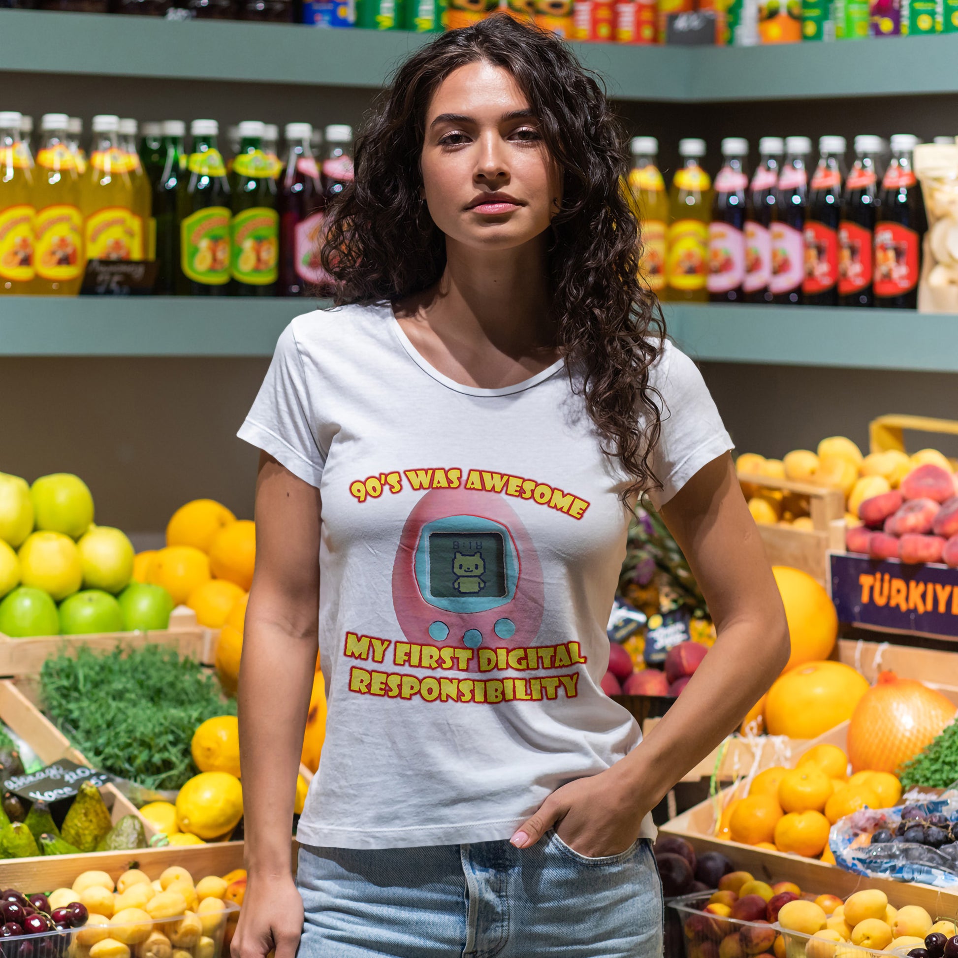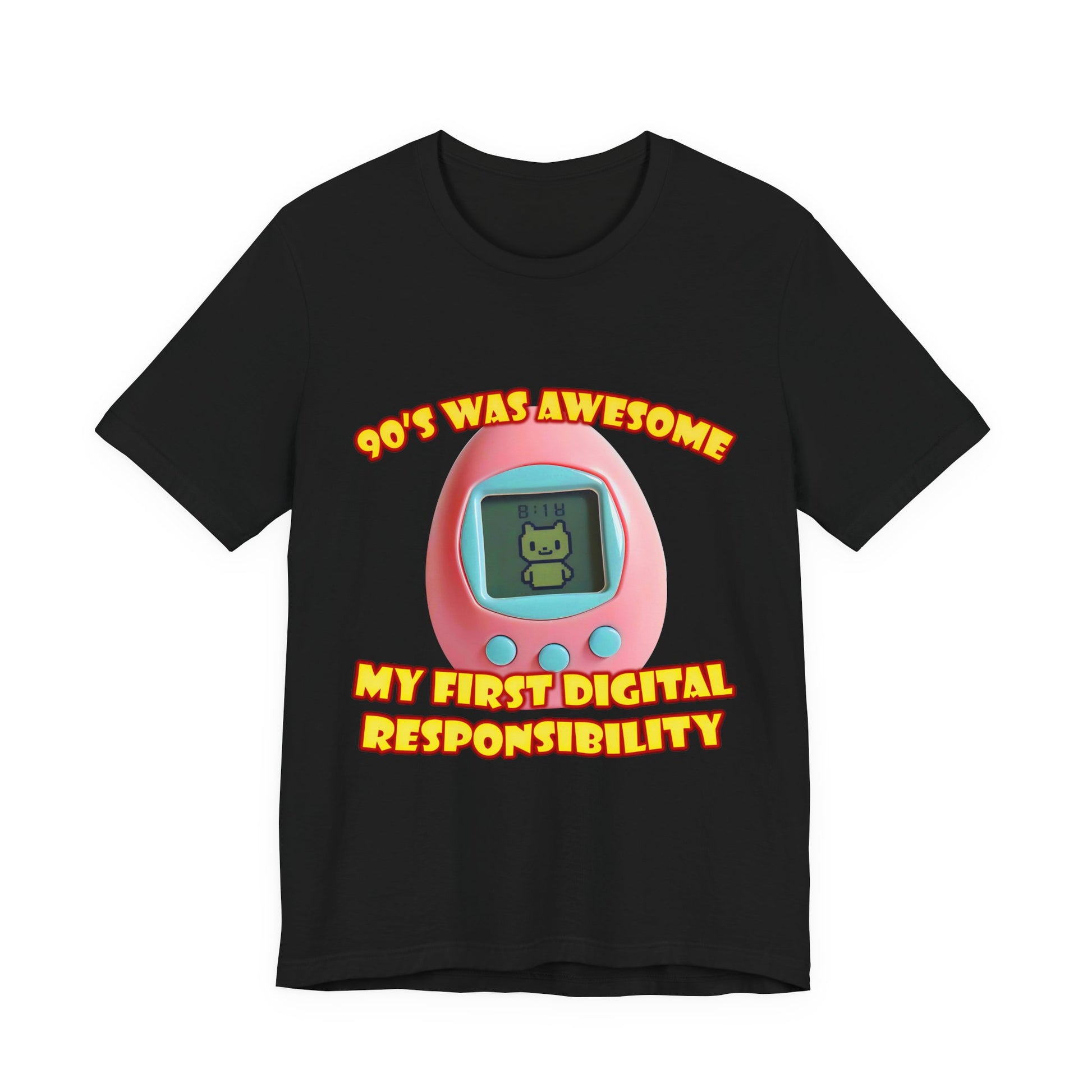 Przed pojawieniem się smartfonów mieliśmy pikselowe zwierzaki, którymi trzeba było się opiekować. Retro cyfrowa grafika zwierzaka z napisem „Moja pierwsza cyfrowa odpowiedzialność” oddaje nocne piknięcia, mały jajowaty ekran i panikę, gdy zapomnisz nakarmić wirtualnego przyjaciela. Czysty klimat lat 90. z serii „90s Was Awesome”.