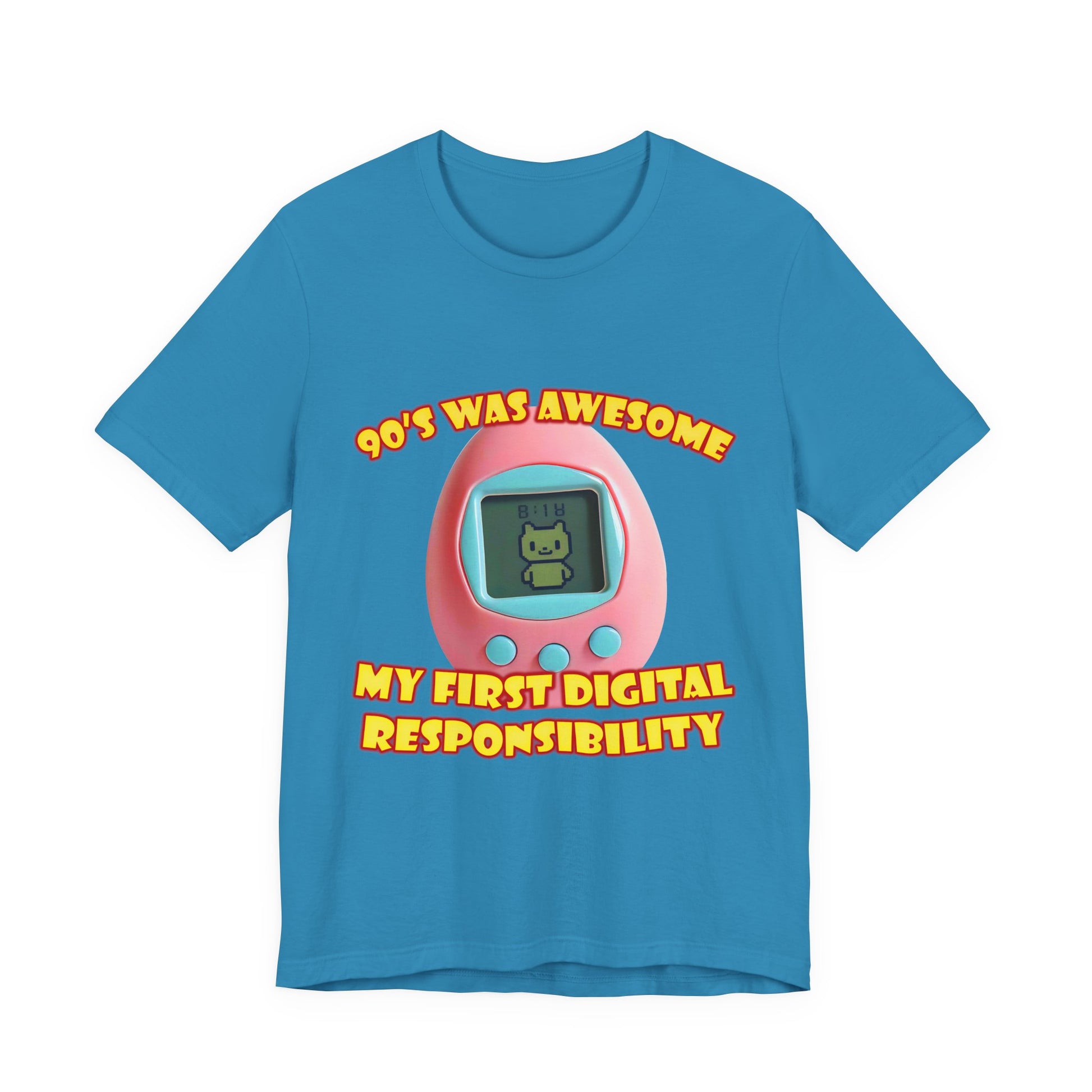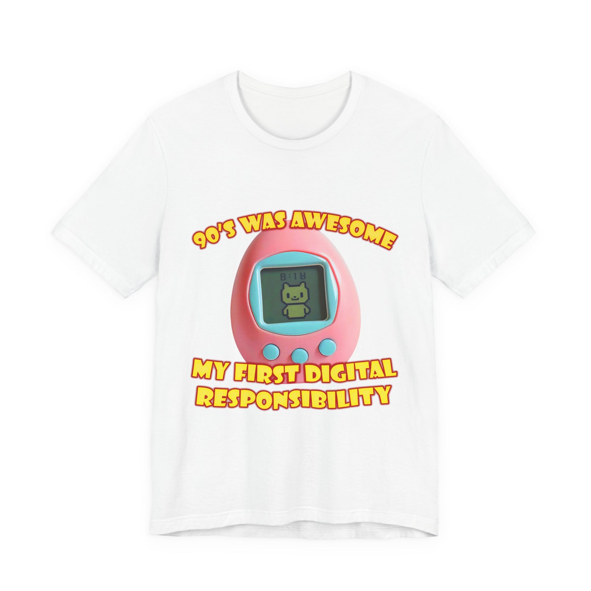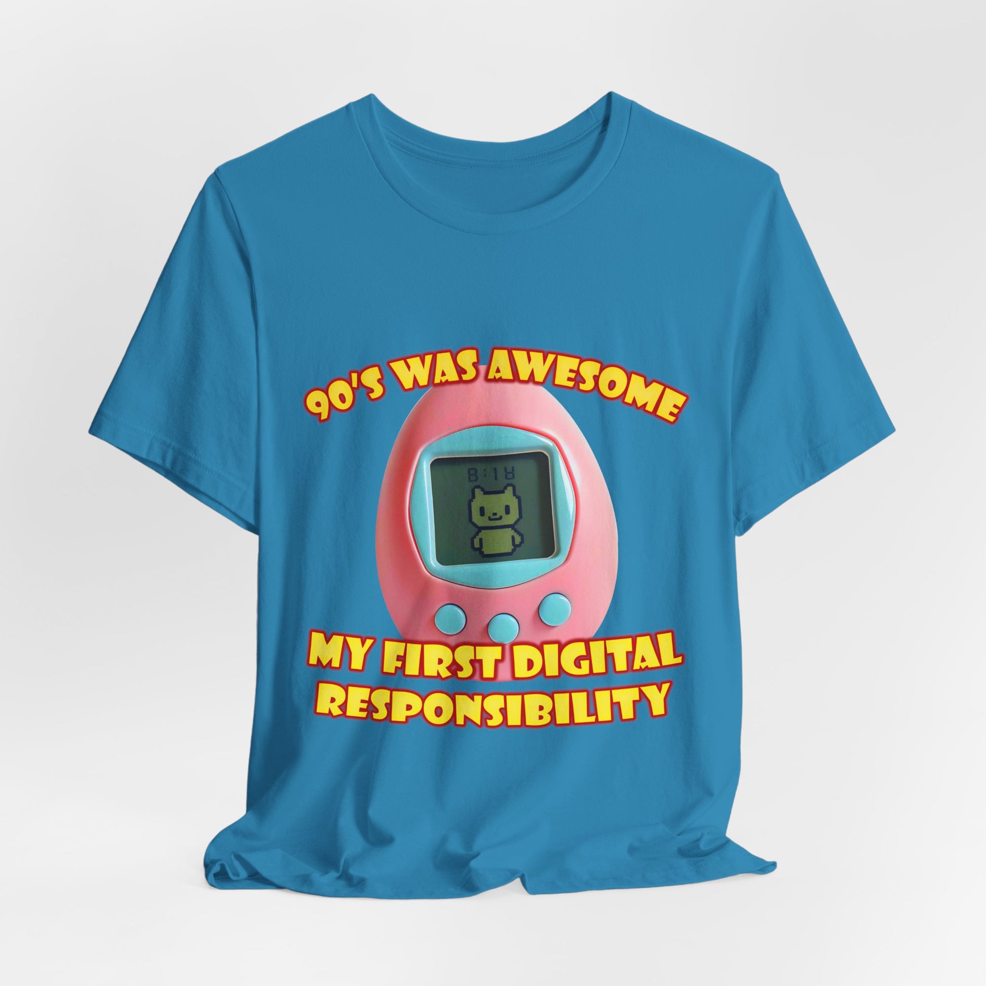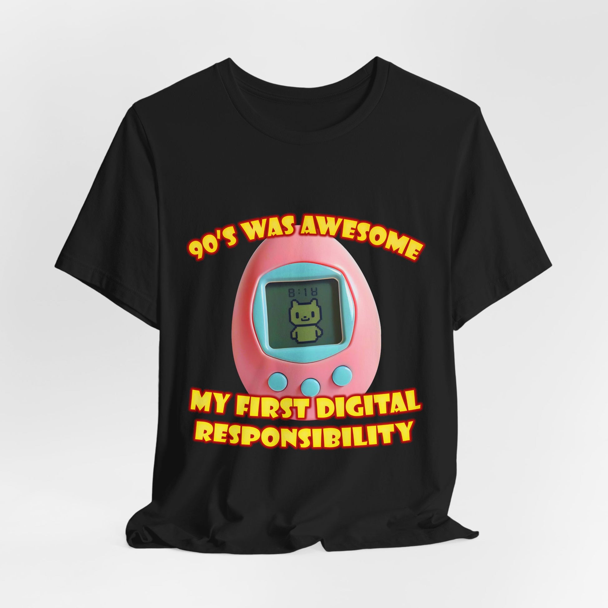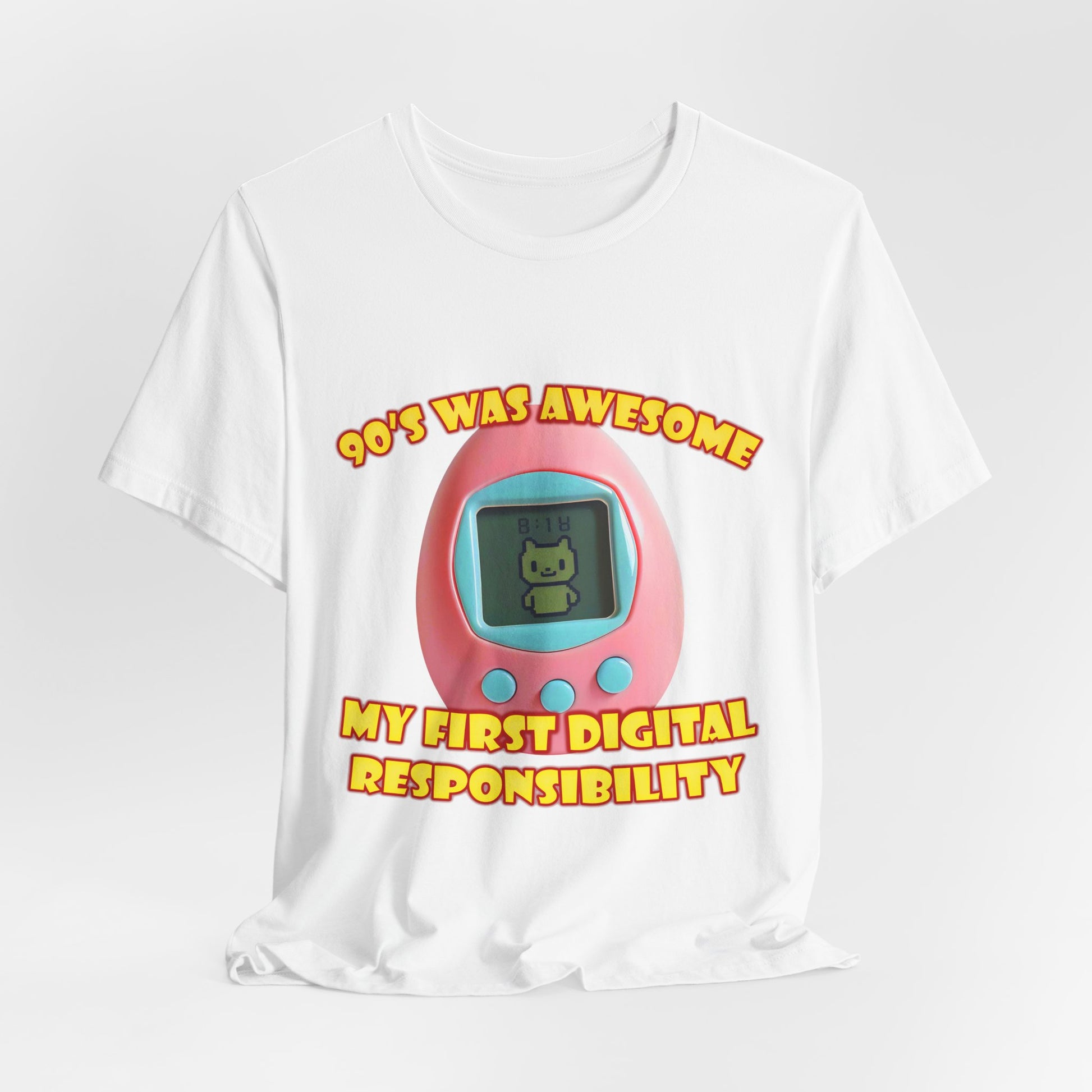 Przed pojawieniem się smartfonów mieliśmy pikselowe zwierzaki, którymi trzeba było się opiekować. Retro cyfrowa grafika zwierzaka z napisem „Moja pierwsza cyfrowa odpowiedzialność” oddaje nocne piknięcia, mały jajowaty ekran i panikę, gdy zapomnisz nakarmić wirtualnego przyjaciela. Czysty klimat lat 90. z serii „90s Was Awesome”.