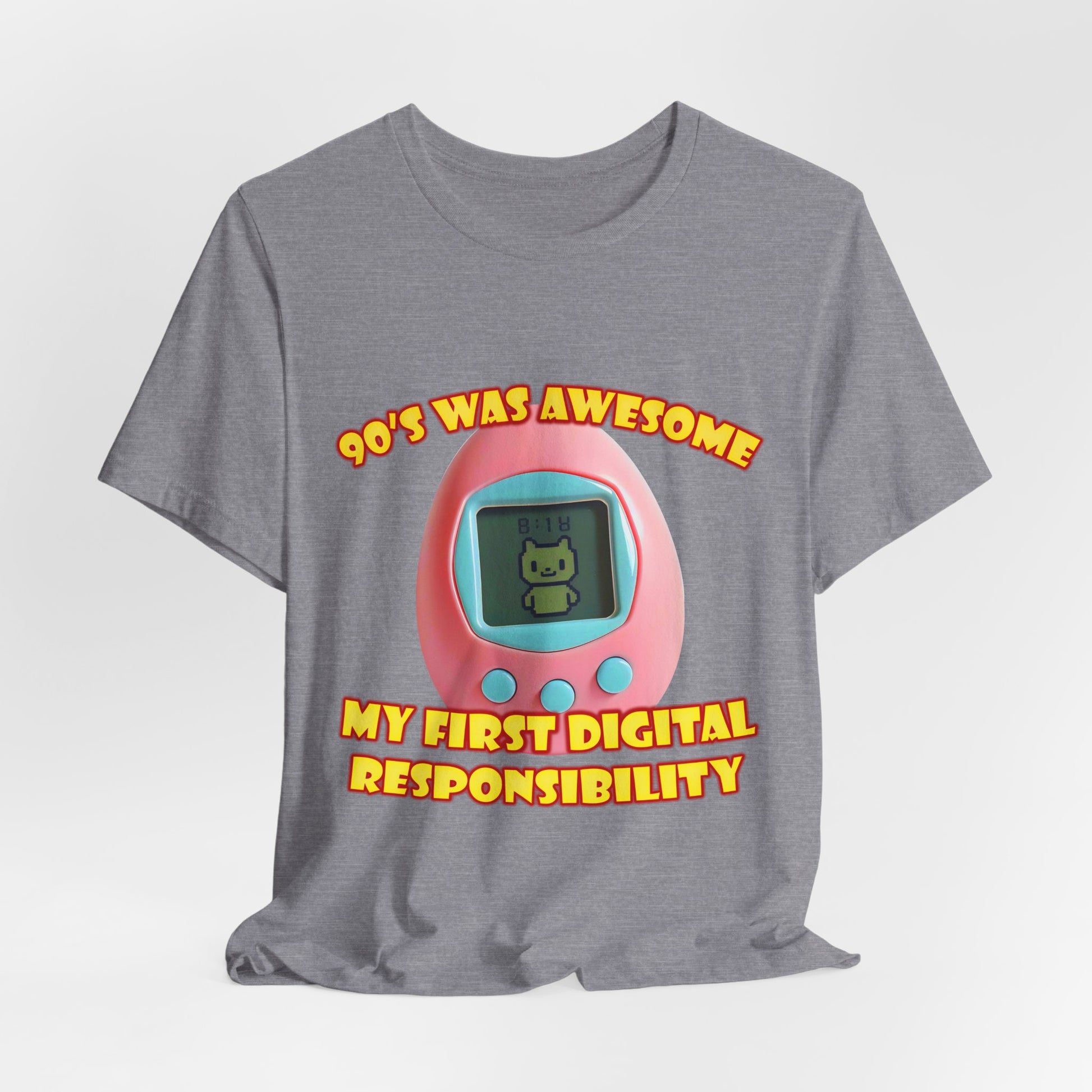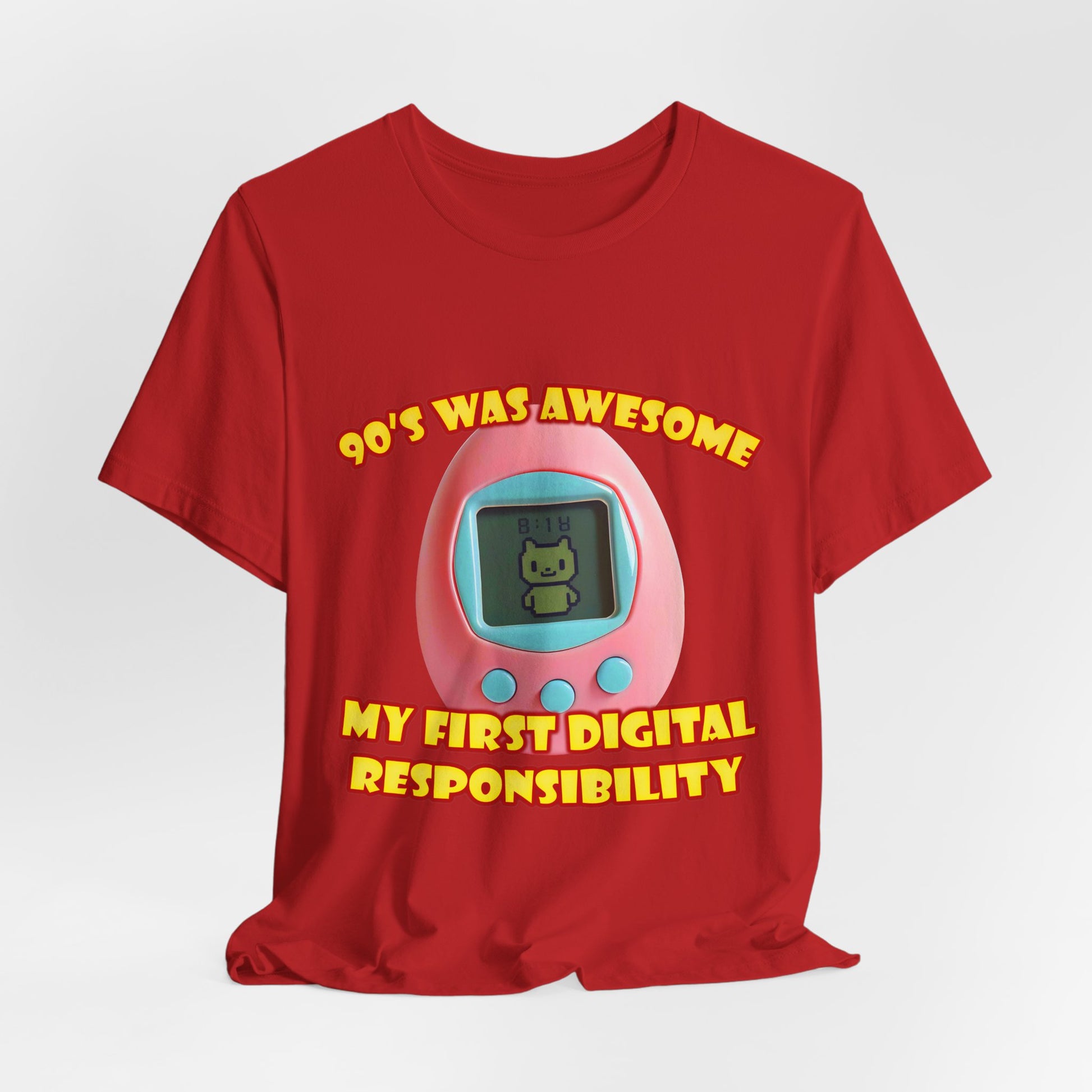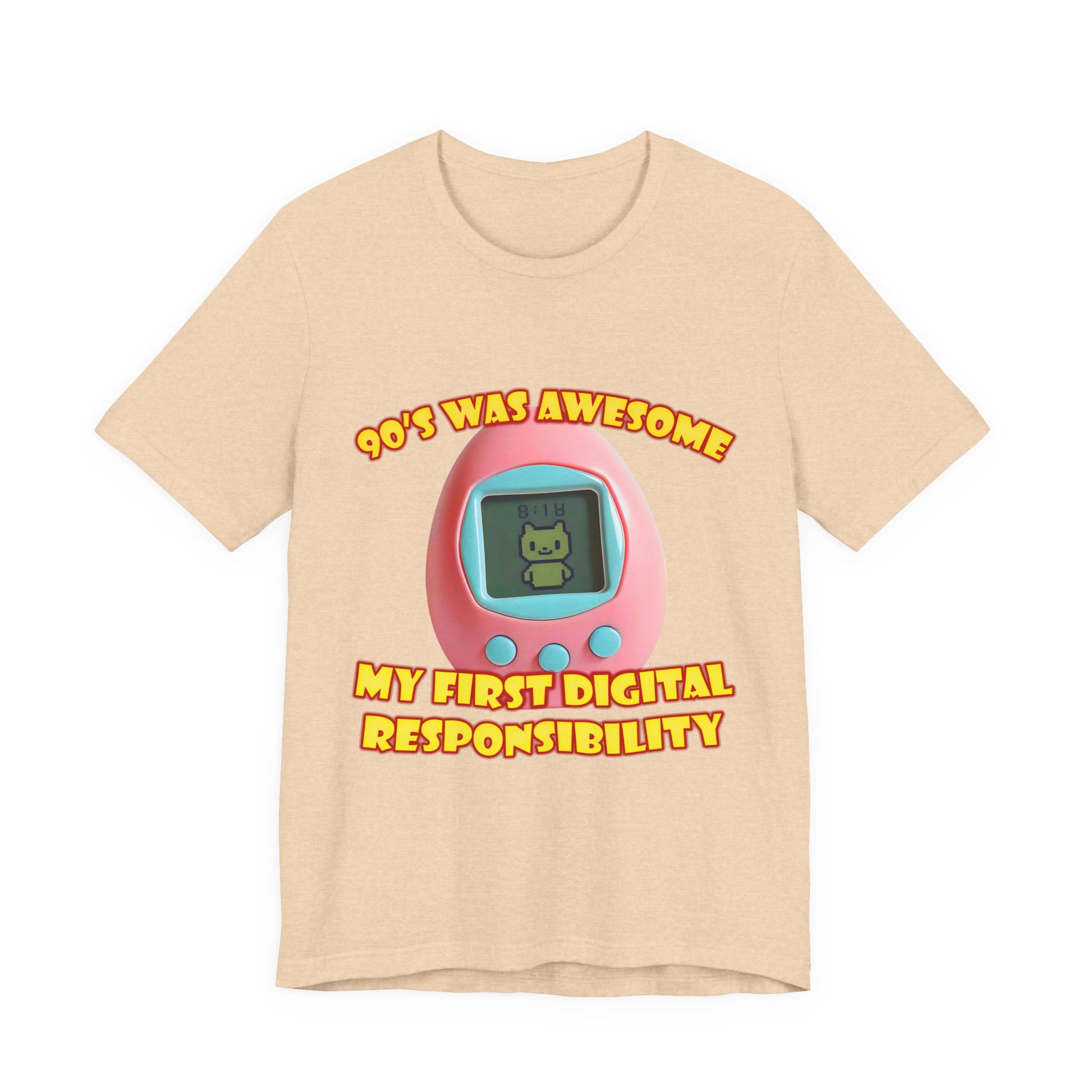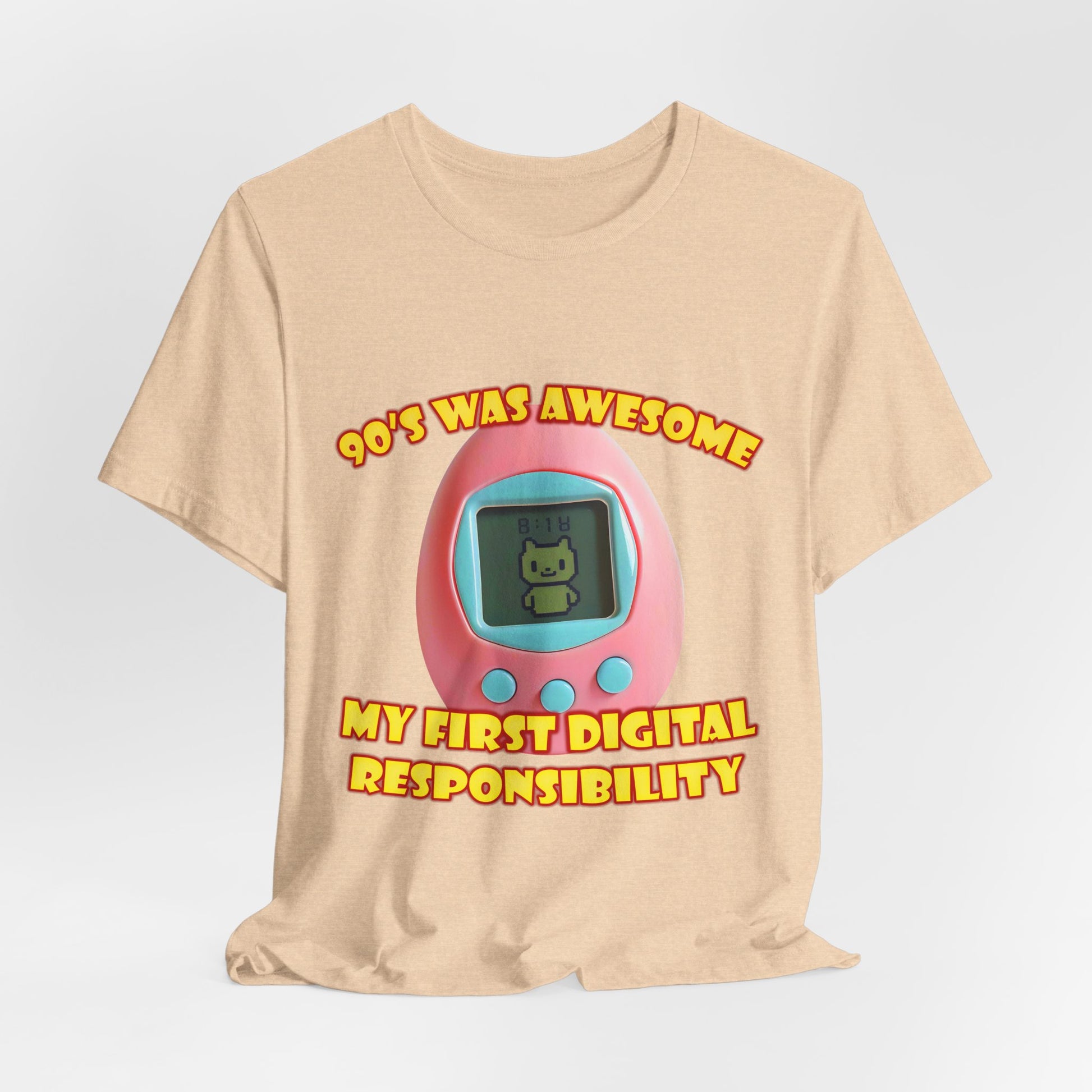 Przed pojawieniem się smartfonów mieliśmy pikselowe zwierzaki, którymi trzeba było się opiekować. Retro cyfrowa grafika zwierzaka z napisem „Moja pierwsza cyfrowa odpowiedzialność” oddaje nocne piknięcia, mały jajowaty ekran i panikę, gdy zapomnisz nakarmić wirtualnego przyjaciela. Czysty klimat lat 90. z serii „90s Was Awesome”.
