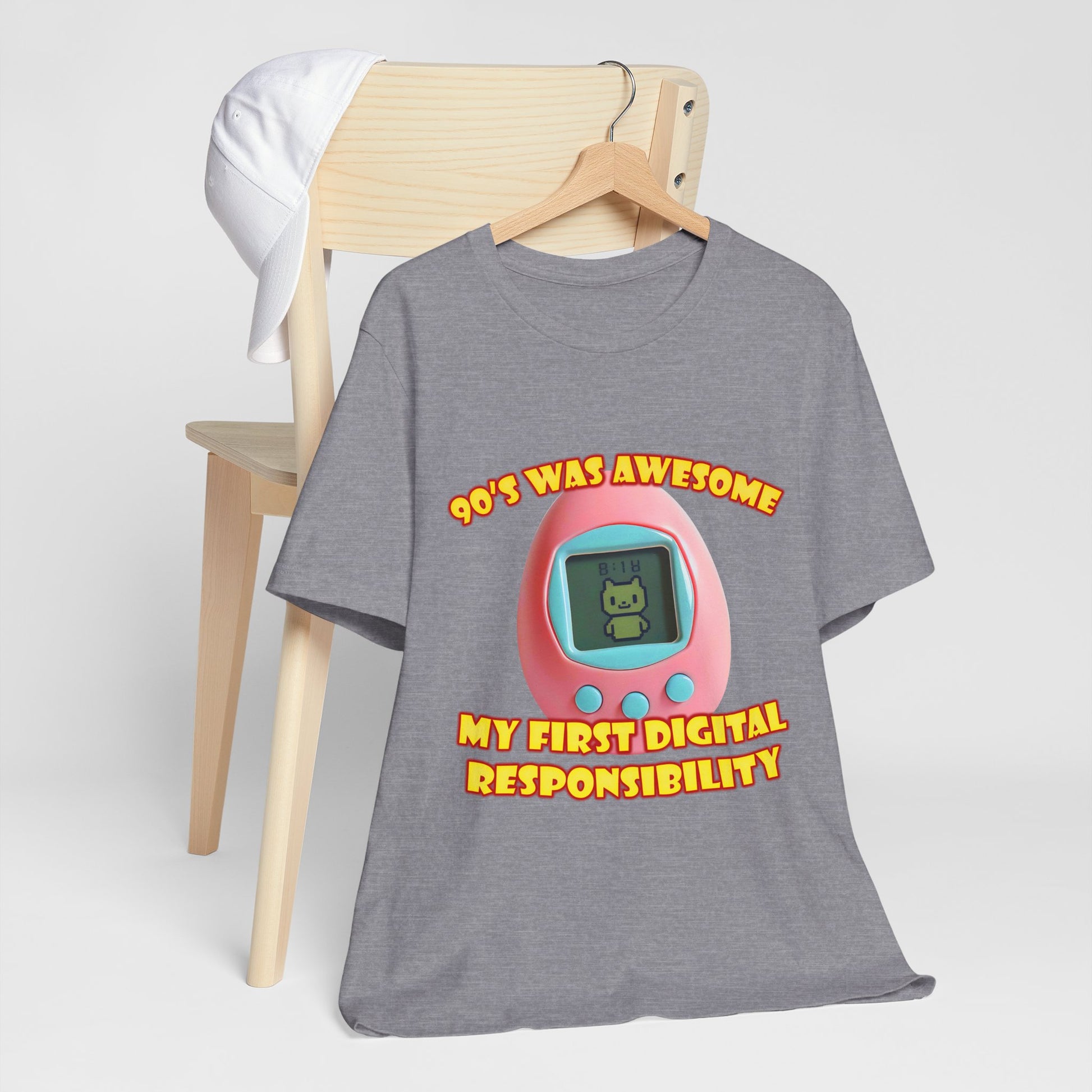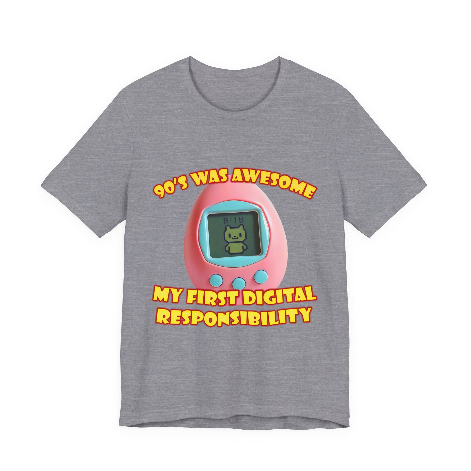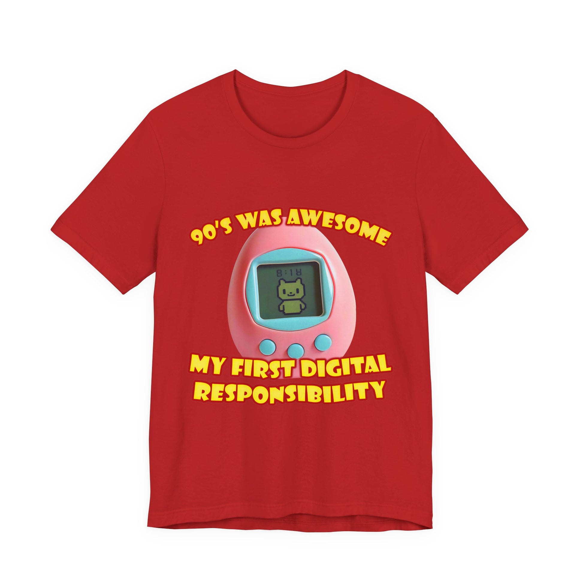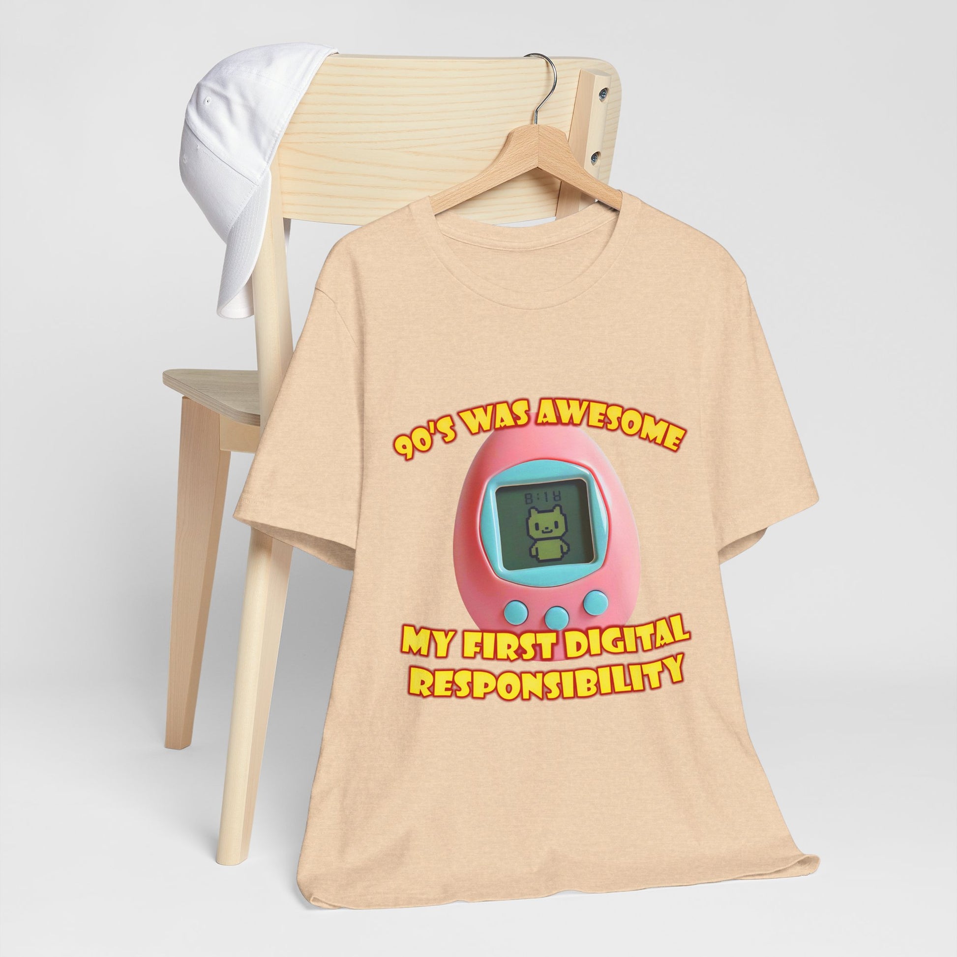 Przed pojawieniem się smartfonów mieliśmy pikselowe zwierzaki, którymi trzeba było się opiekować. Retro cyfrowa grafika zwierzaka z napisem „Moja pierwsza cyfrowa odpowiedzialność” oddaje nocne piknięcia, mały jajowaty ekran i panikę, gdy zapomnisz nakarmić wirtualnego przyjaciela. Czysty klimat lat 90. z serii „90s Was Awesome”.