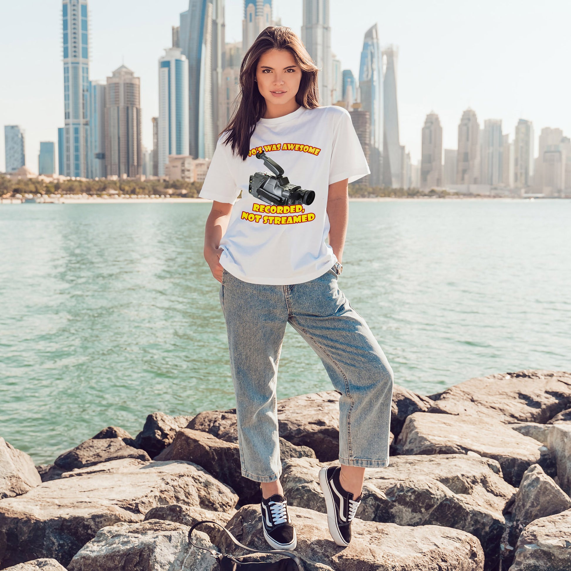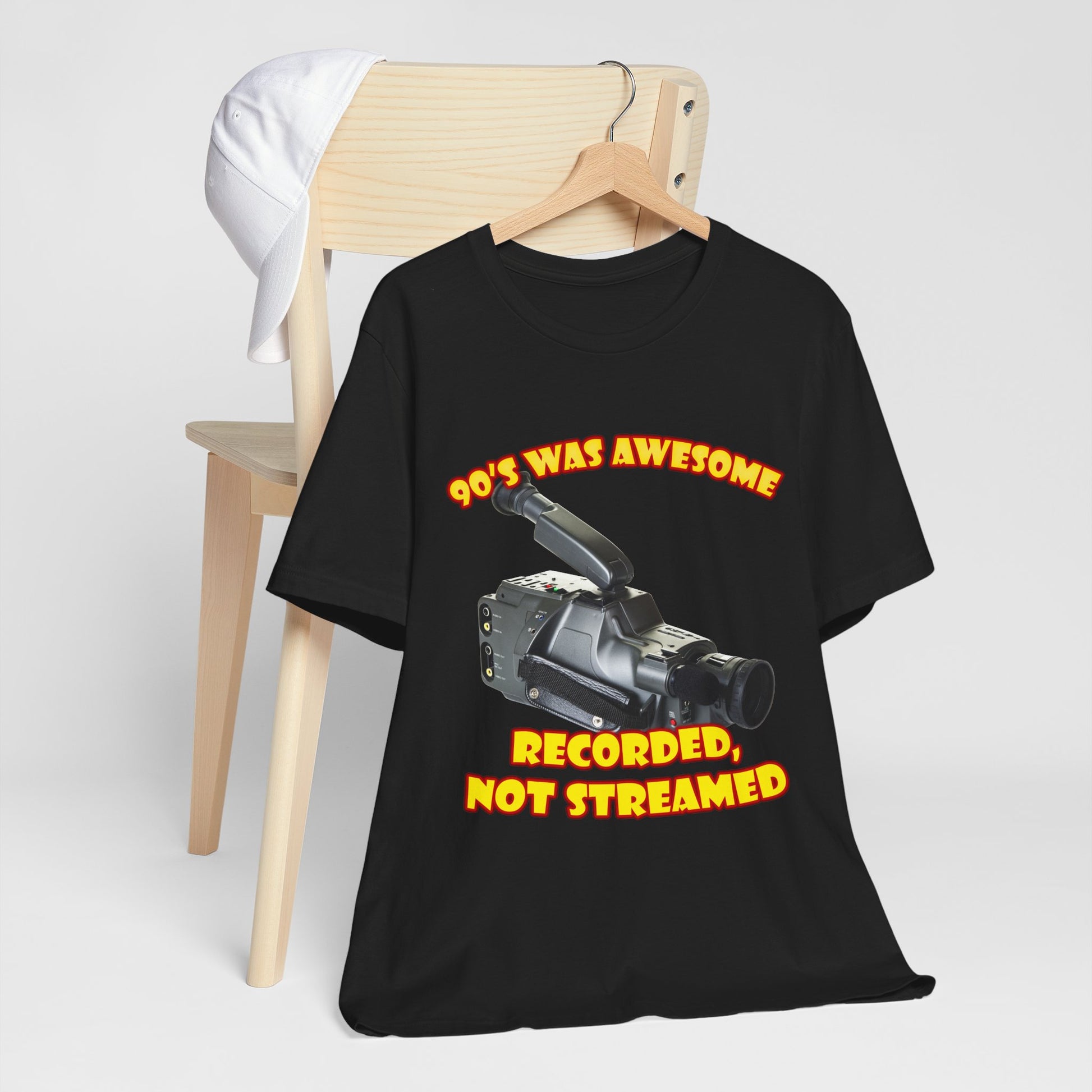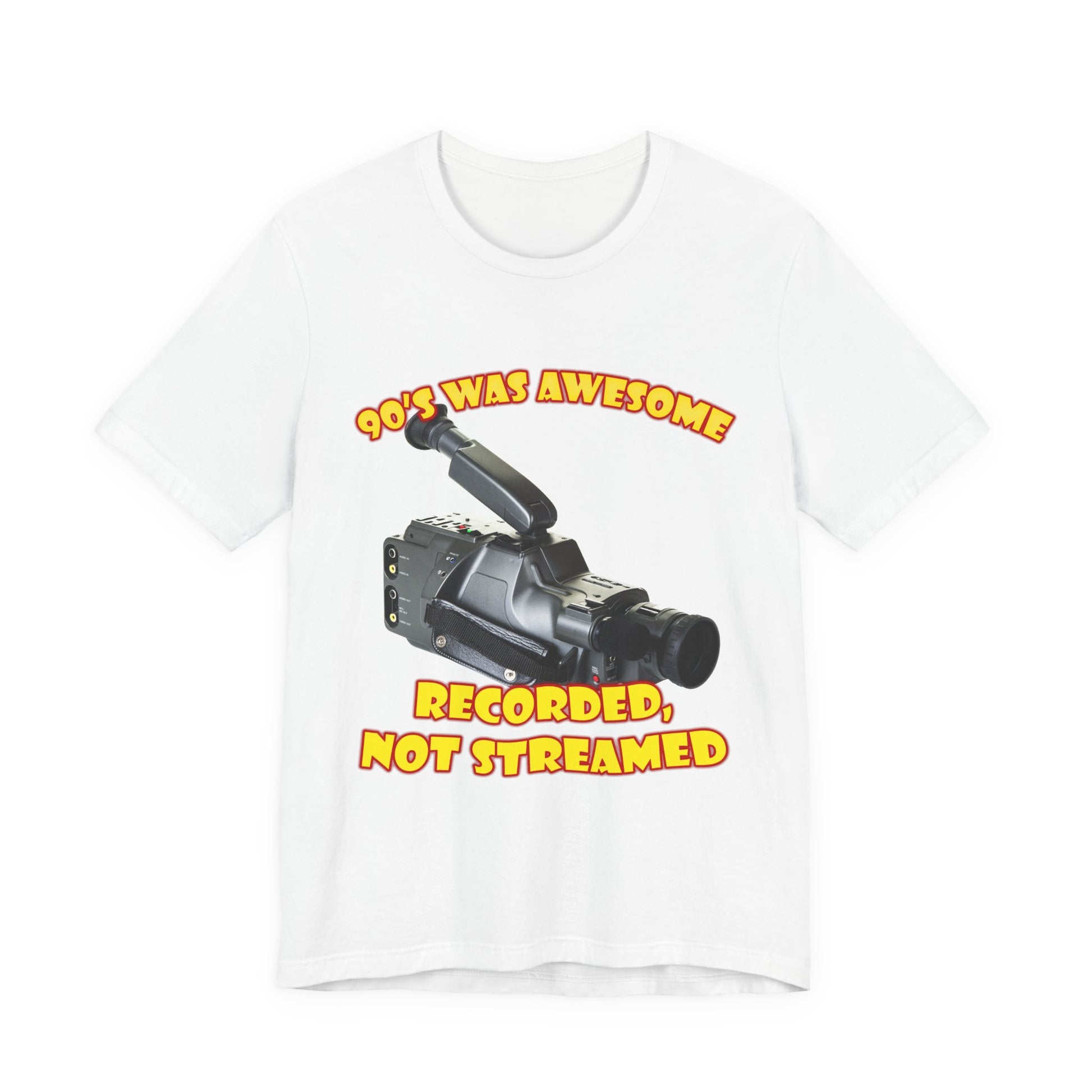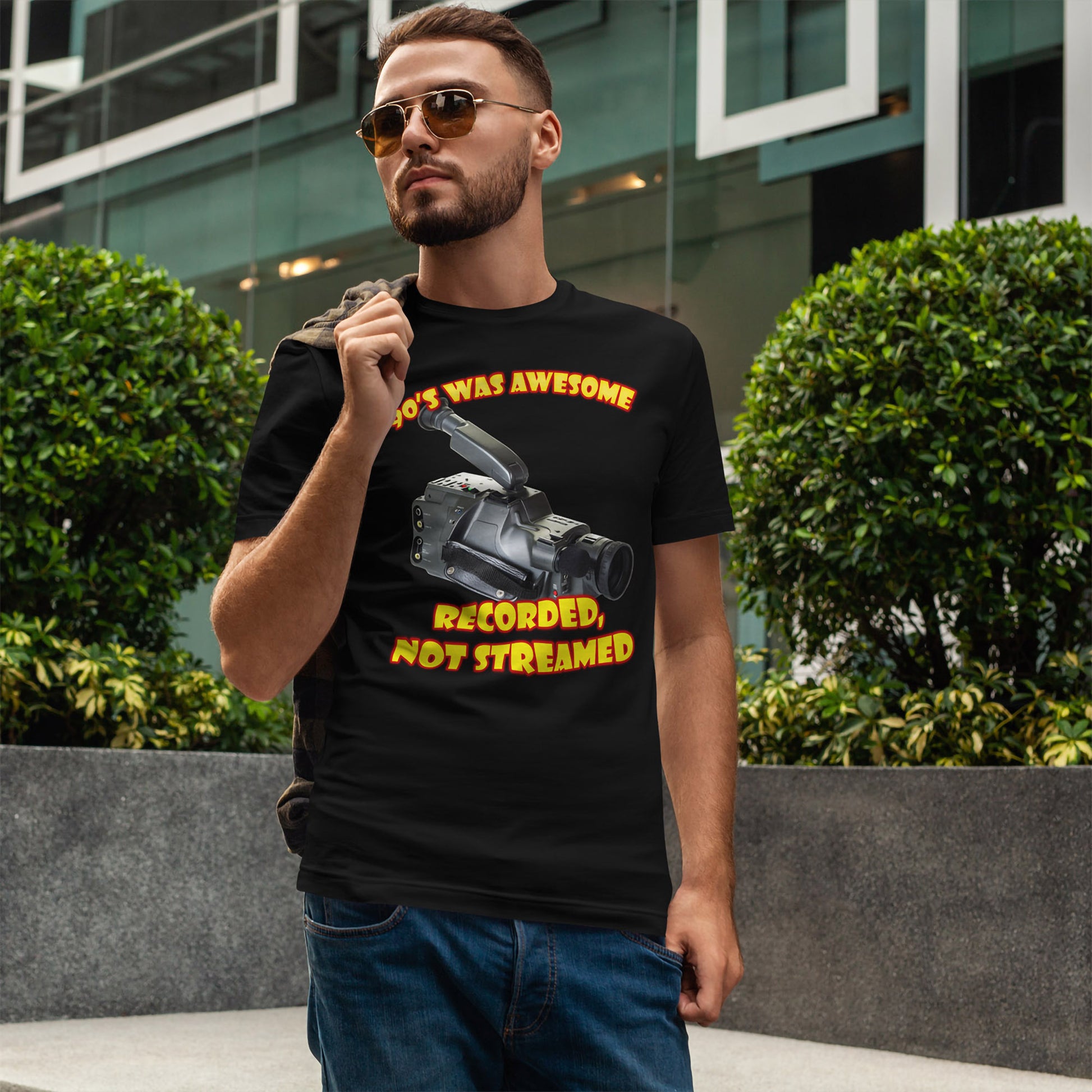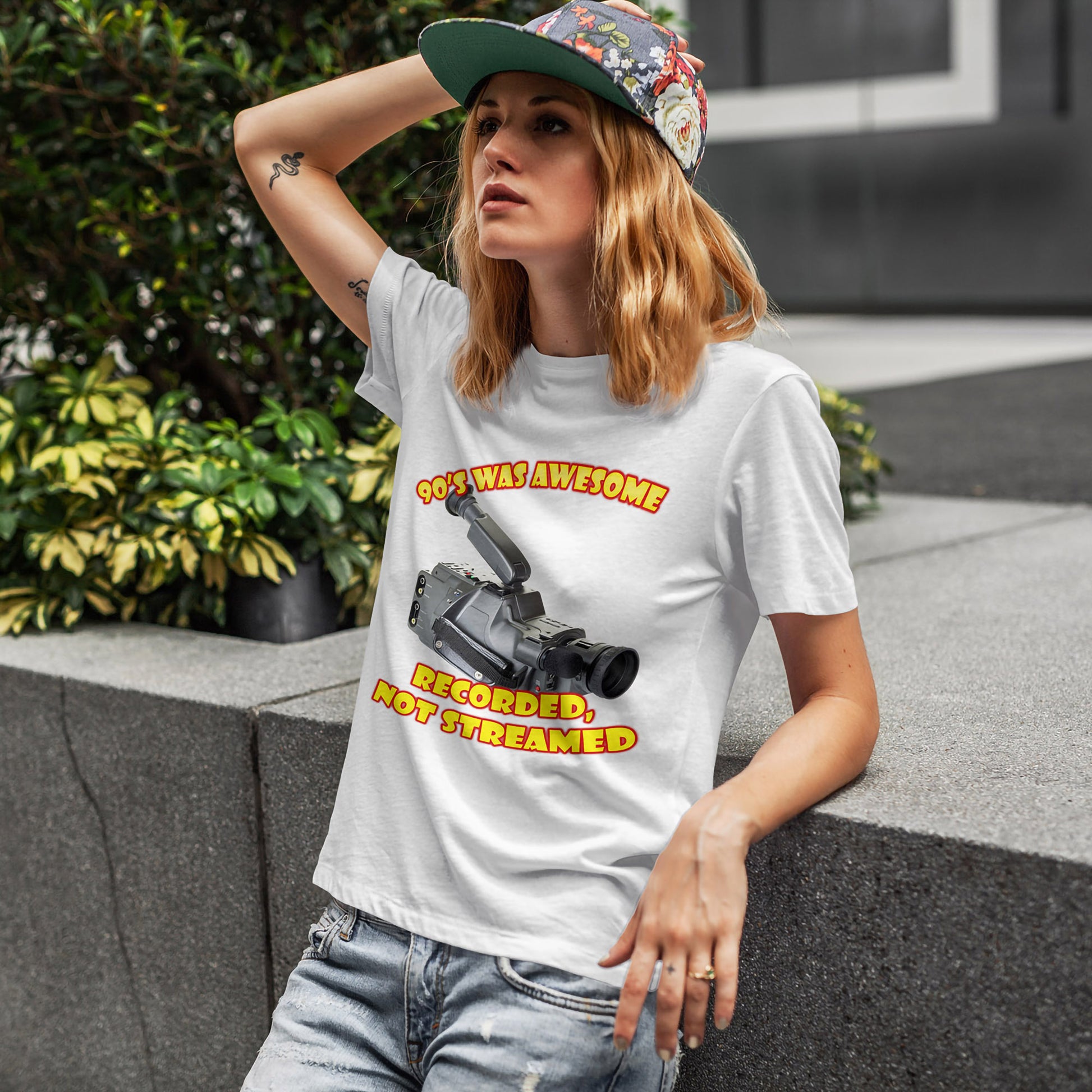 Koszulka z napisem „Nagrano, nie przeskanowano” – koszulka z kamerą z lat 90.