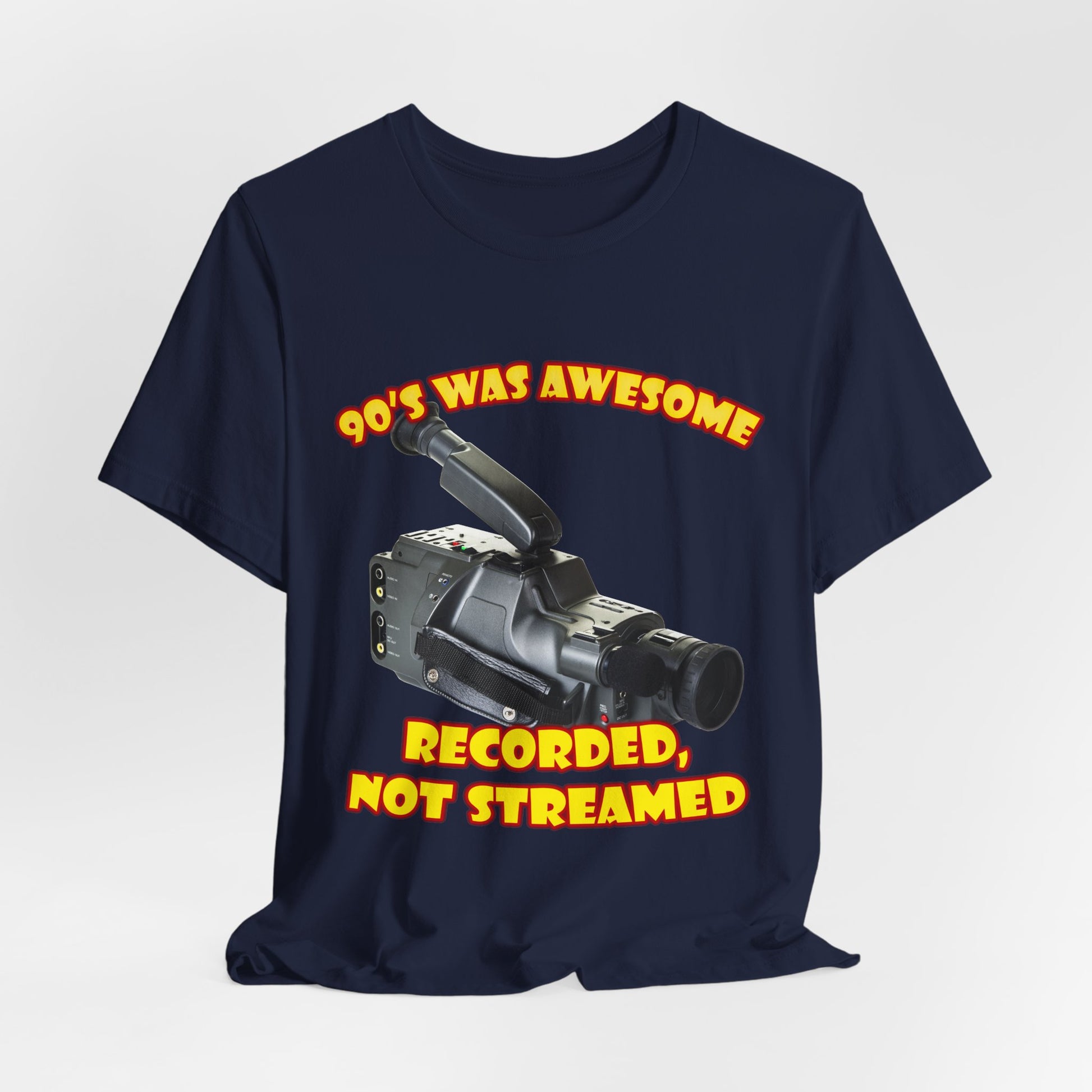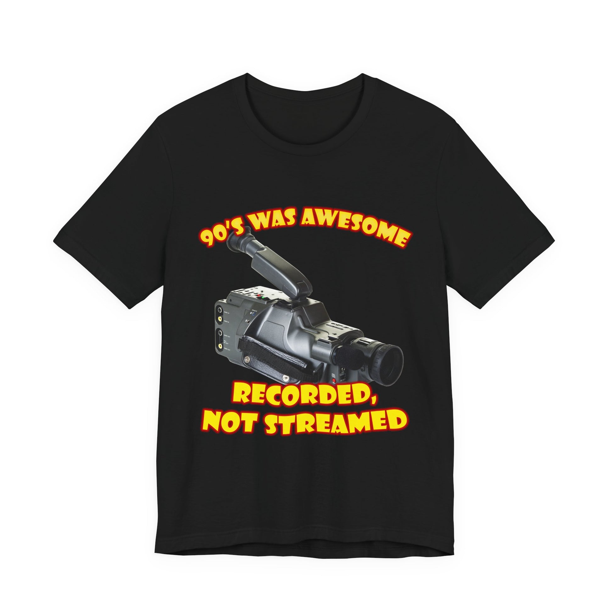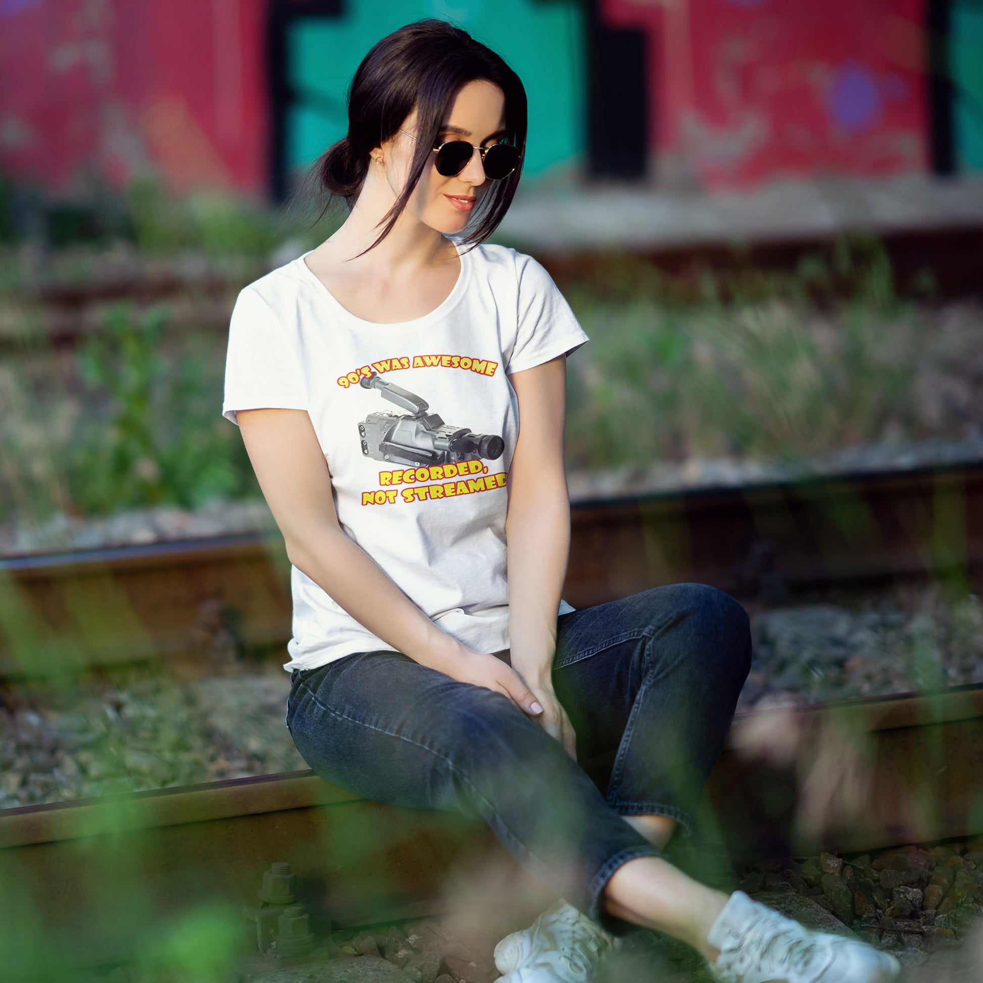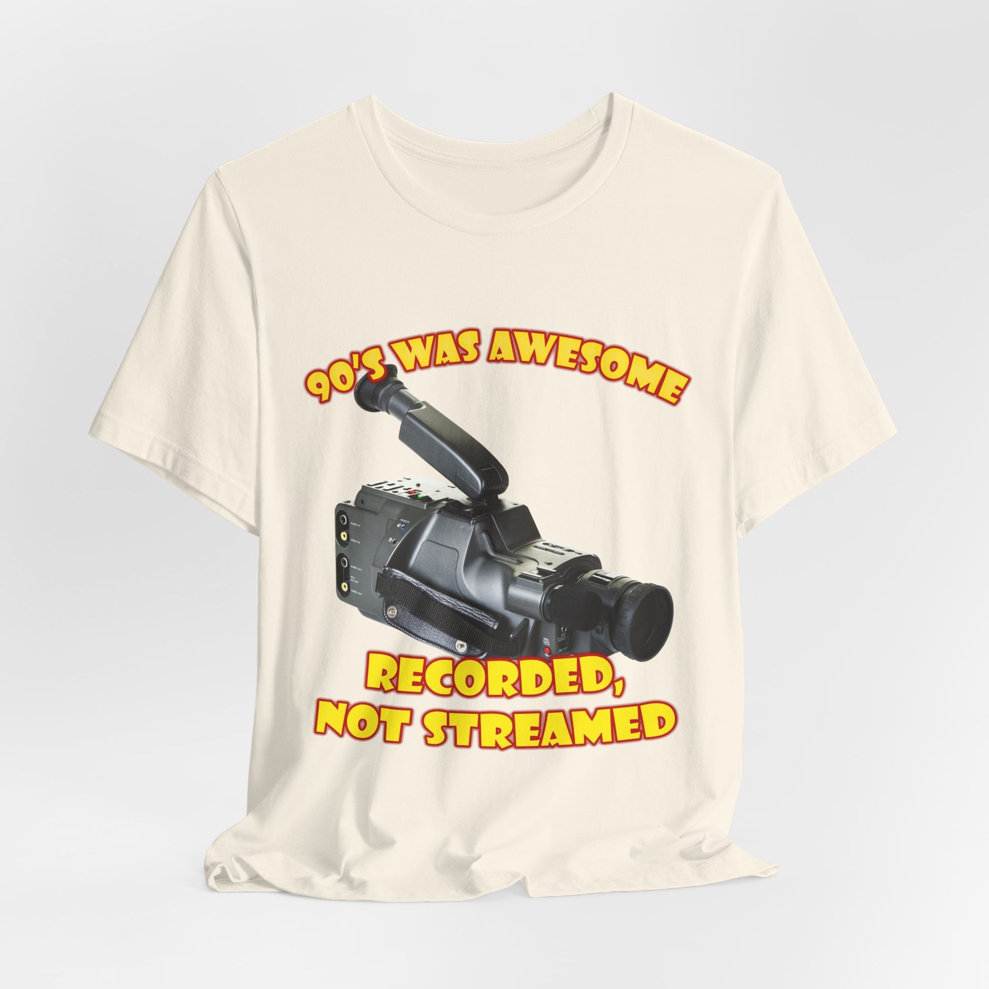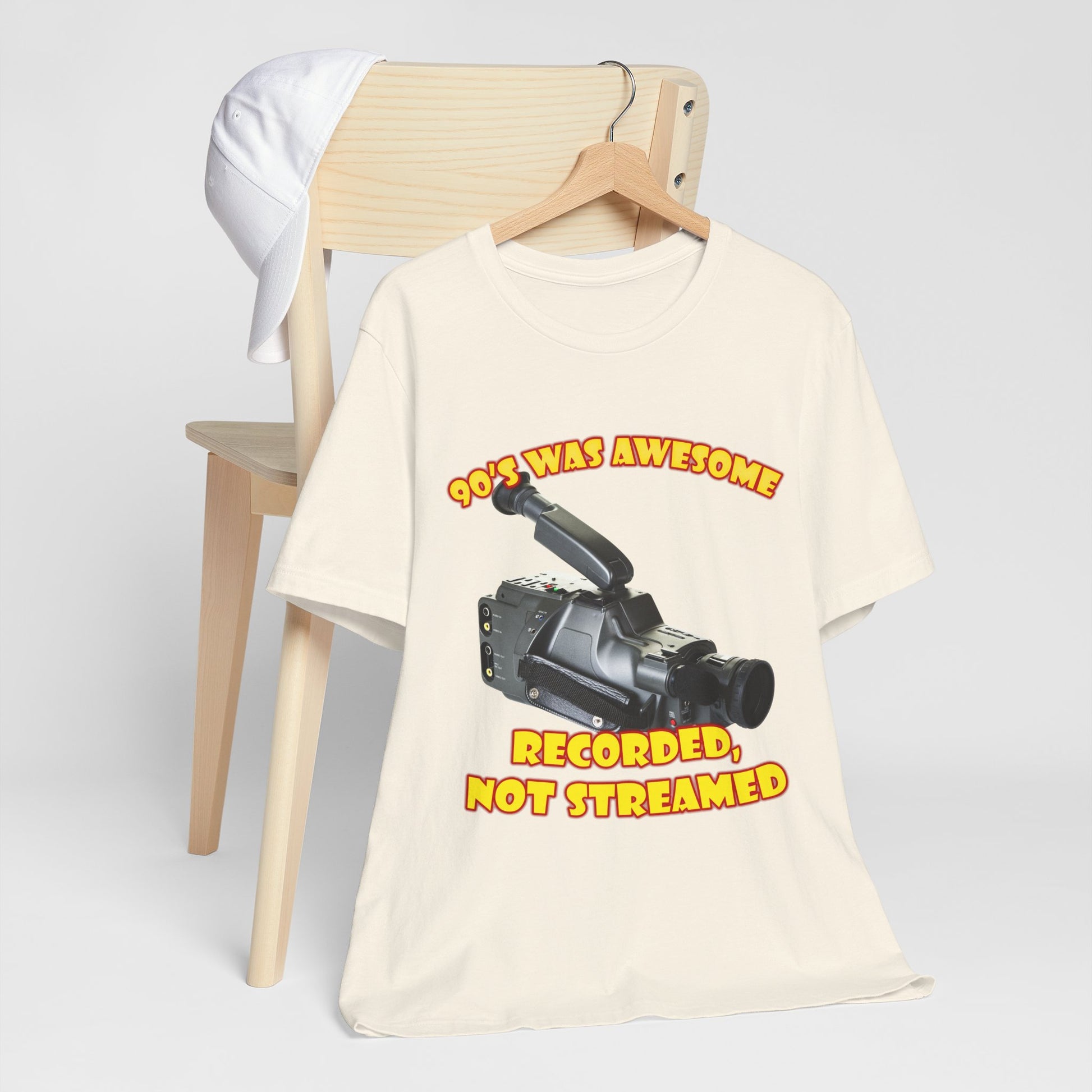 Koszulka z napisem „Nagrano, nie przeskanowano” – koszulka z kamerą z lat 90.