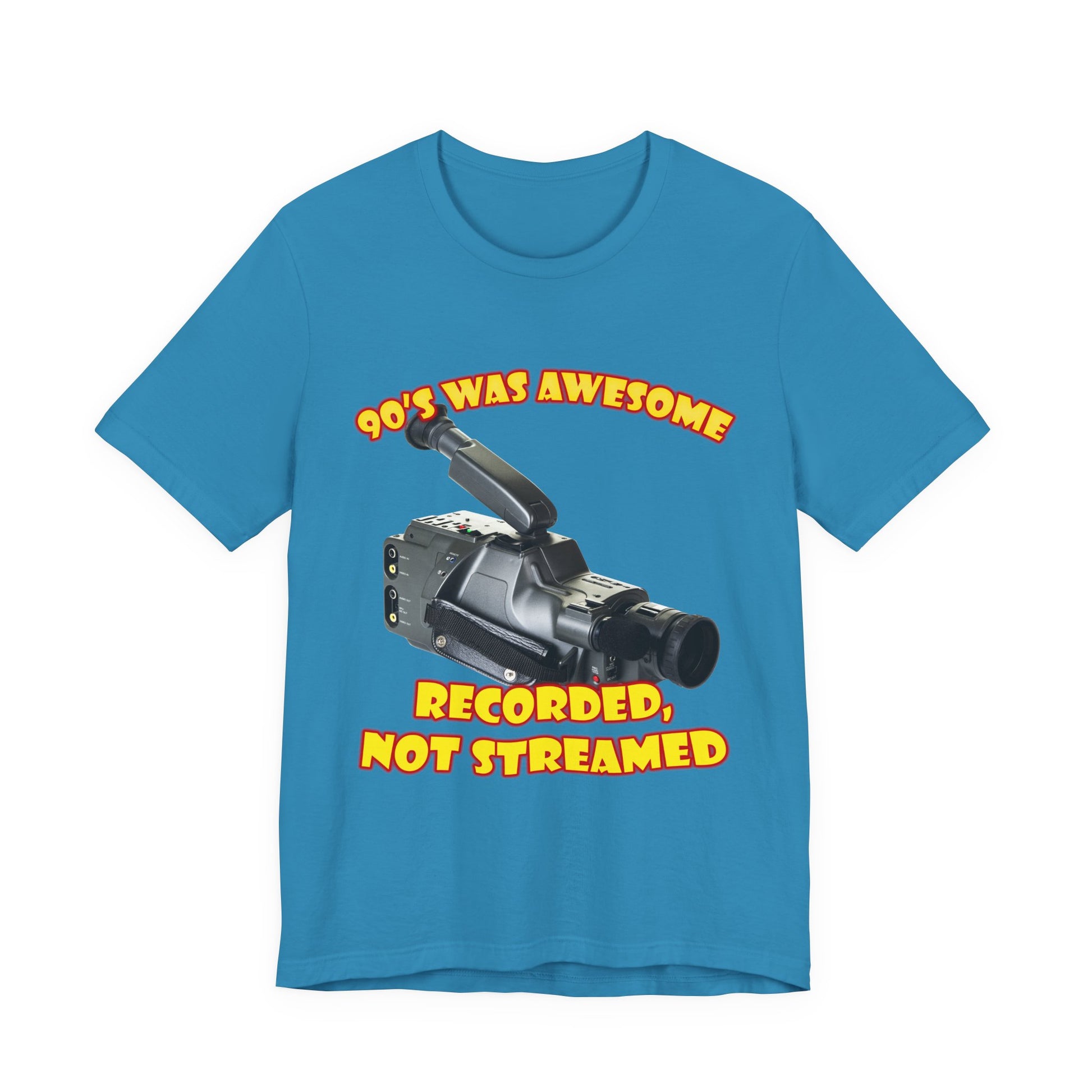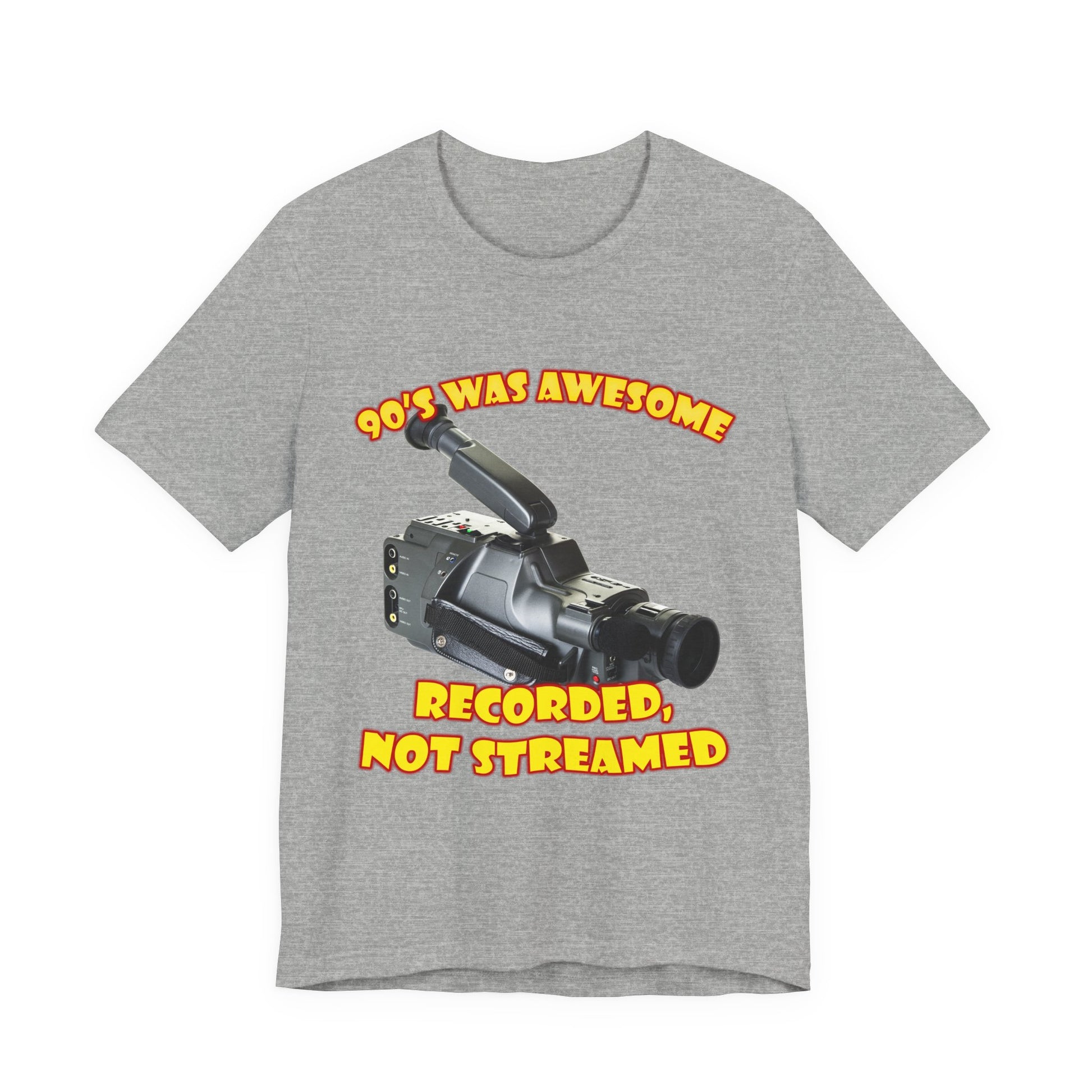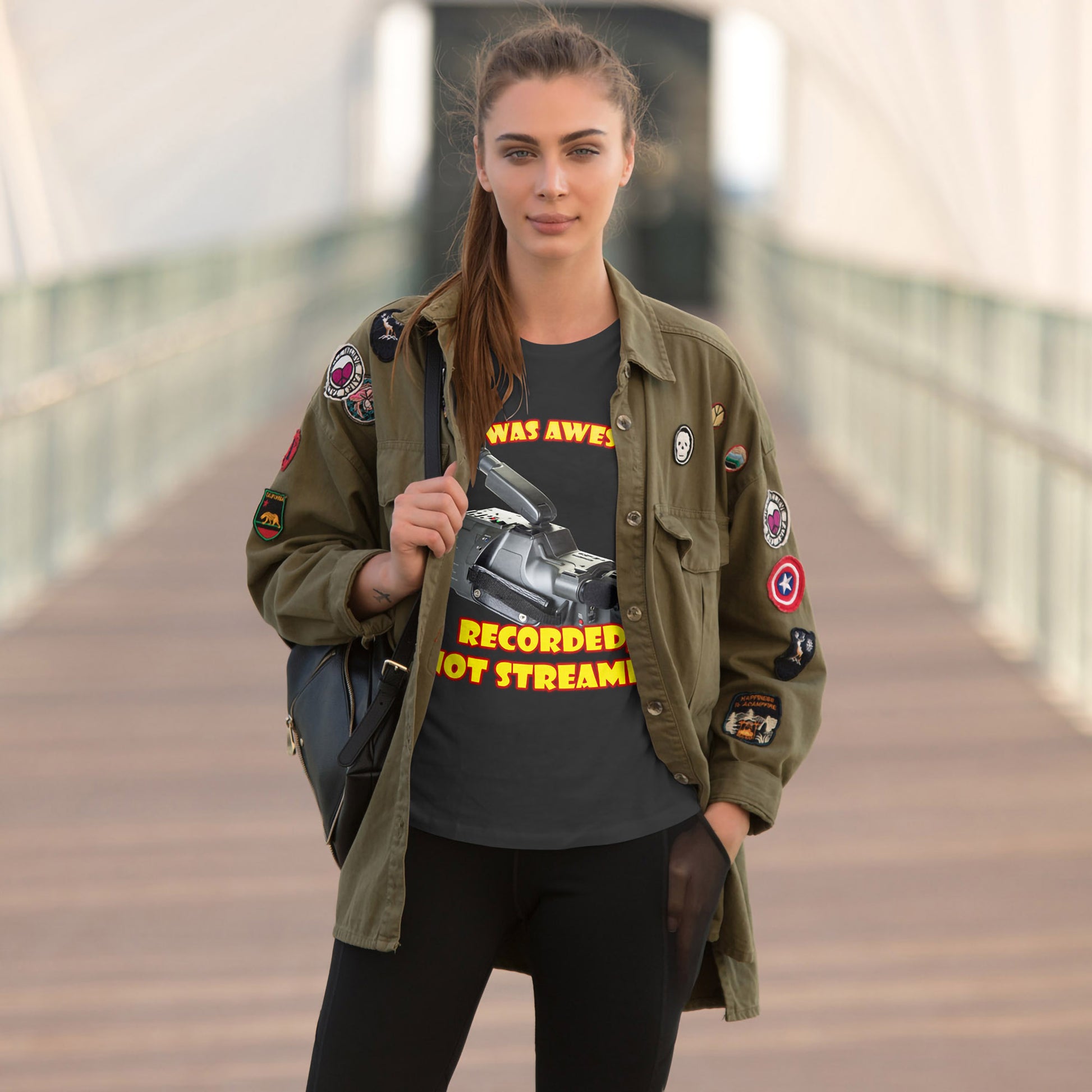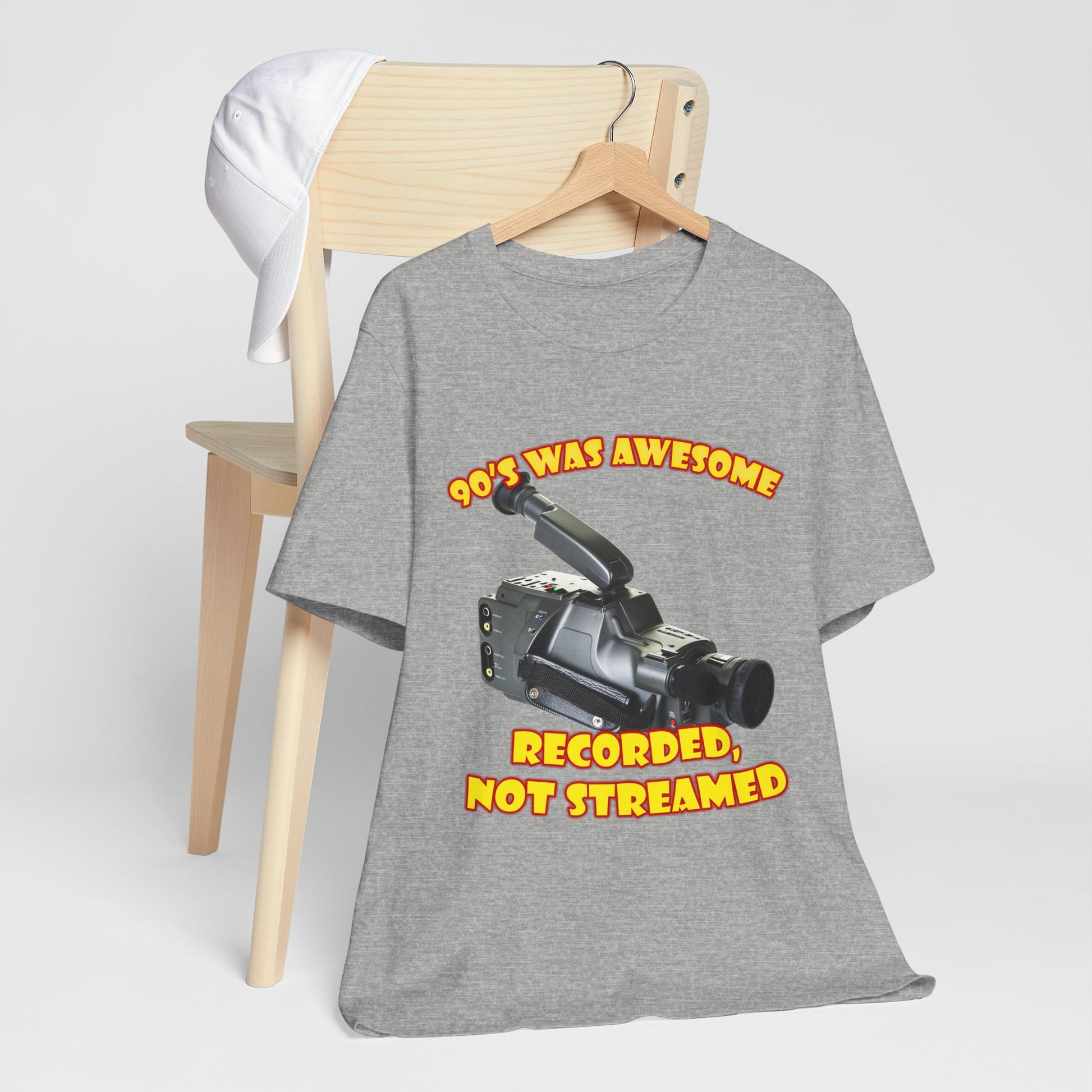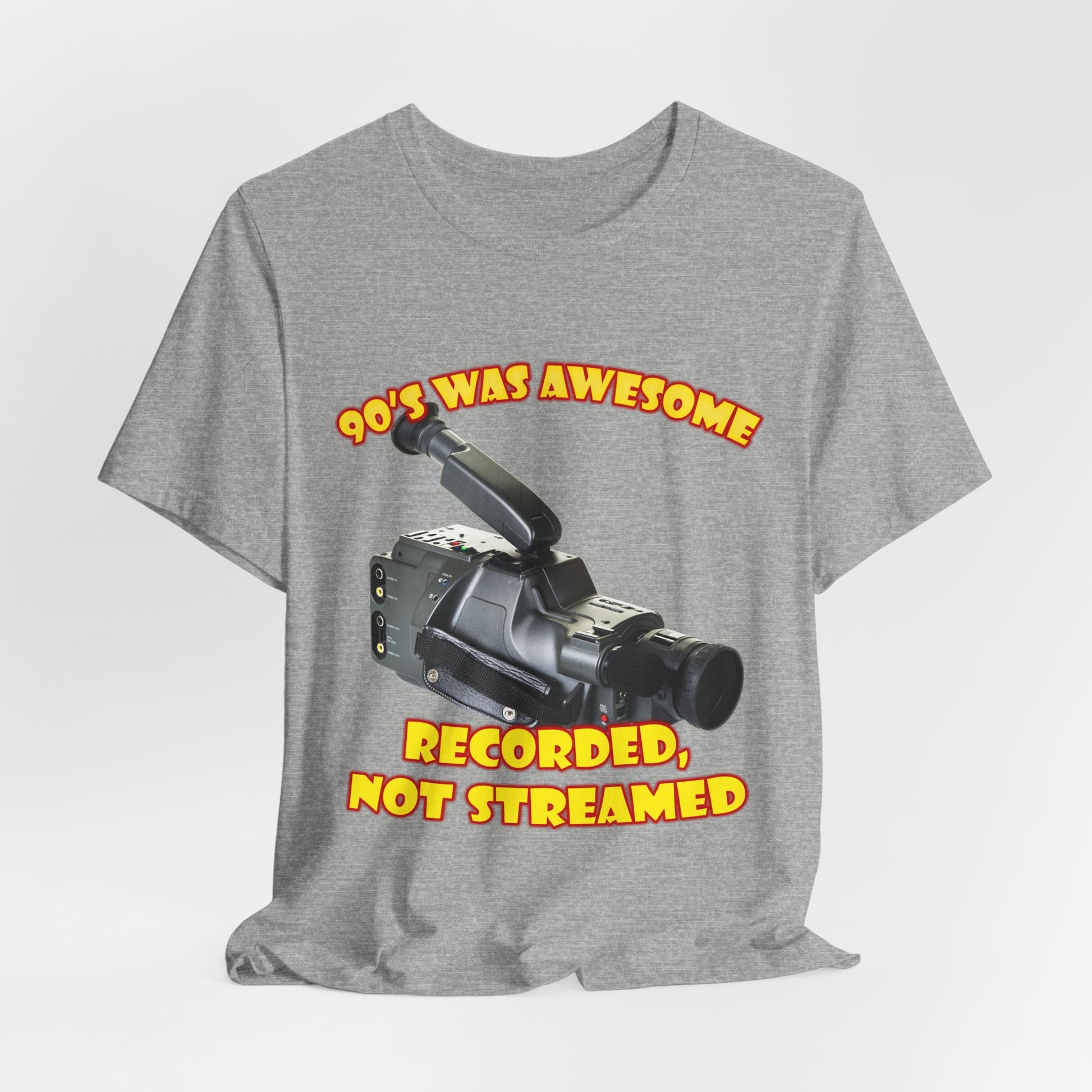 Koszulka z napisem „Nagrano, nie przeskanowano” – koszulka z kamerą z lat 90.