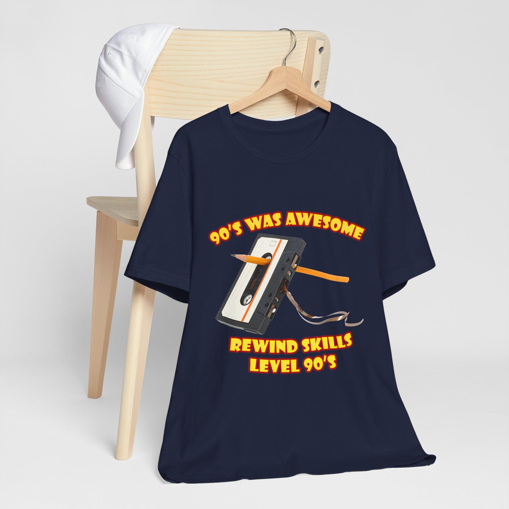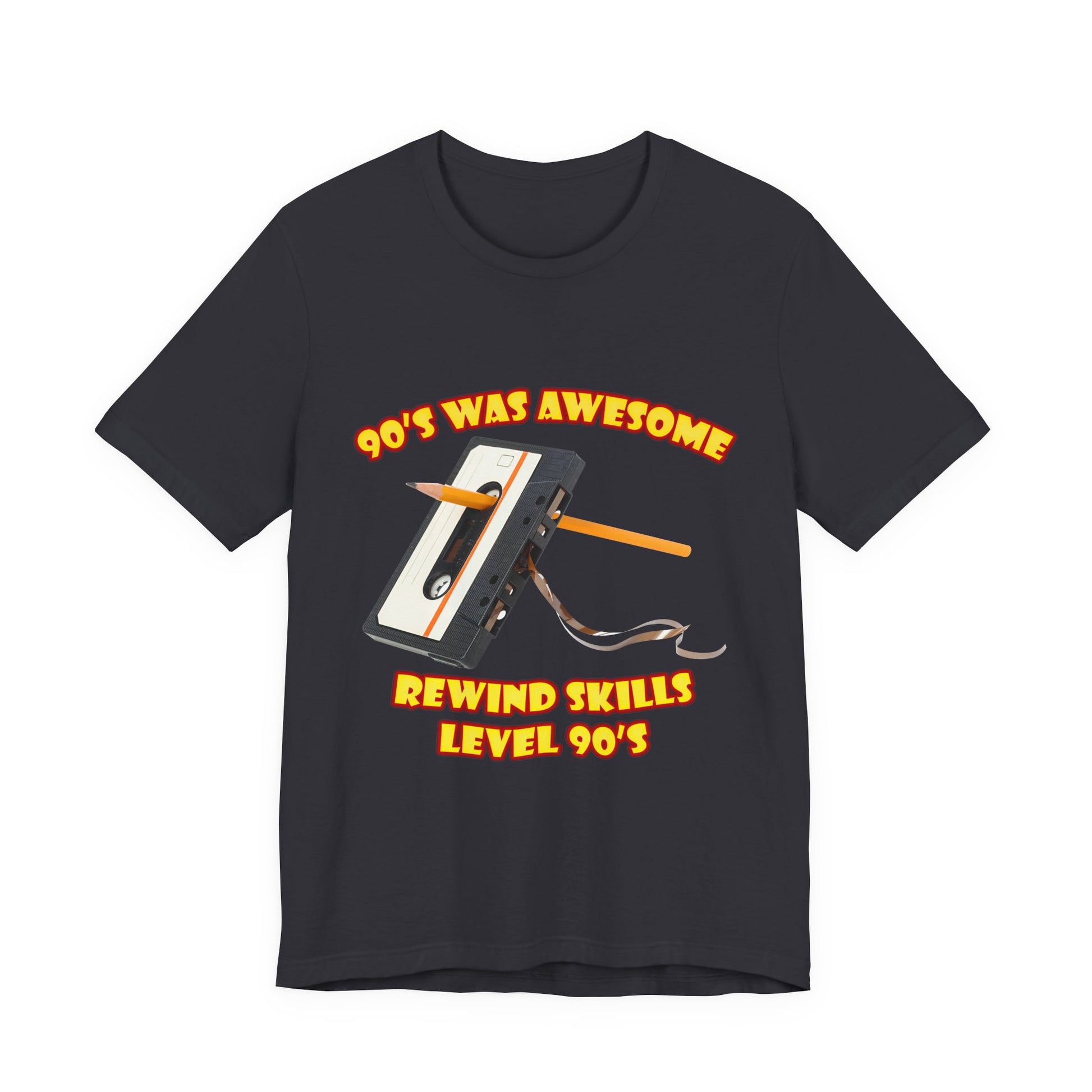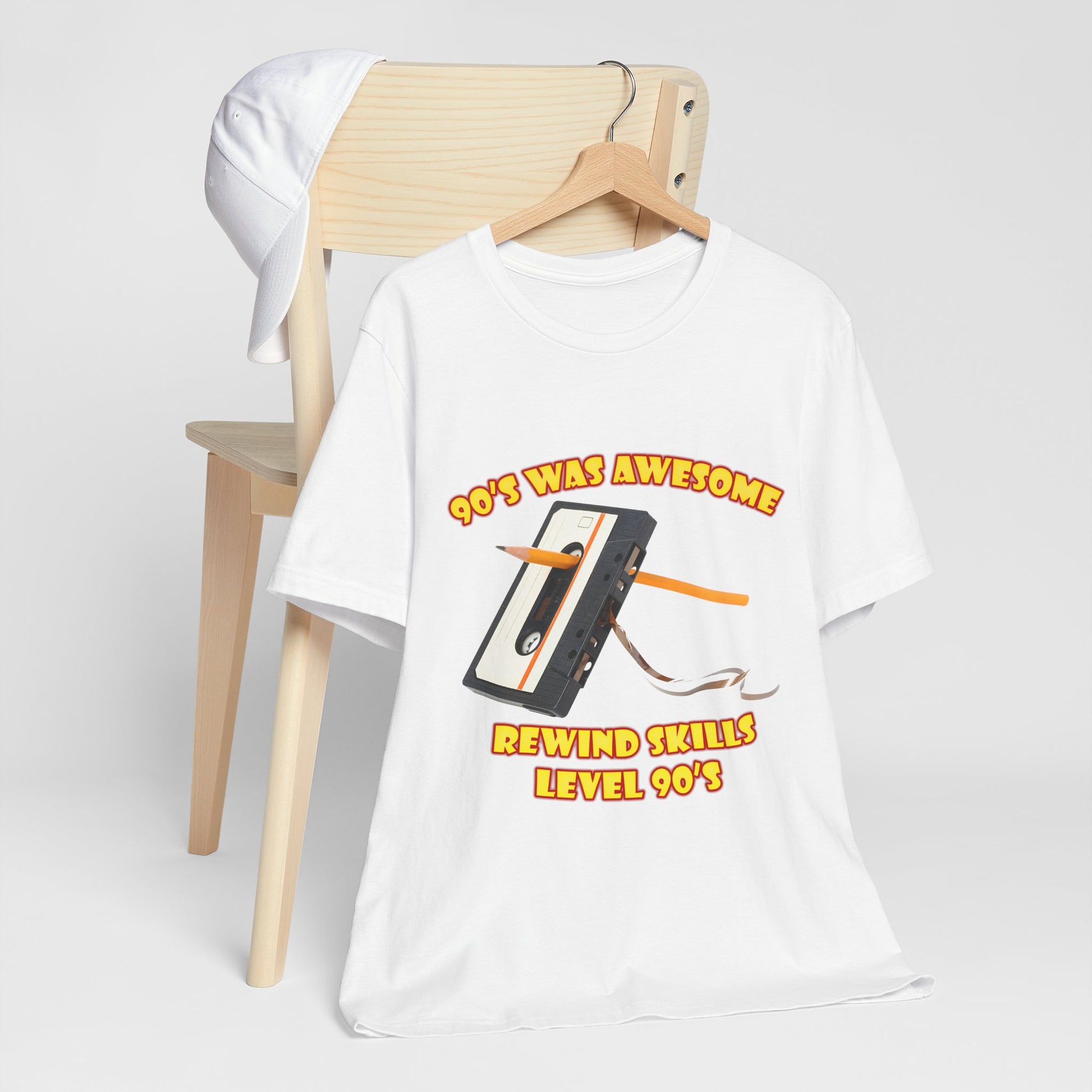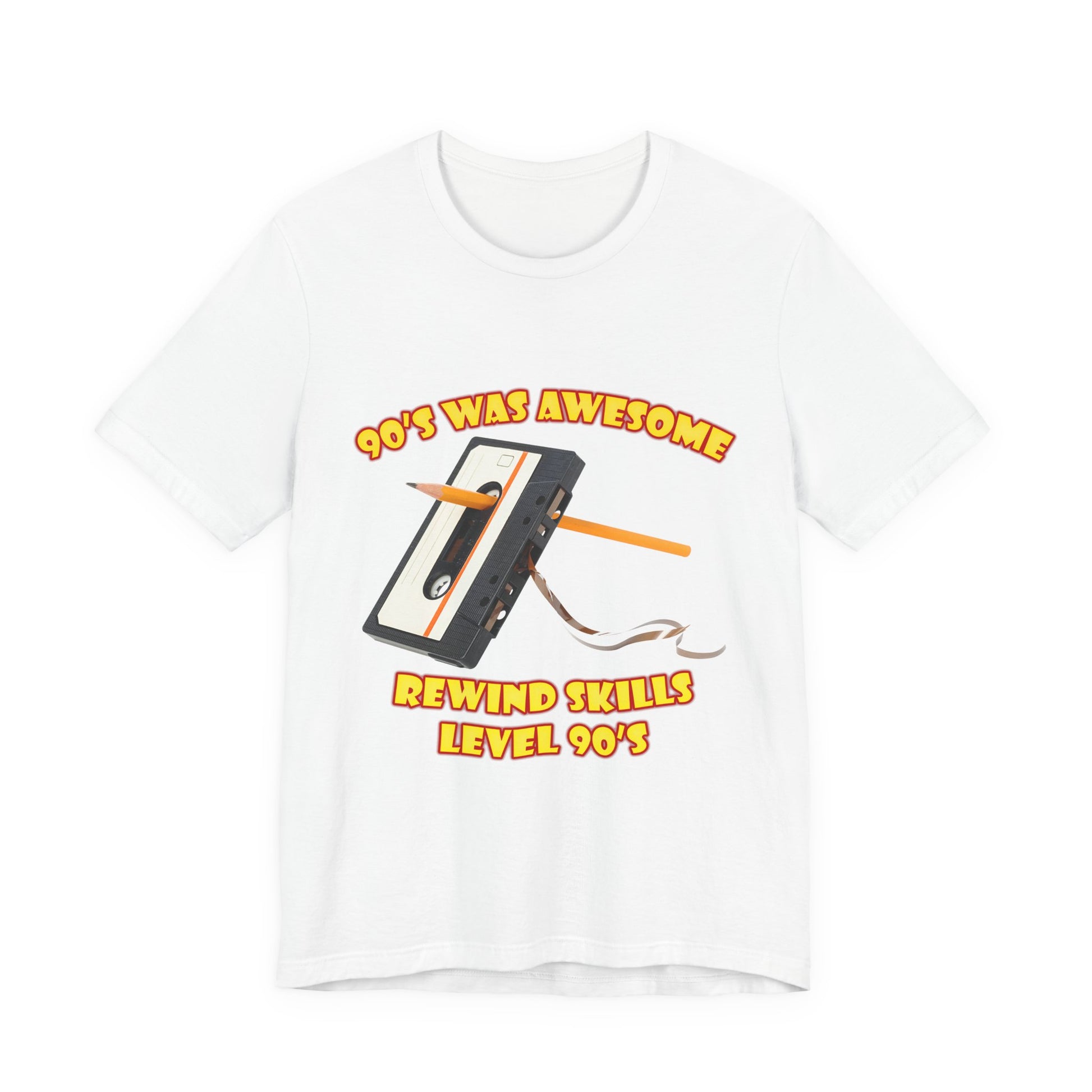 Koszulka z napisem „Rewind Skills Level 90s” – kaseta z ołówkiem