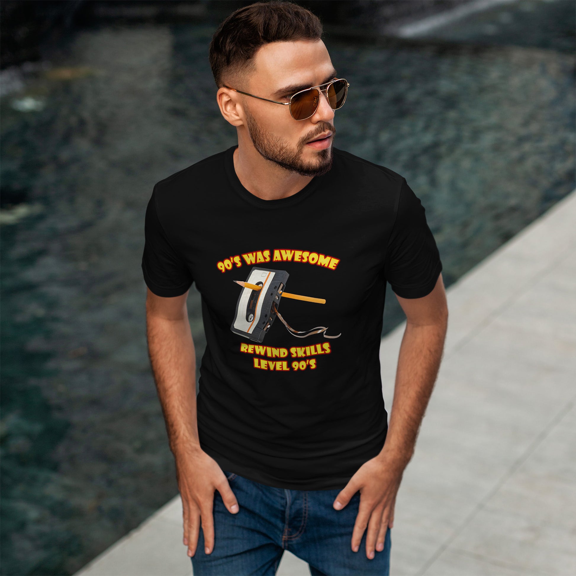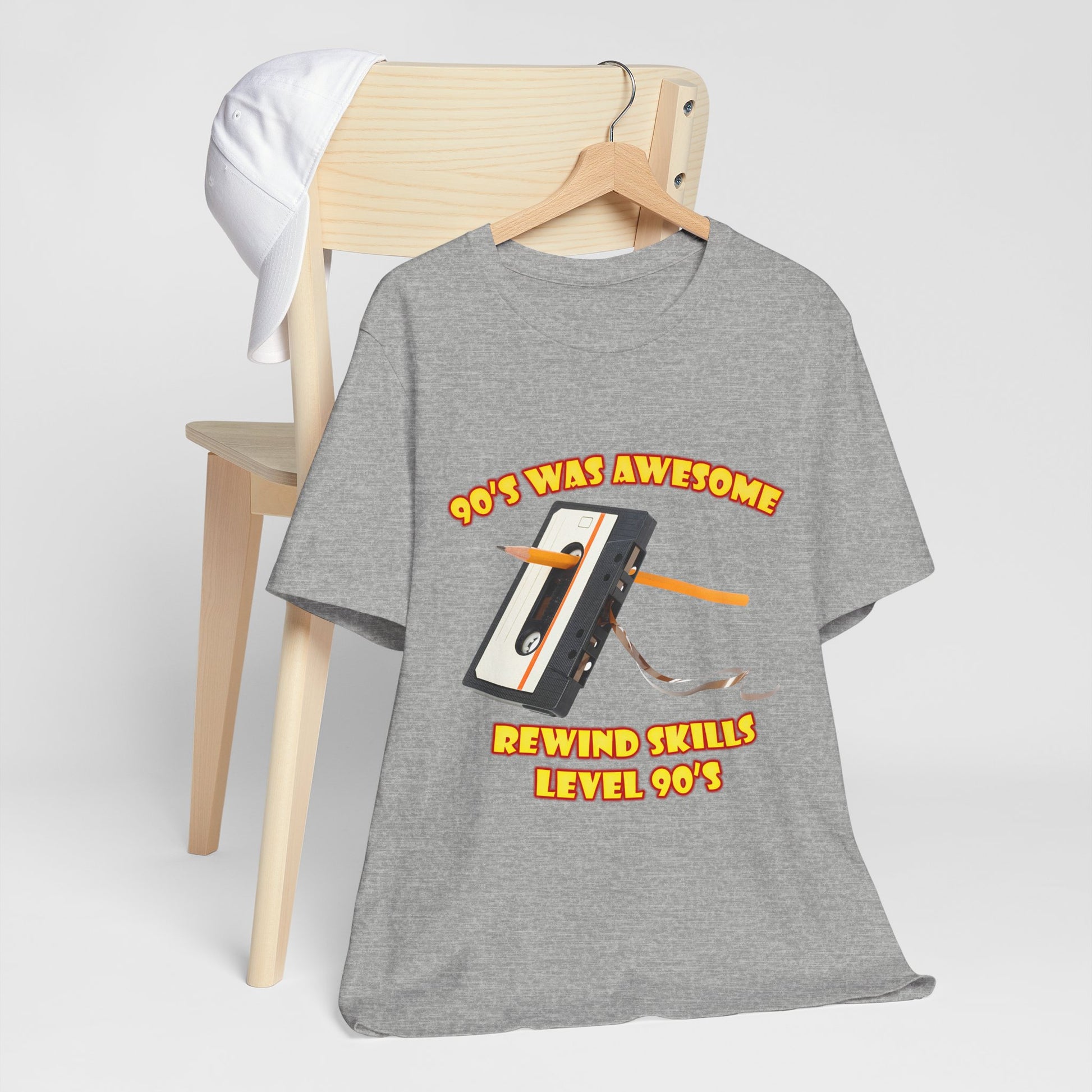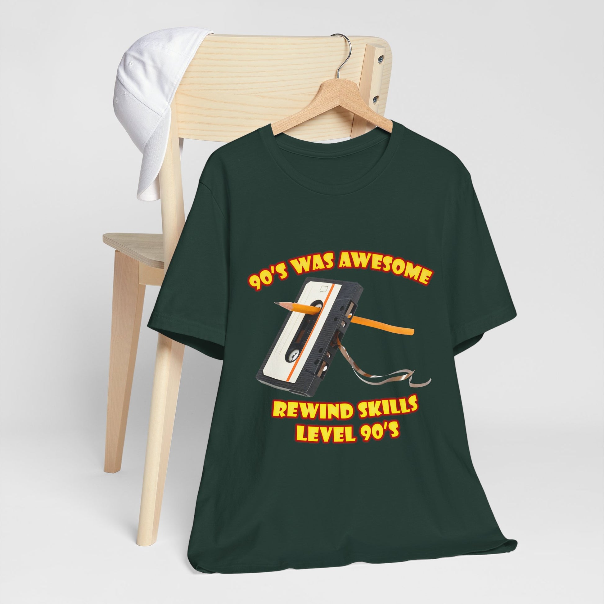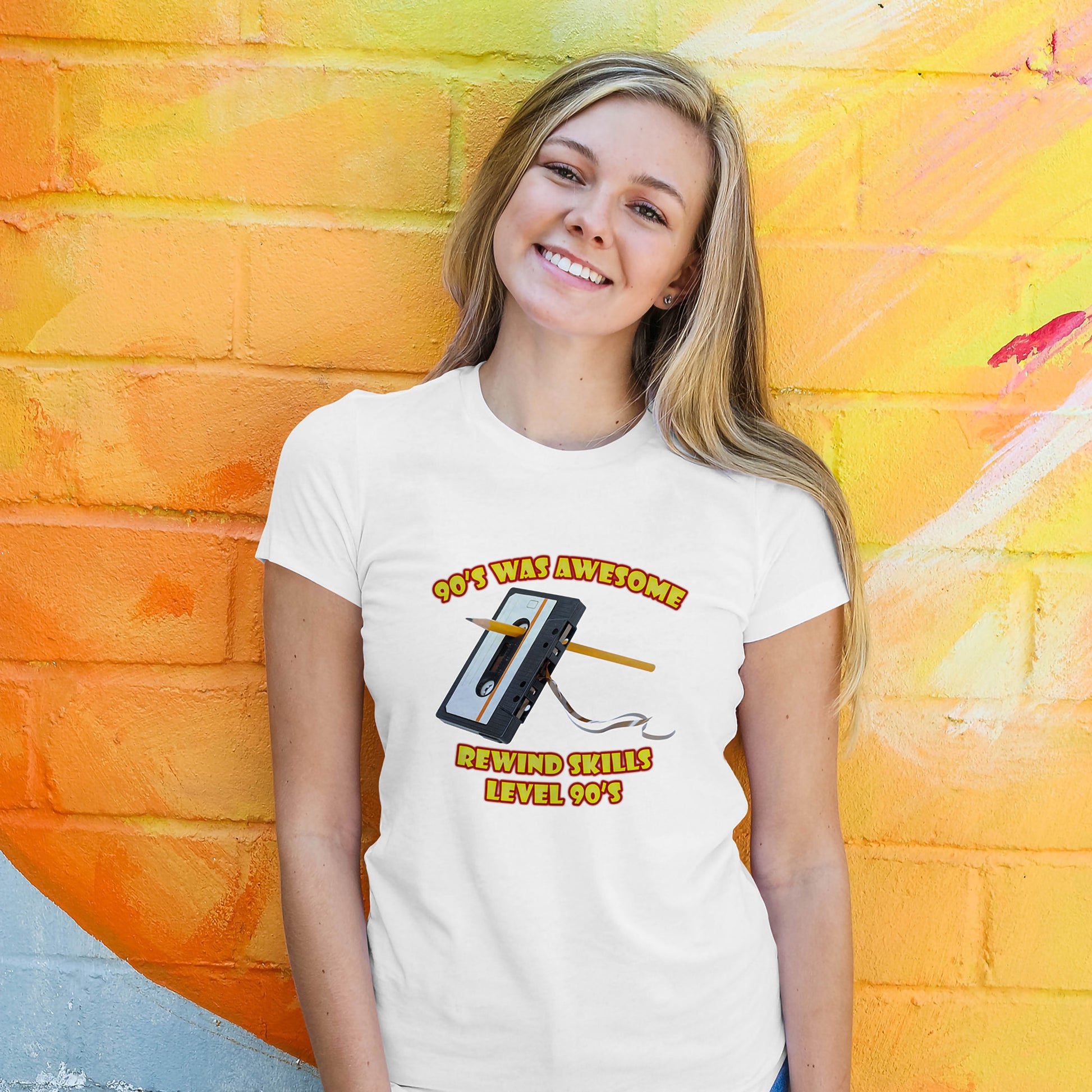 Koszulka z napisem „Rewind Skills Level 90s” – kaseta z ołówkiem