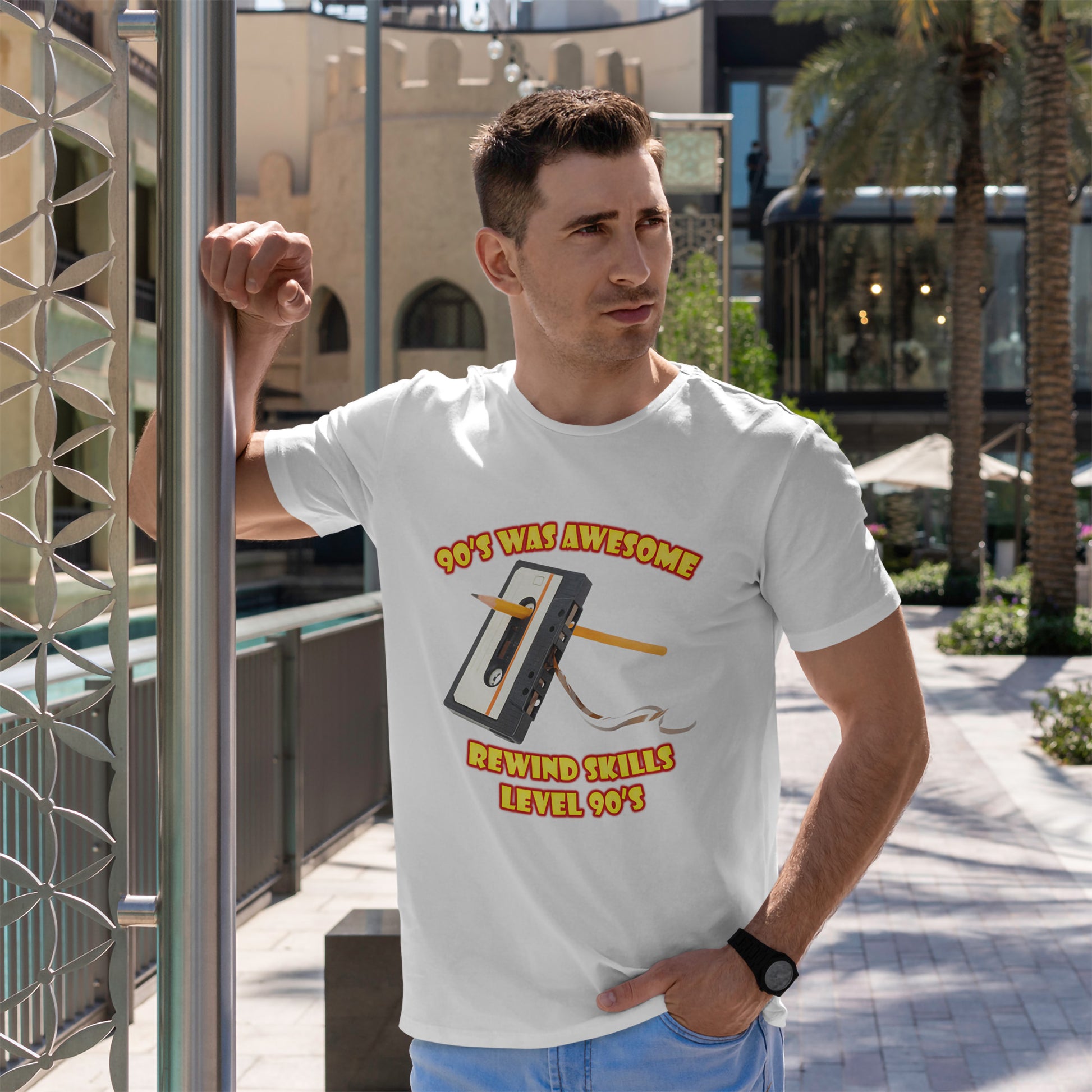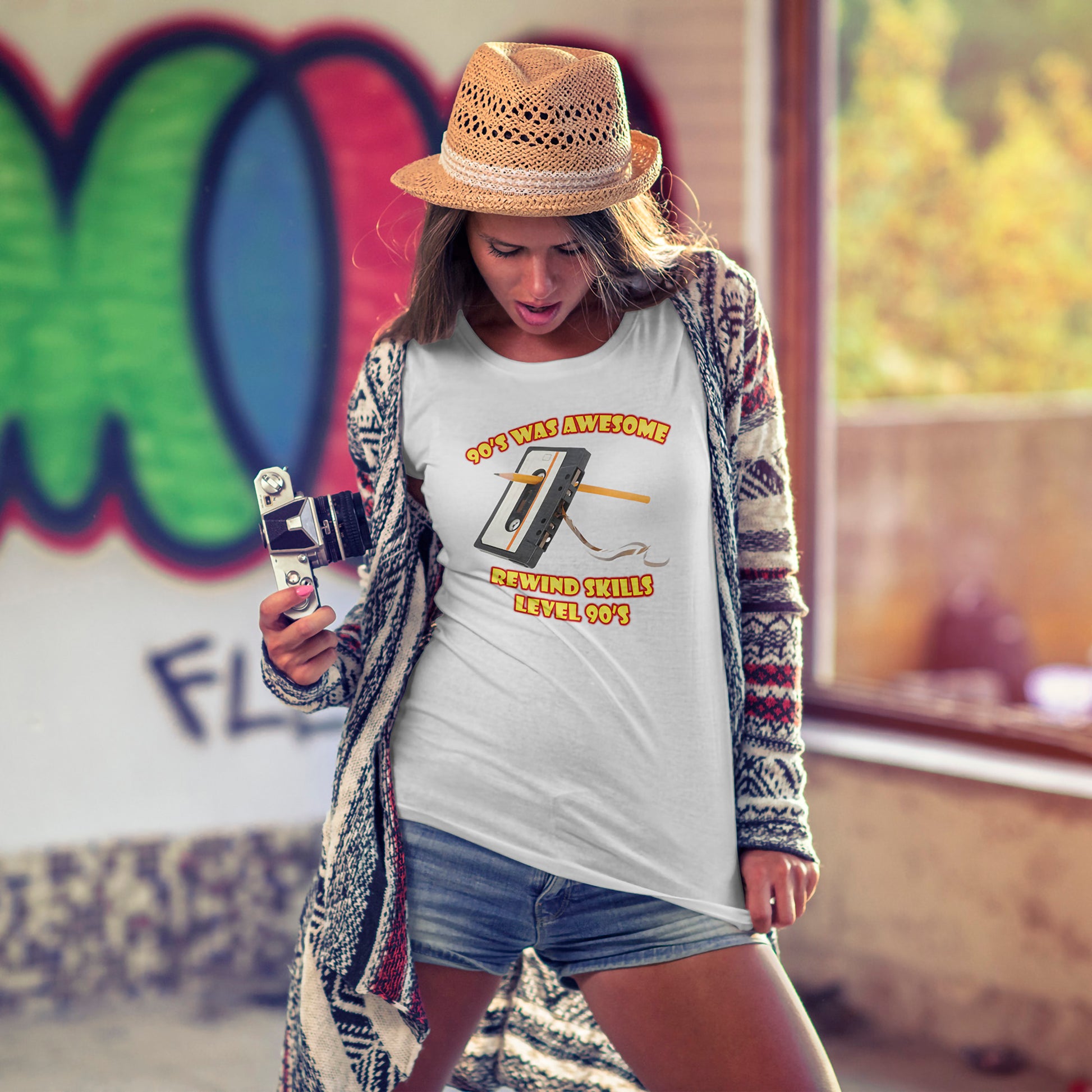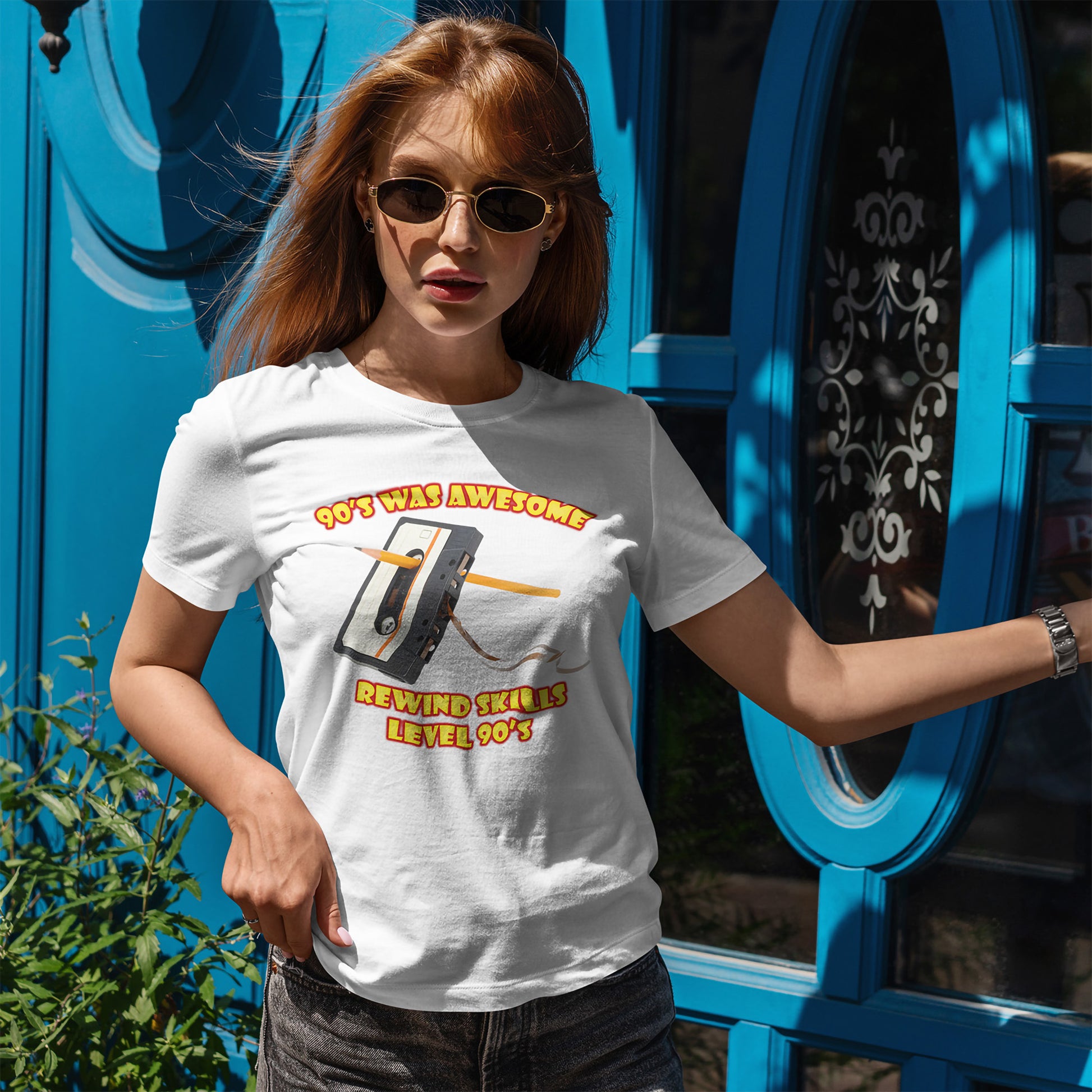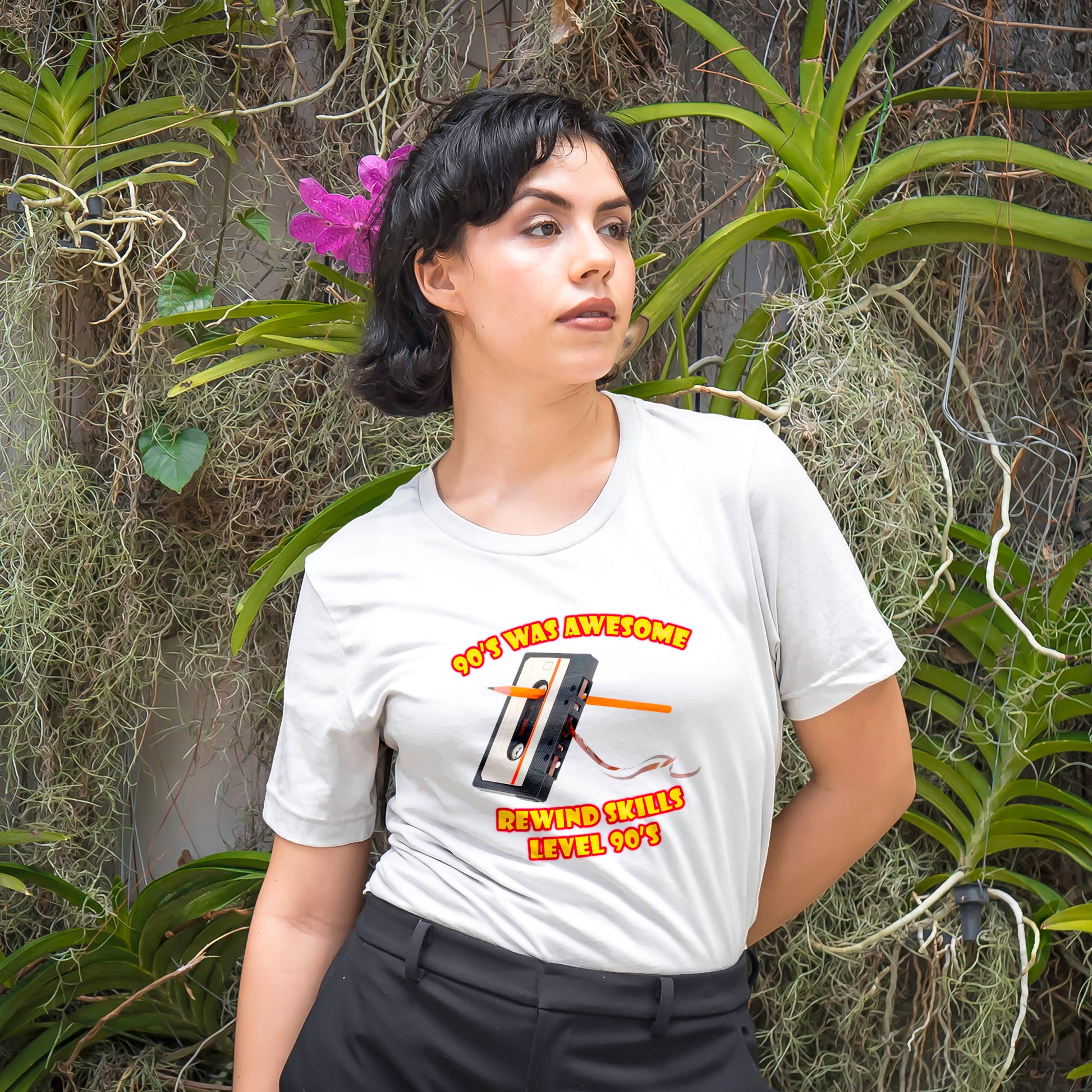 Koszulka z napisem „Rewind Skills Level 90s” – kaseta z ołówkiem
