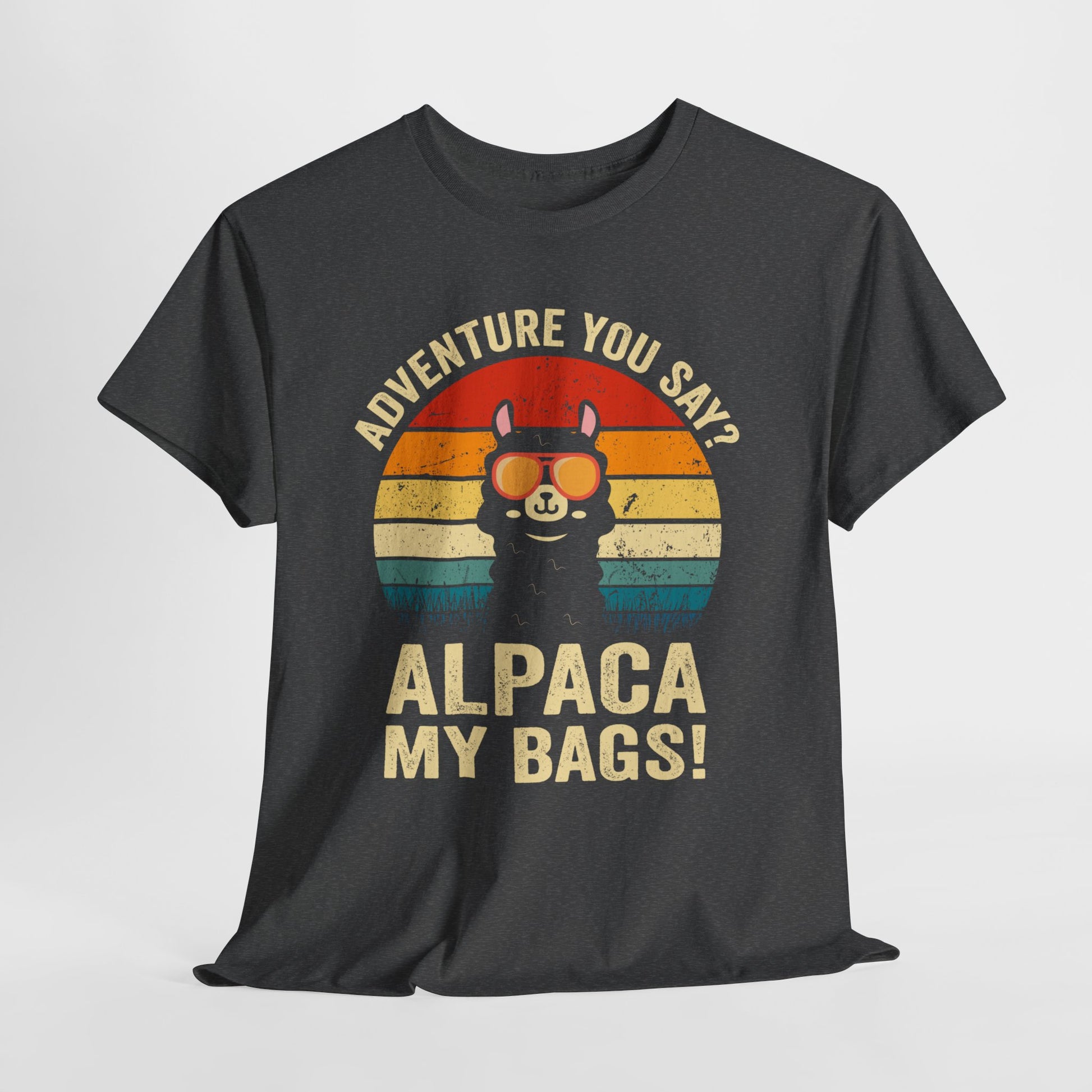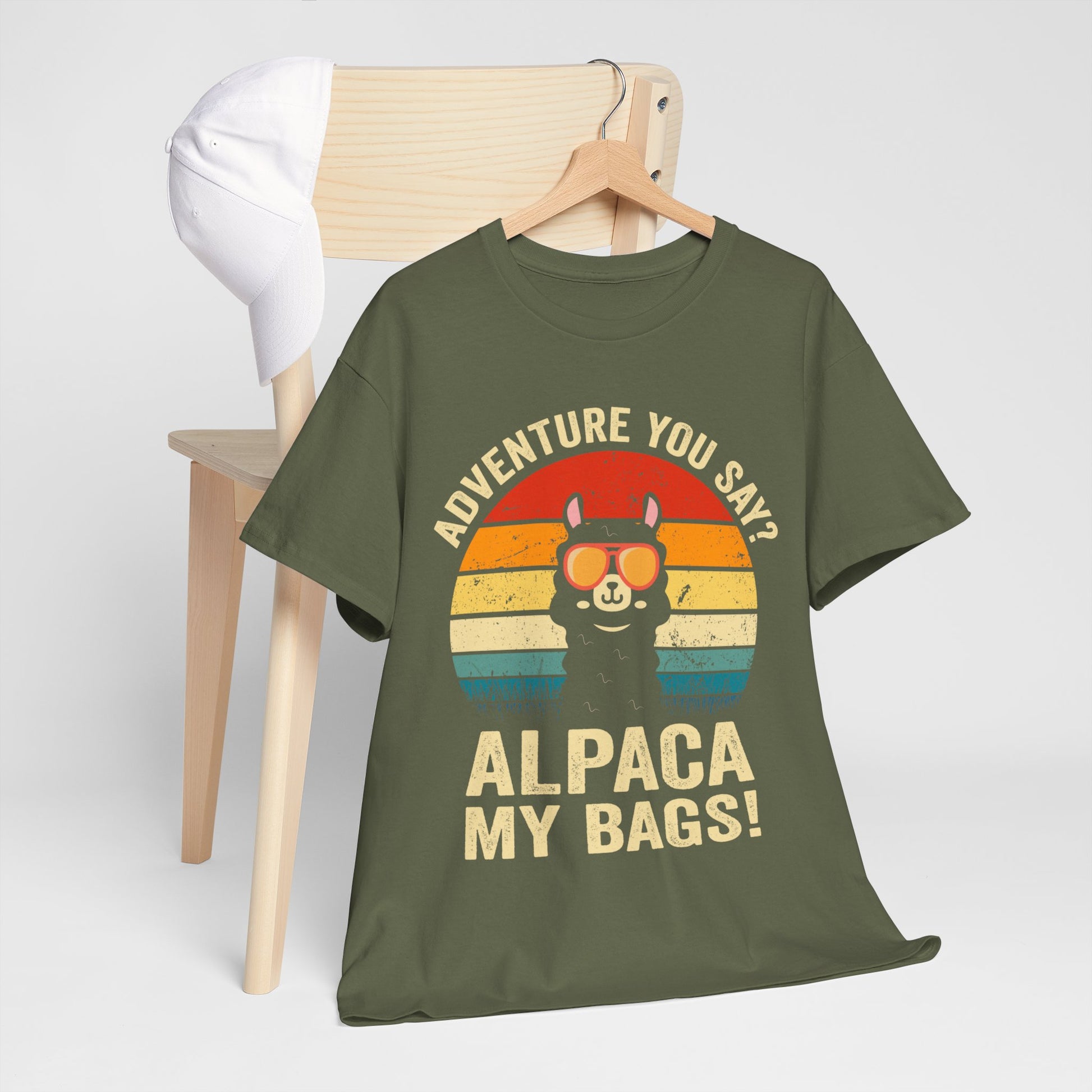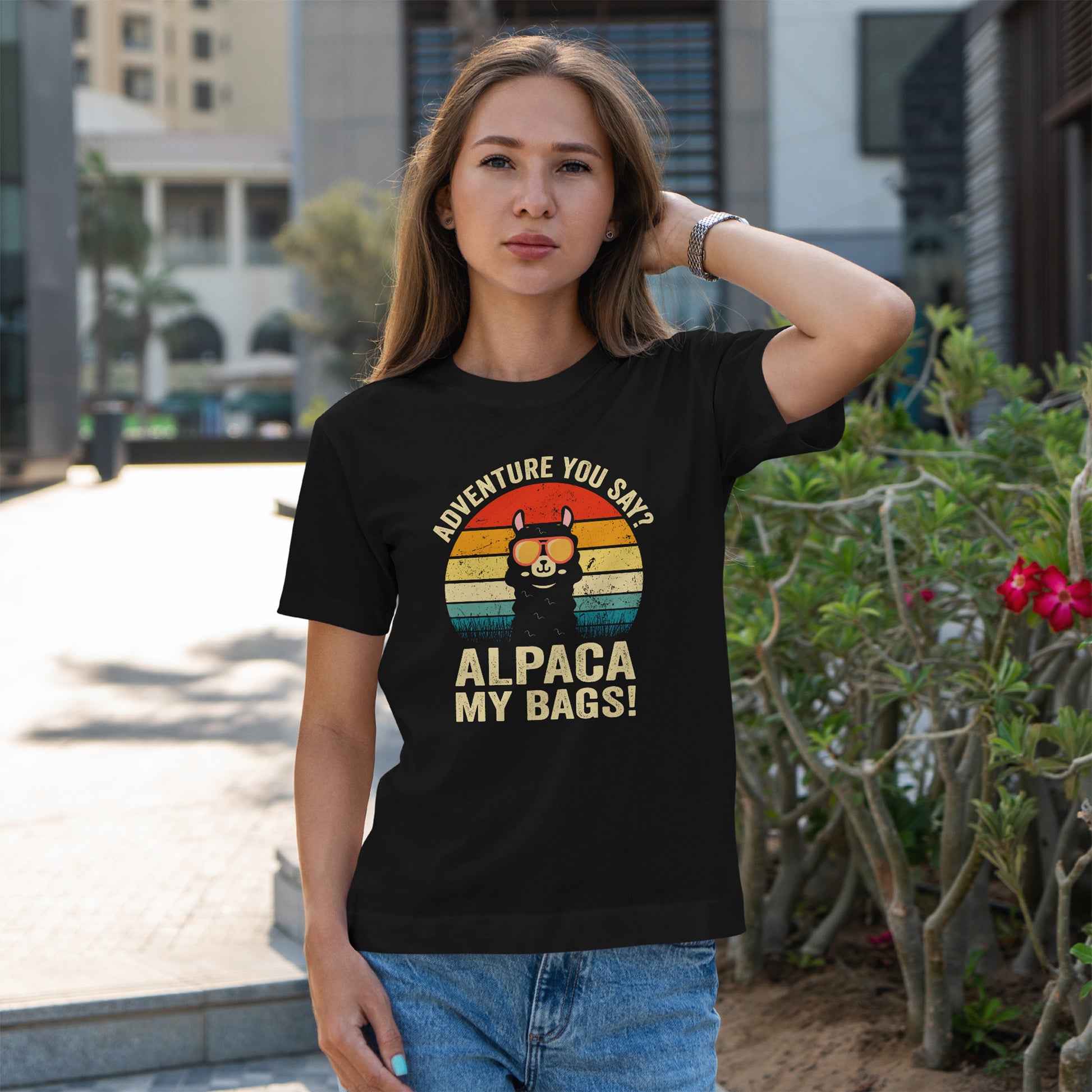 The Alpaca My Bags T-Shirt packs laughs and wanderlust in one cute design. A shades-wearing alpaca stands before a retro sunset — the perfect pun tee for animal fans, road-trip lovers, and anyone booking their next escape.