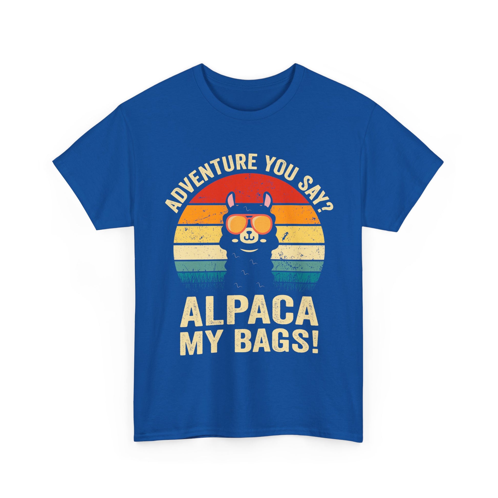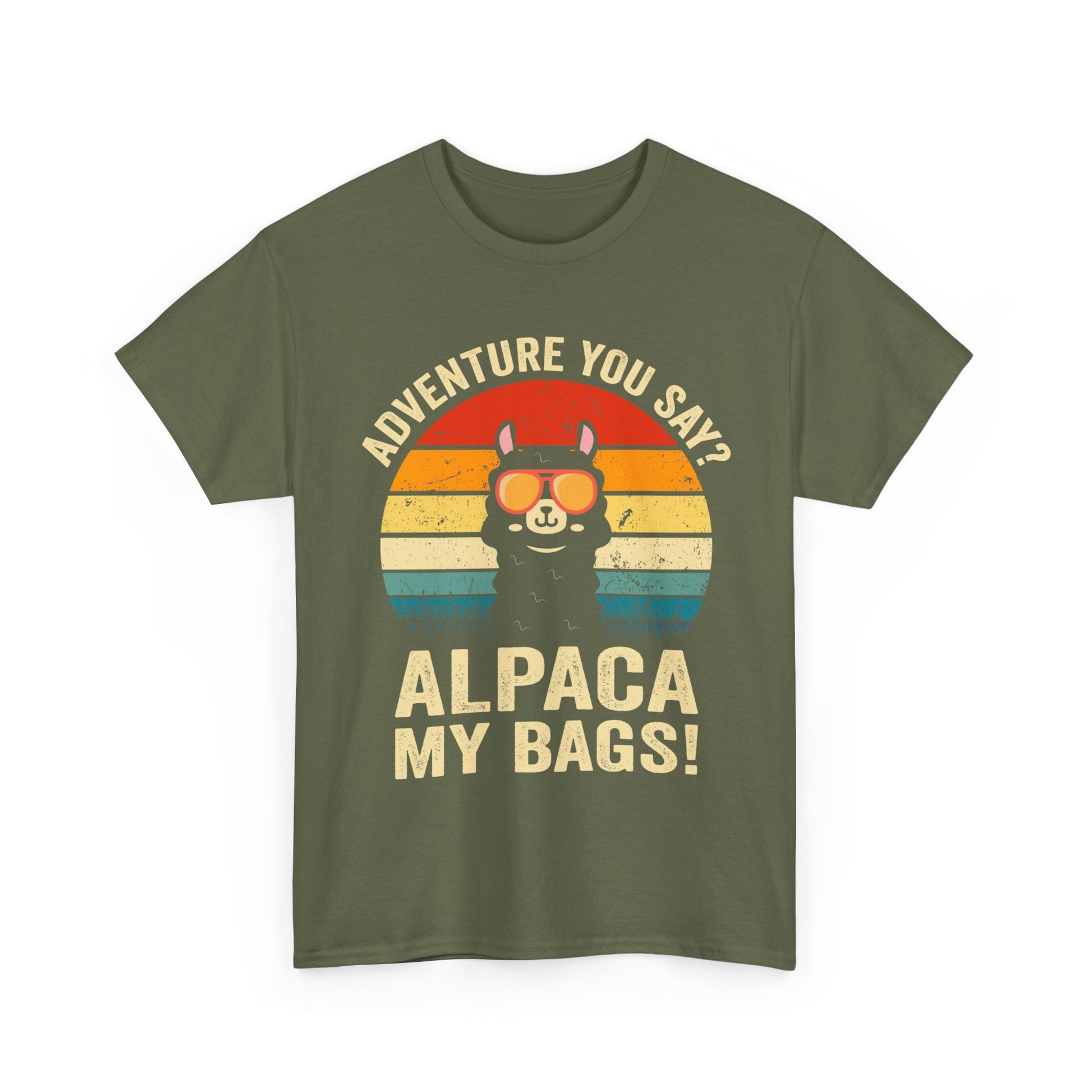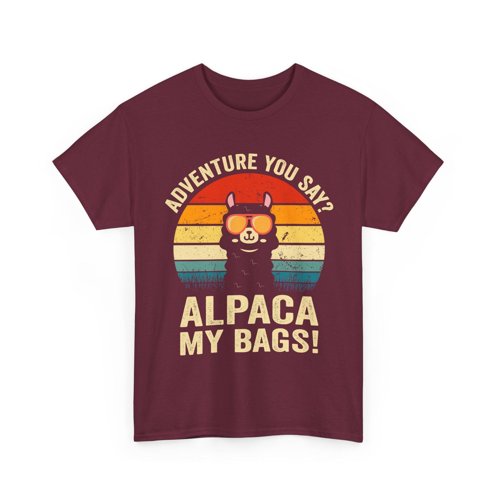 The Alpaca My Bags T-Shirt packs laughs and wanderlust in one cute design. A shades-wearing alpaca stands before a retro sunset — the perfect pun tee for animal fans, road-trip lovers, and anyone booking their next escape.