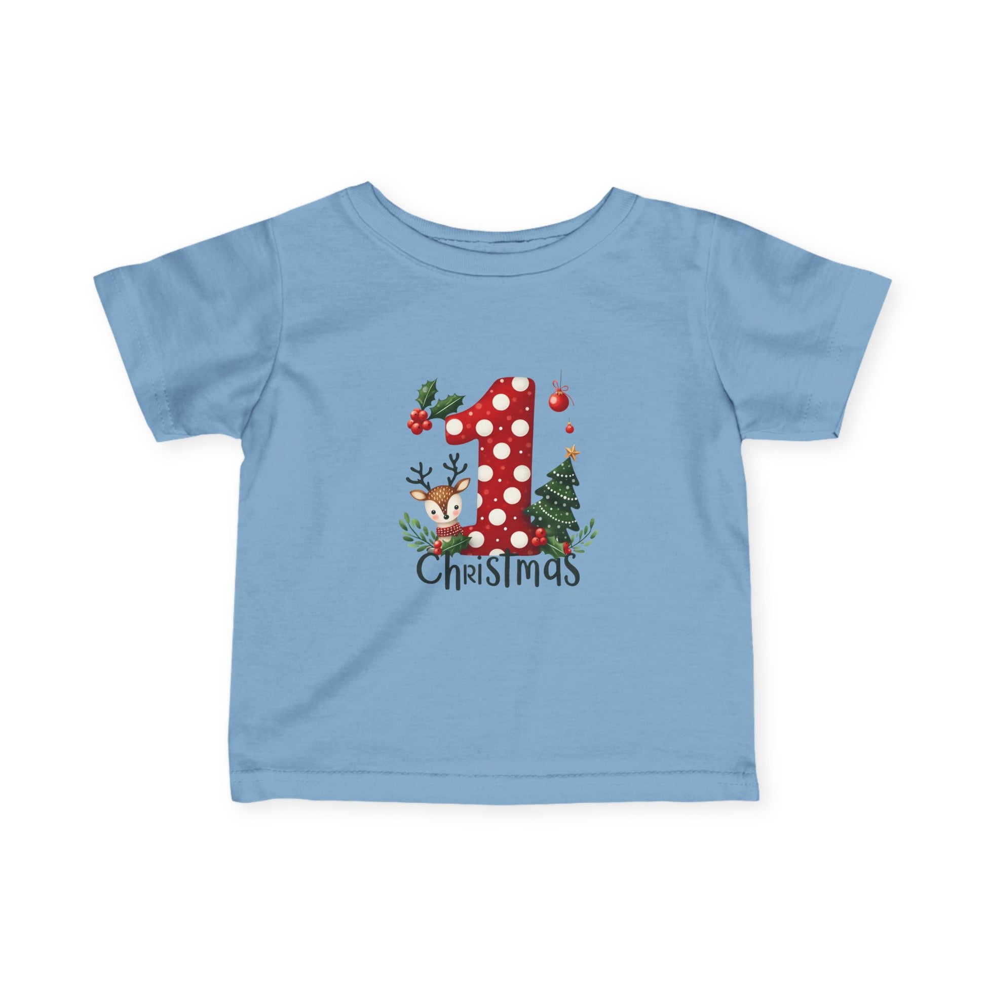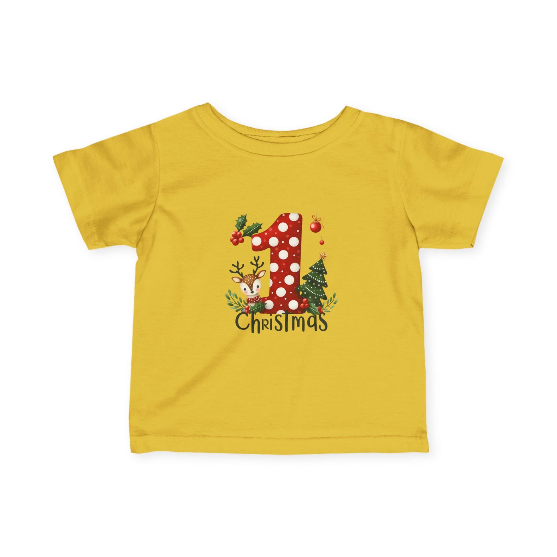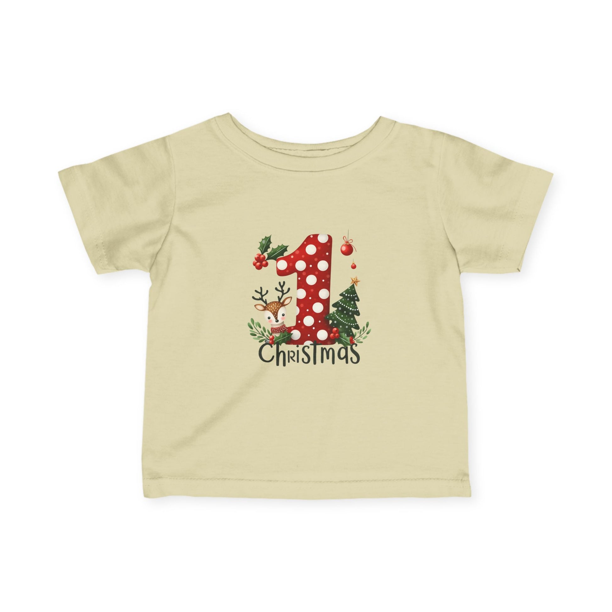 Red, white, and absolutely adorable. This cozy infant tee features a red polka-dot “1”, a sweet baby reindeer, and a twinkling Christmas tree. Soft, safe, and photo-ready — perfect for Santa visits, family gatherings, and that magical first Christmas morning.