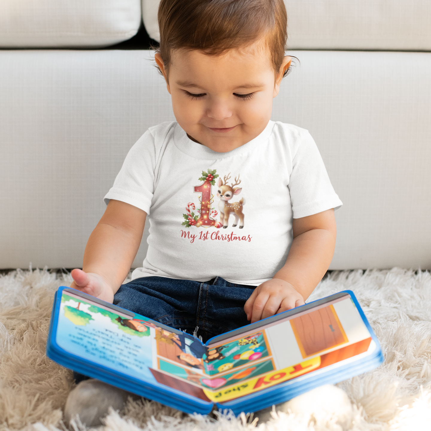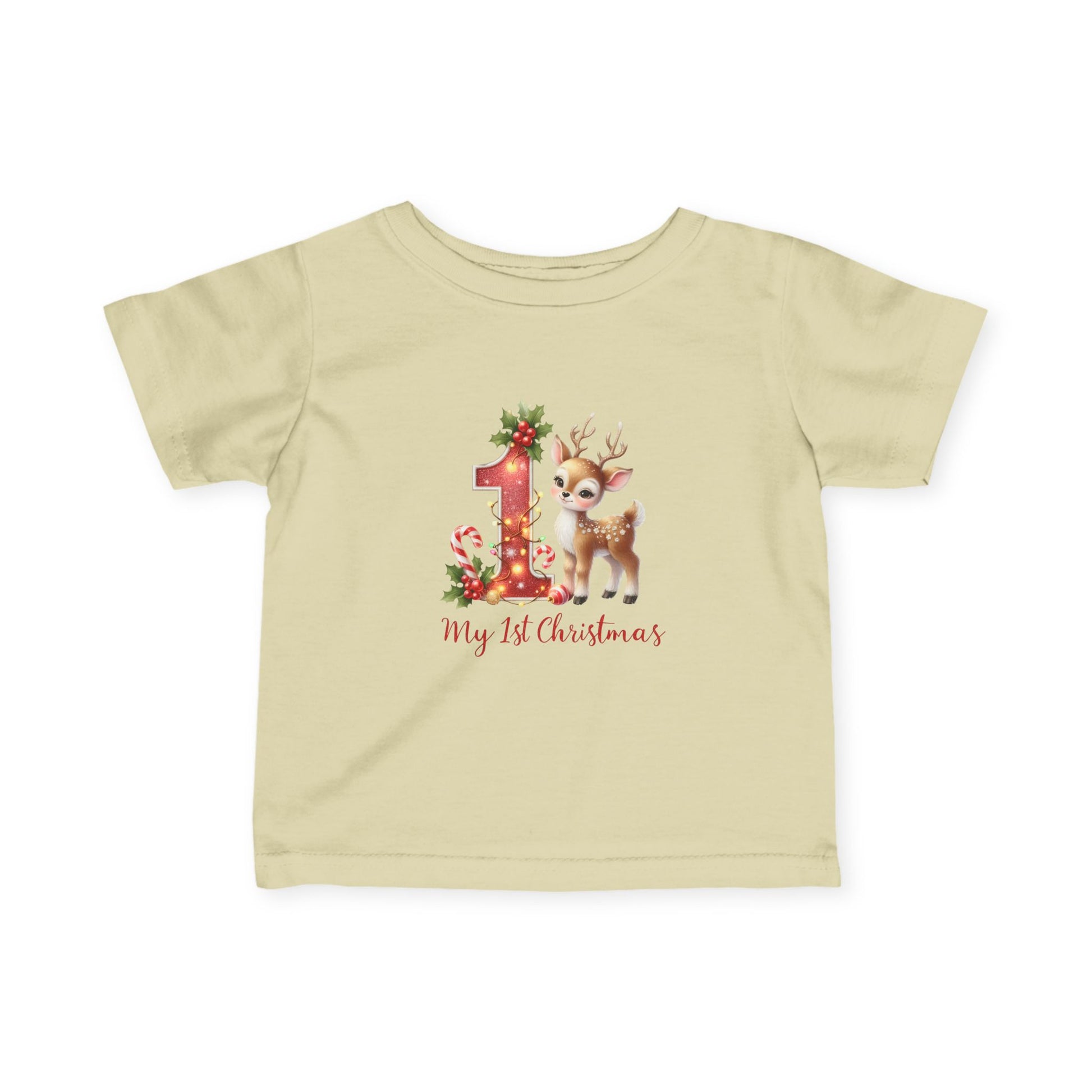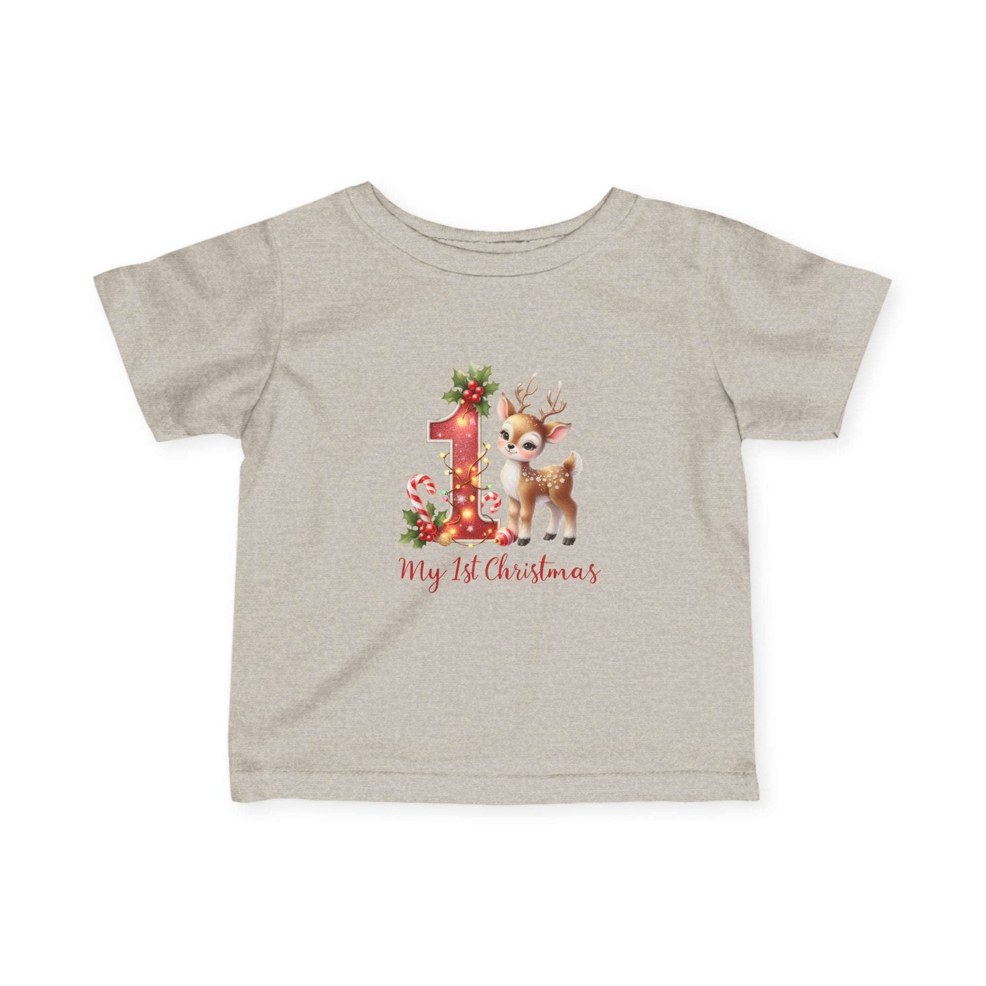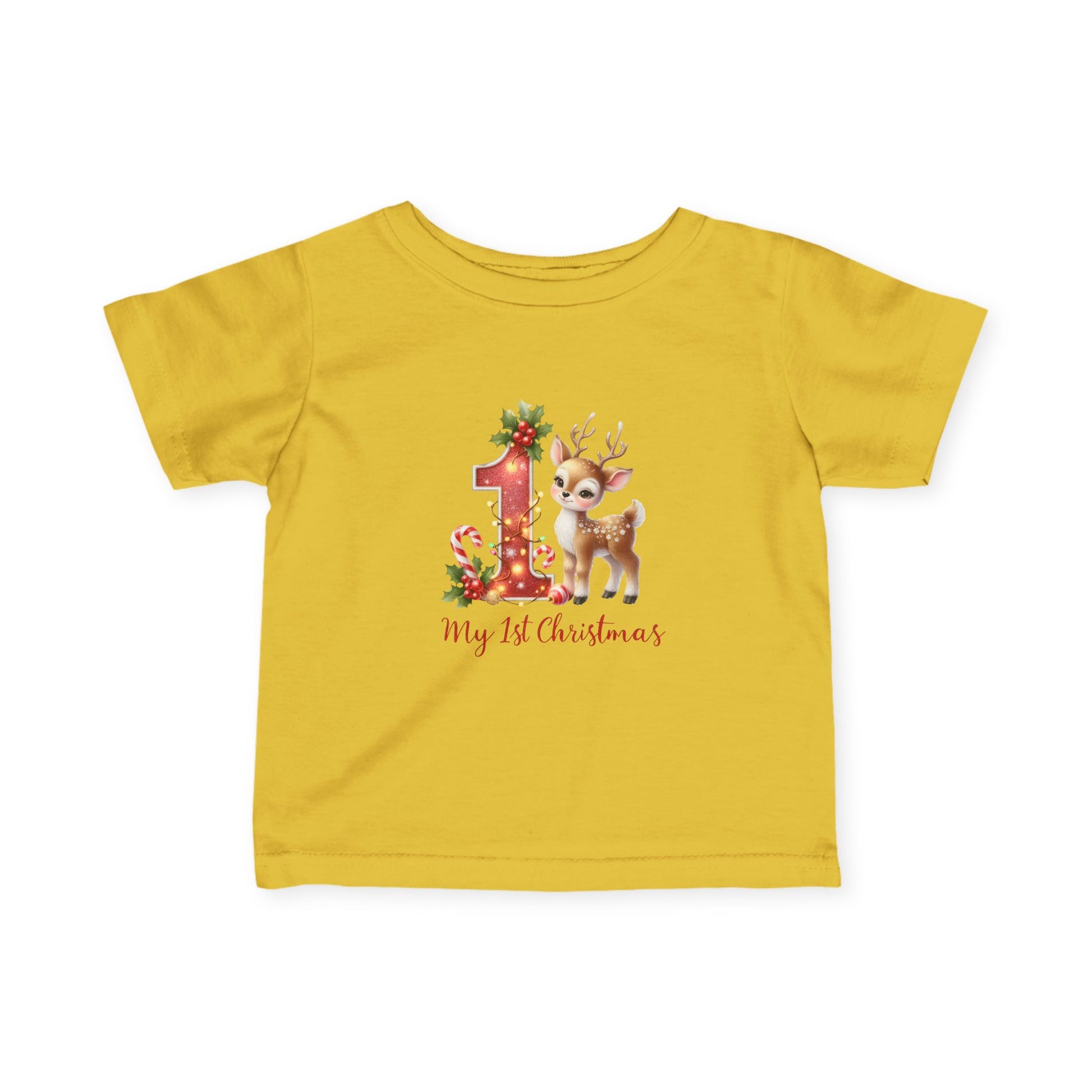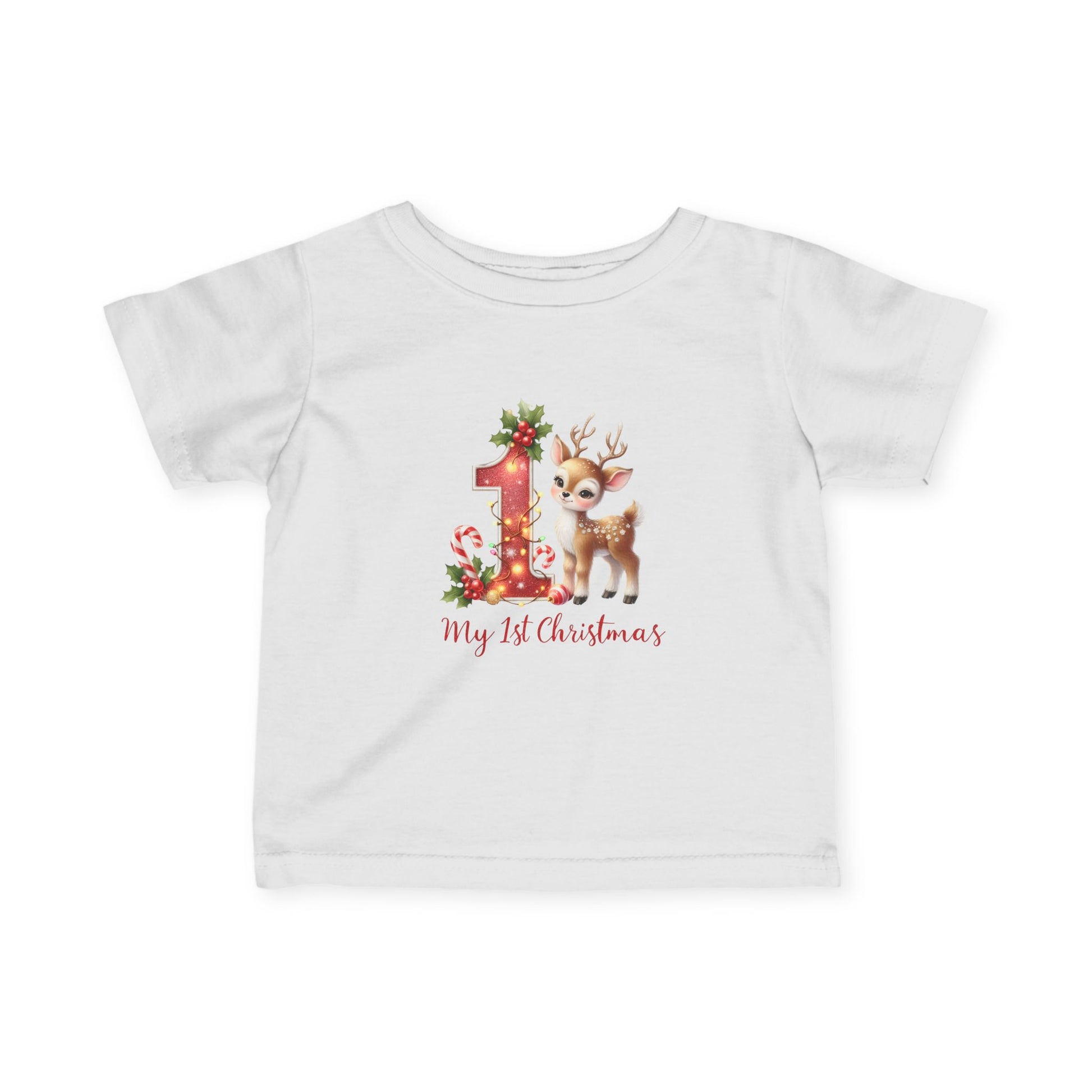 Tiny hooves, huge “aww.” This festive infant tee pairs a sparkly-look red “1” wrapped in twinkle lights with the sweetest baby reindeer, candy canes, and holly. Soft, comfy, and photo-ready — perfect for Santa visits, family parties, and that magical first Christmas morning.