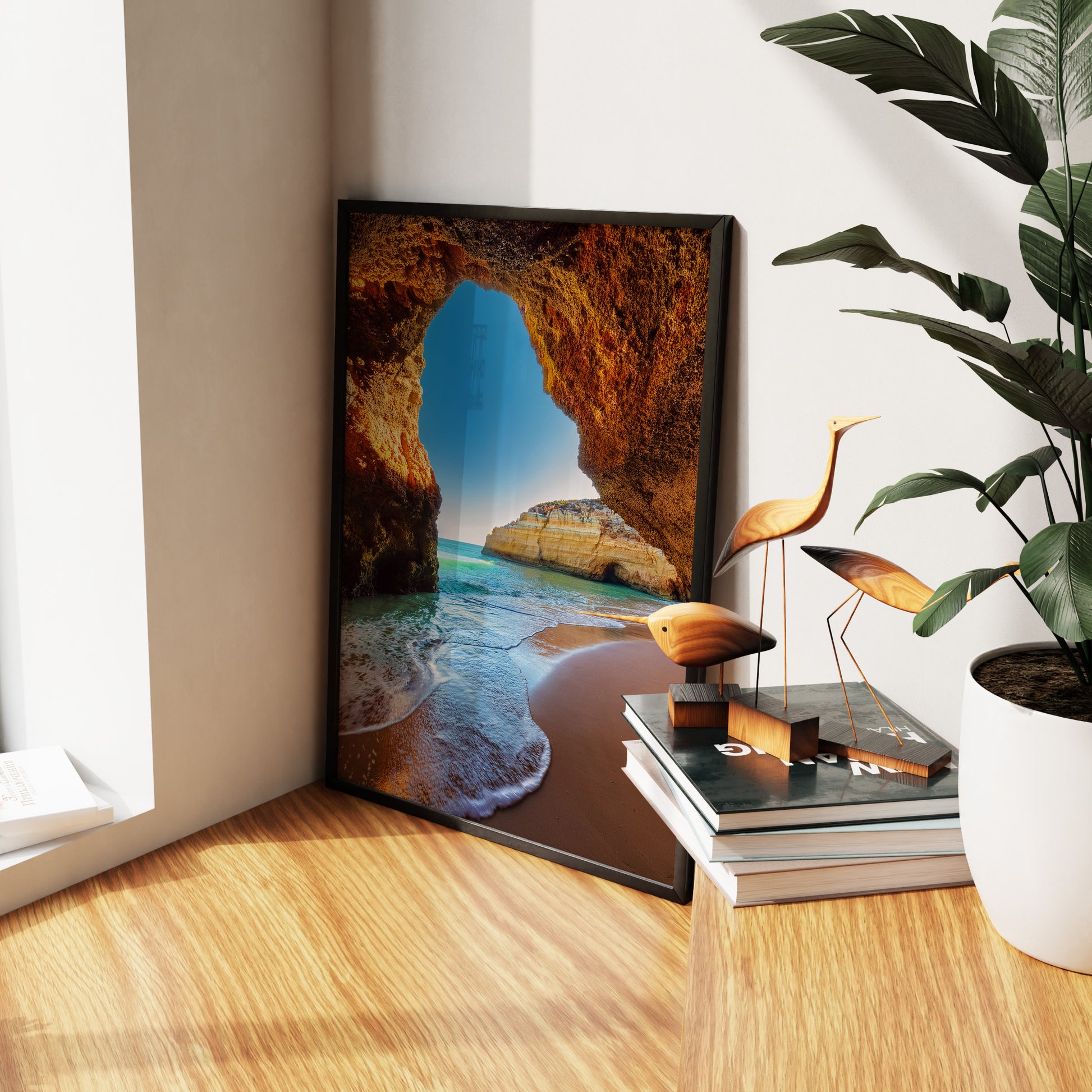 - Hang the widest cave-opening image in the center and flank with the tighter rock/water views for a calm left-to-right flow. Natural wood frames and white mats make the turquoise pop.