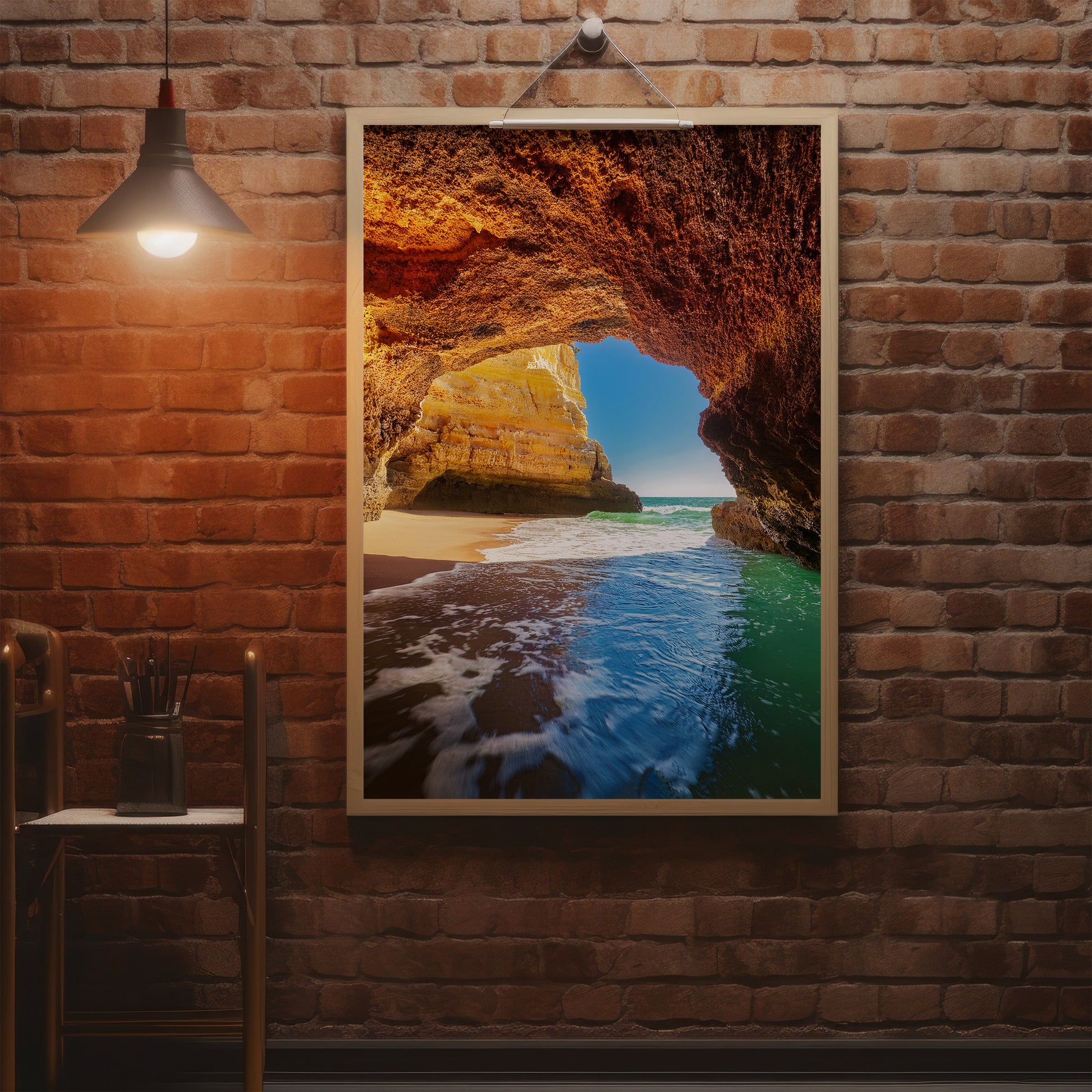 Sunlit limestone arches, turquoise Atlantic water and soft shoreline foam - the magic of Portugal’s Benagil Cave for your walls.