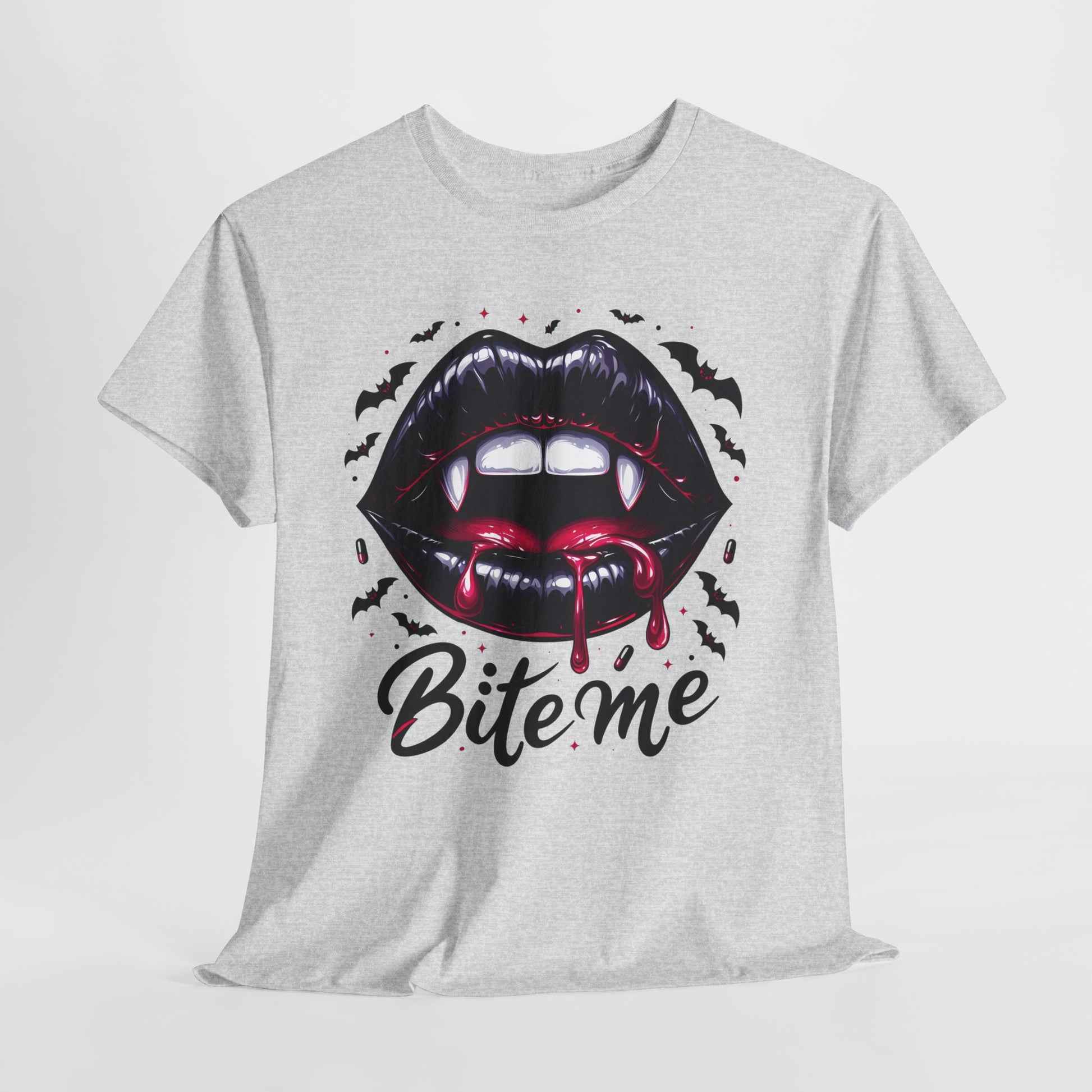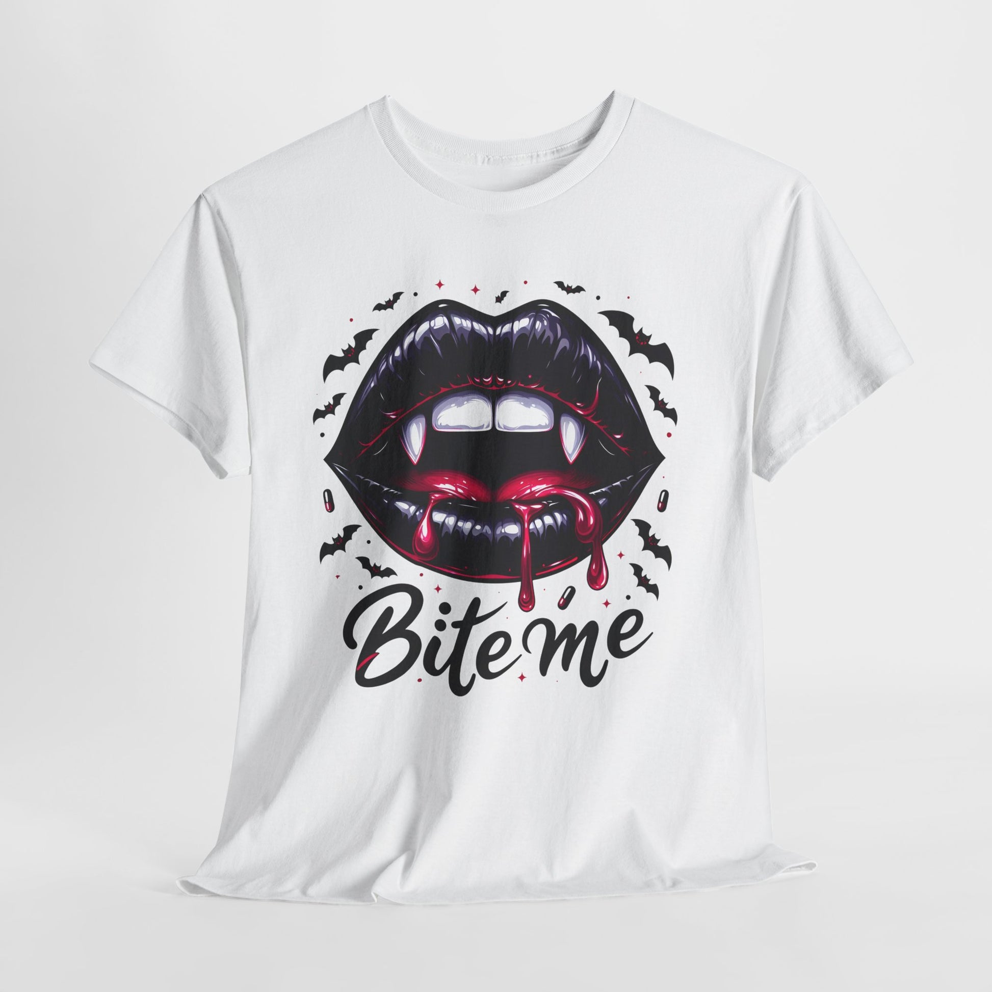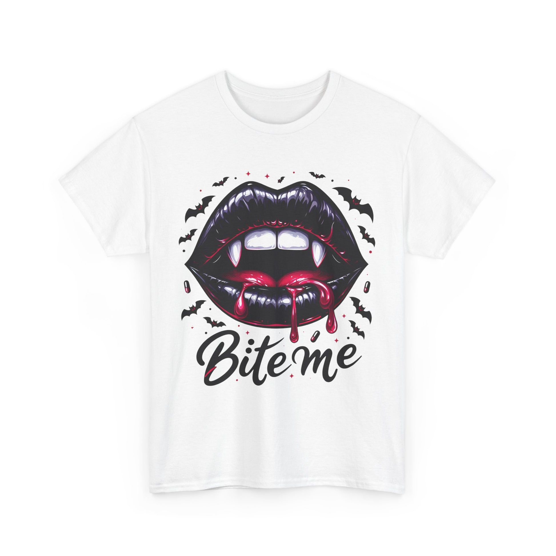Bite Me Vampire Lips T-Shirt - Gothic Fangs & Bats Halloween Tee