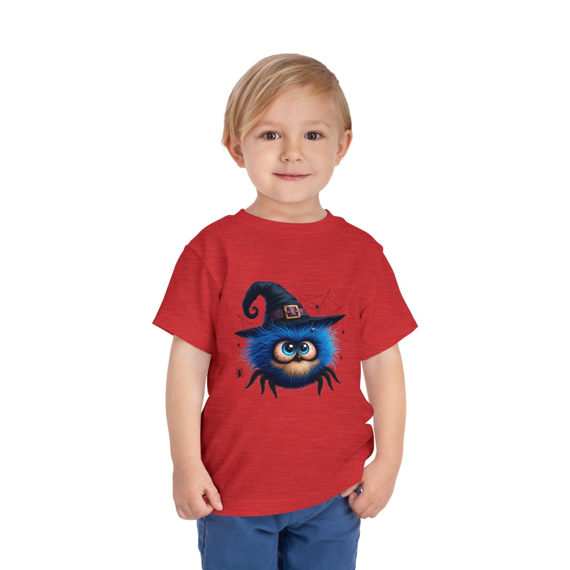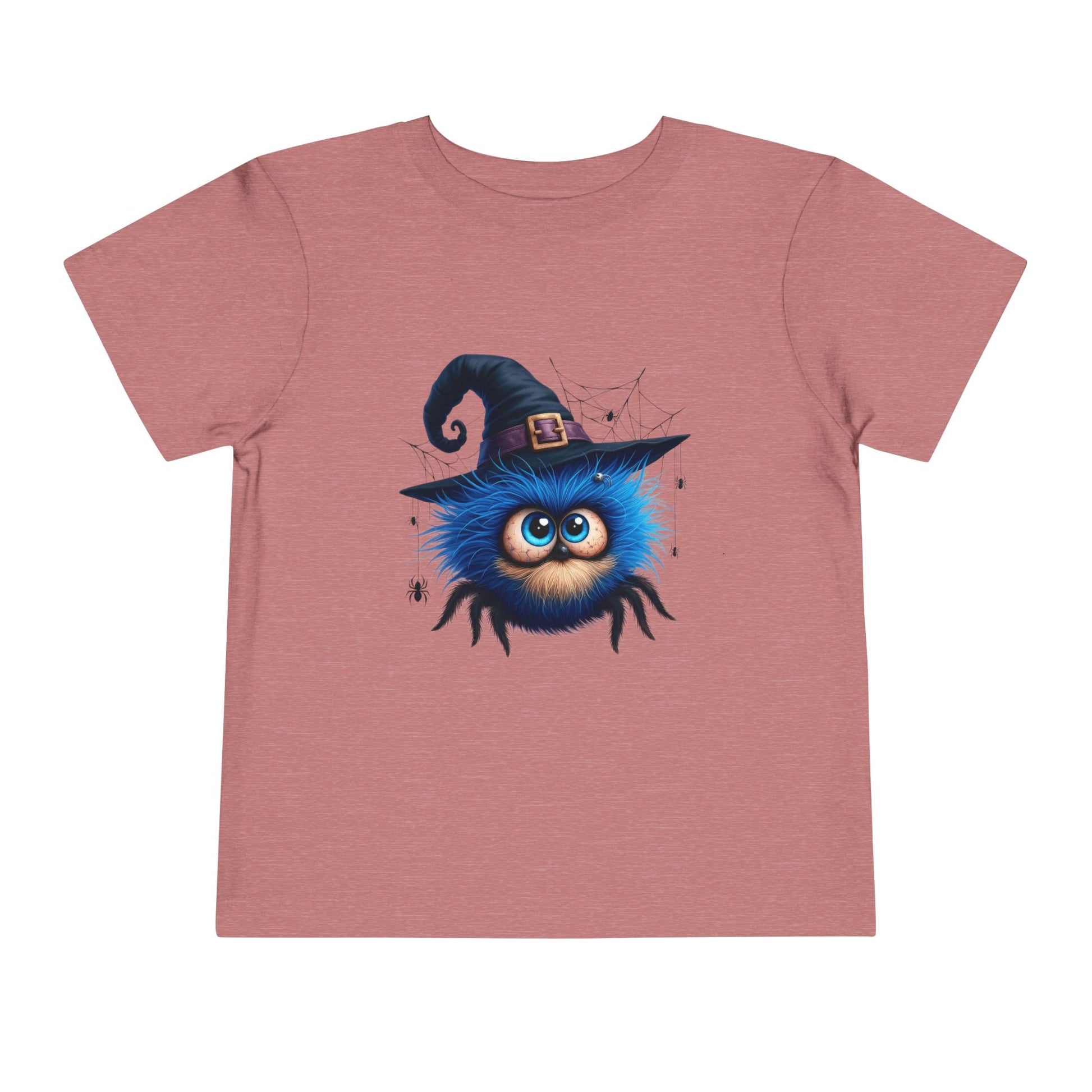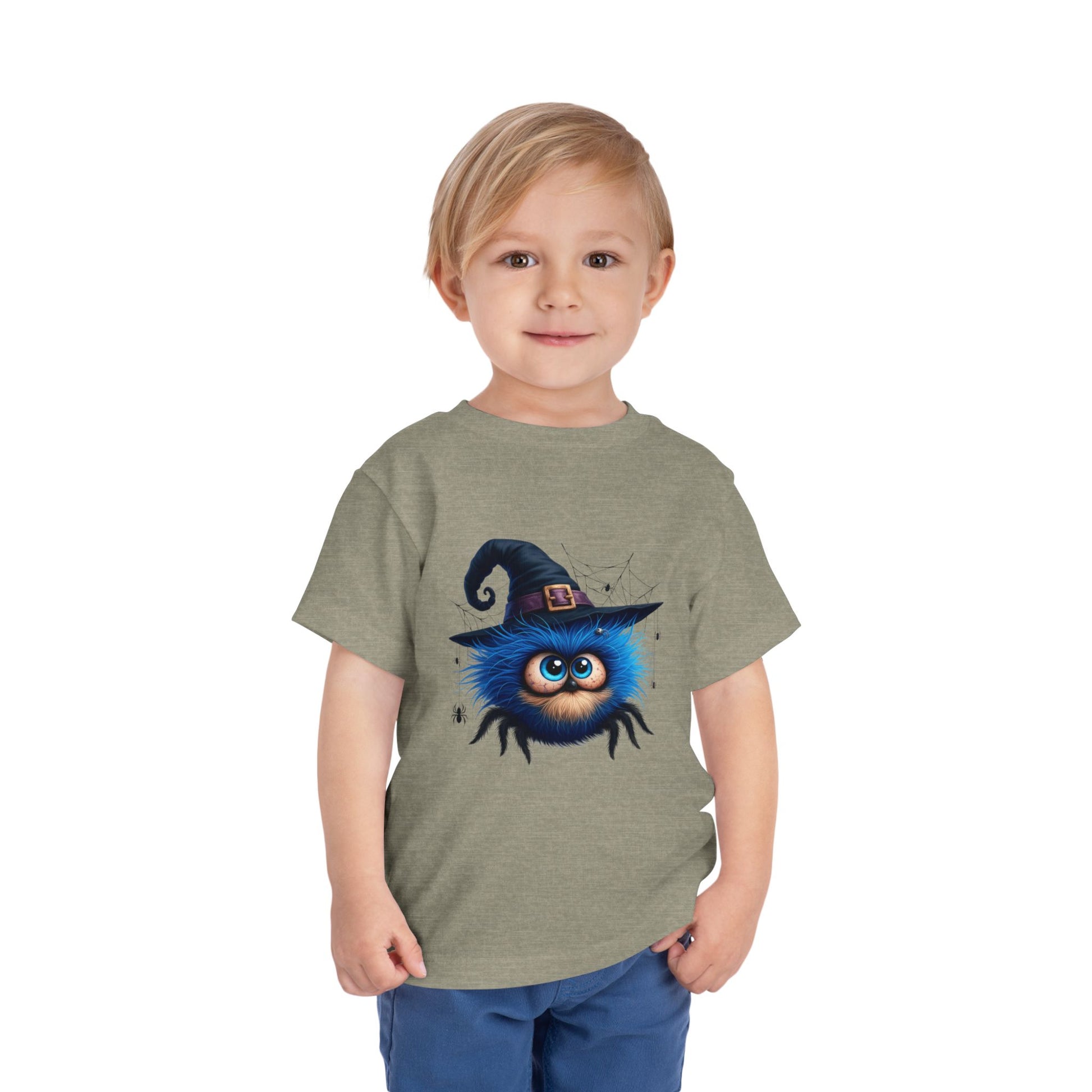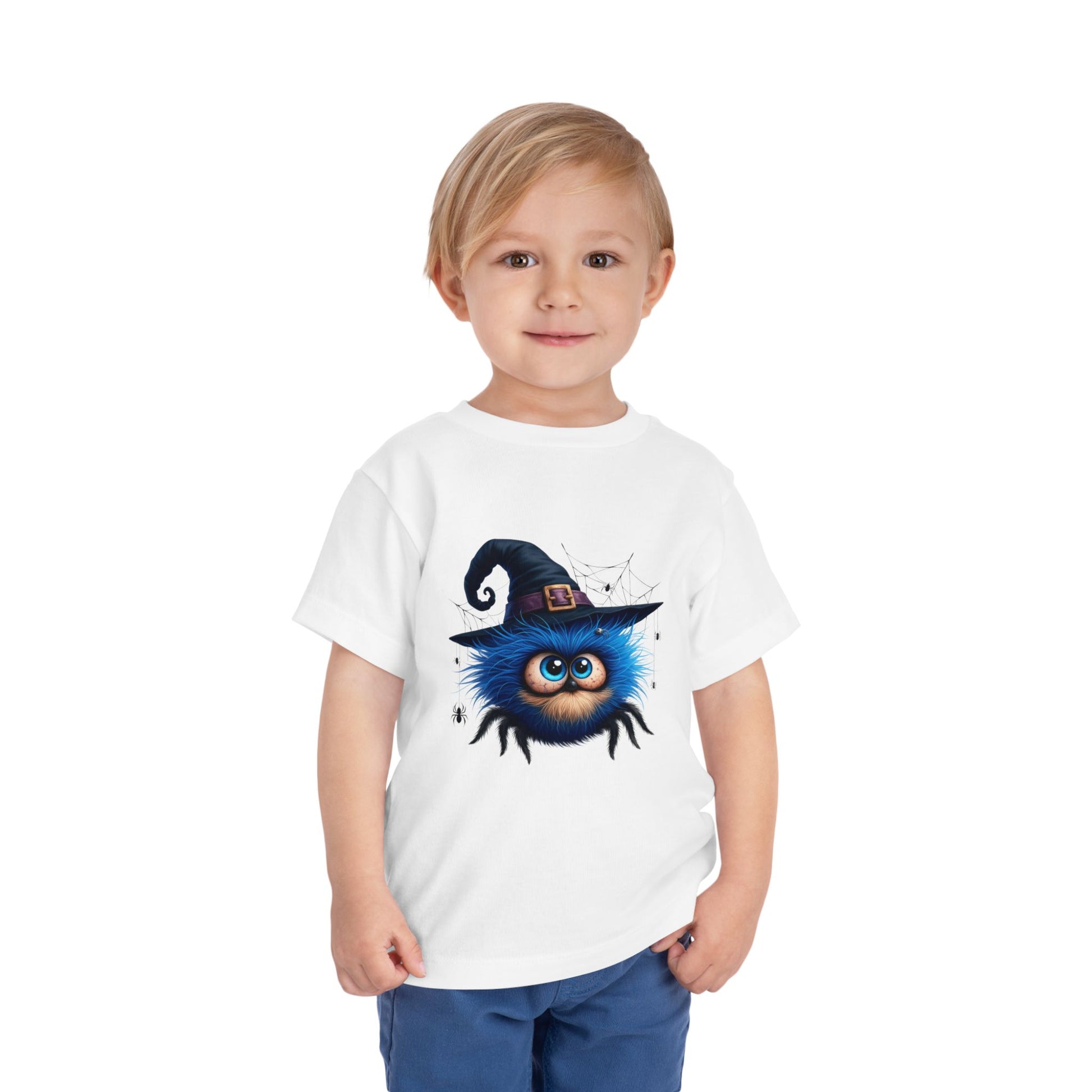 Big eyes, zero scares - just spooky cute fun. A fluffy blue spider with huge eyes wears a witch hat, framed by whimsical webs and tiny spiders. The sweet side of Halloween for preschool parties, pumpkin patch trips and trick or treat night. Soft, lightweight and comfy all day in a unisex toddler fit for boys and girls.