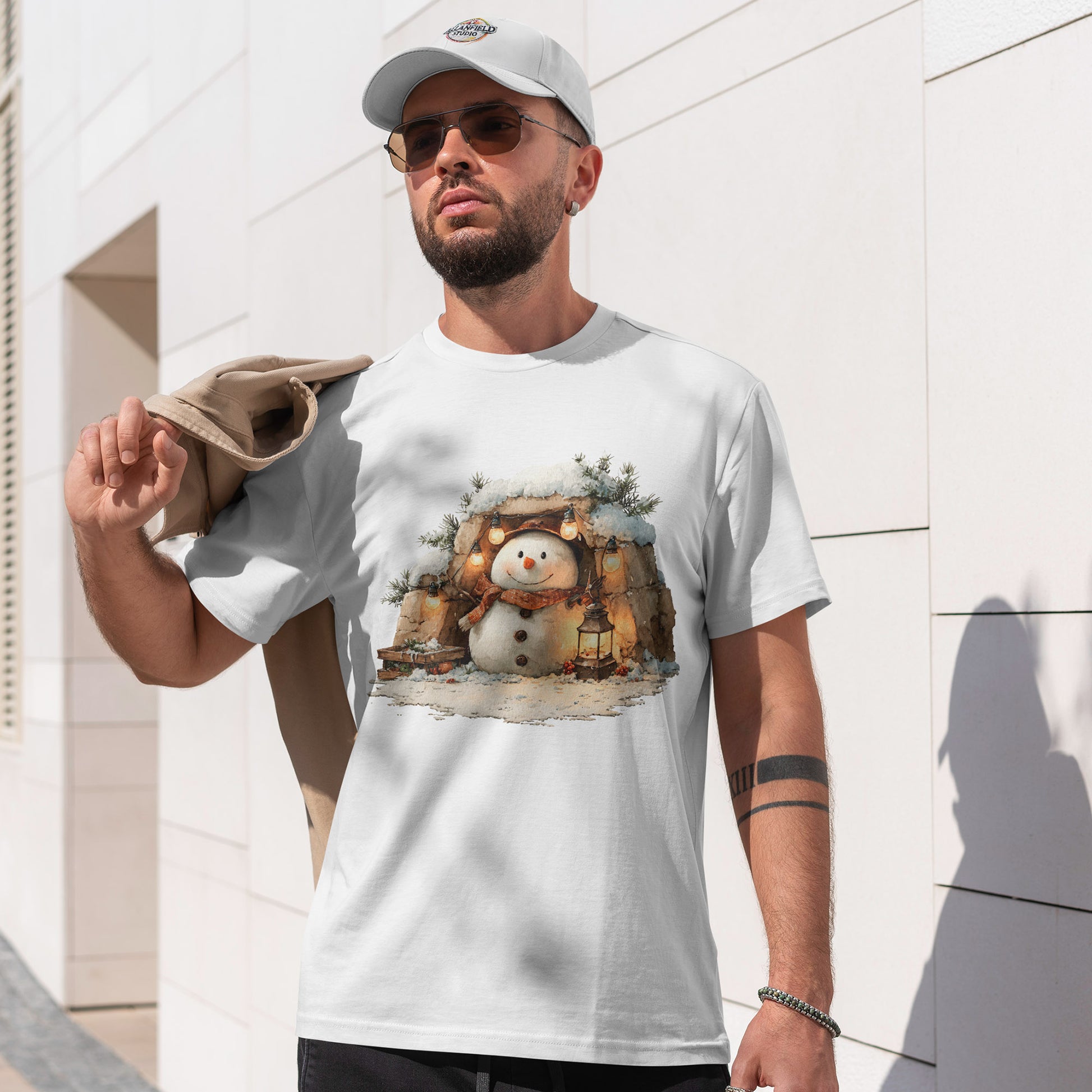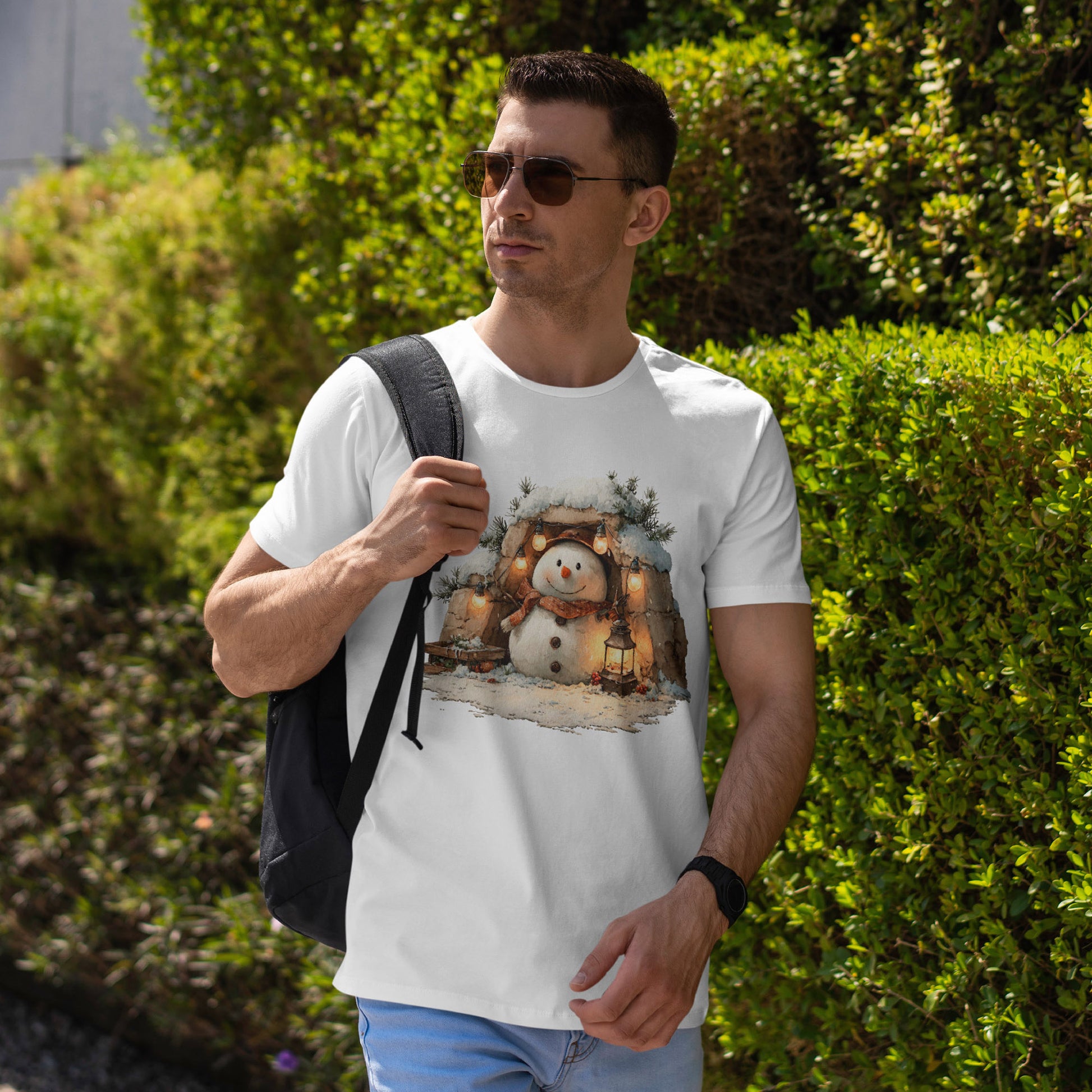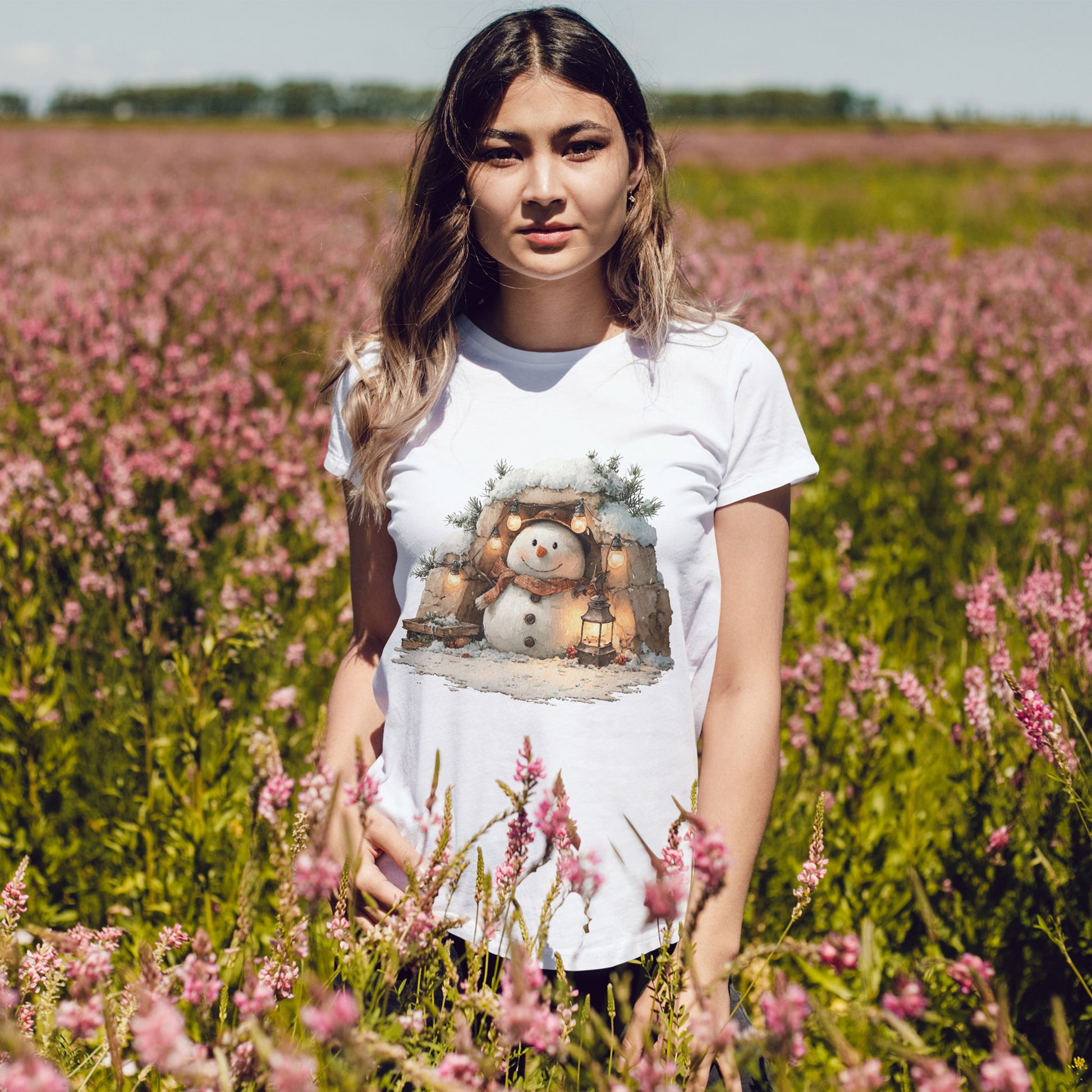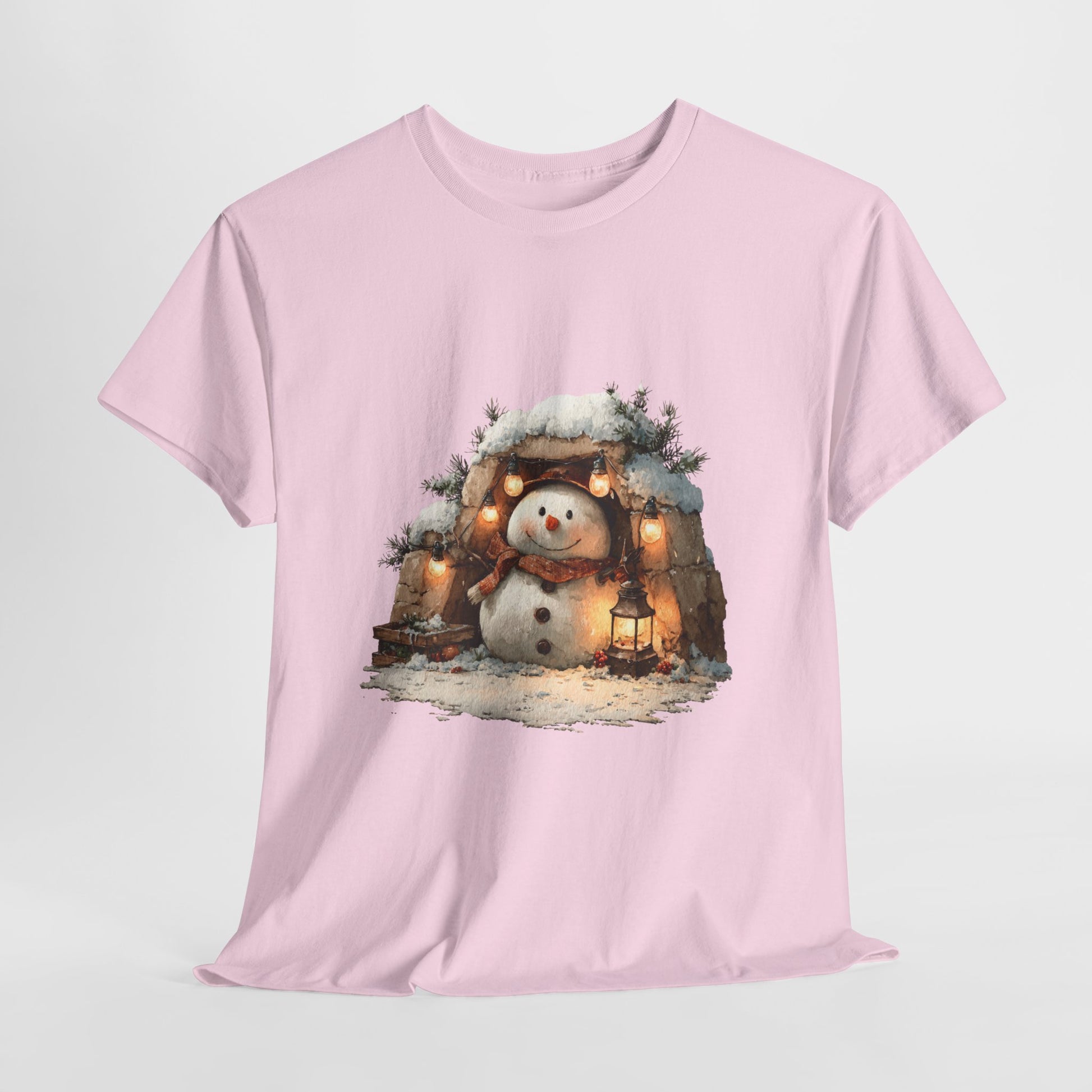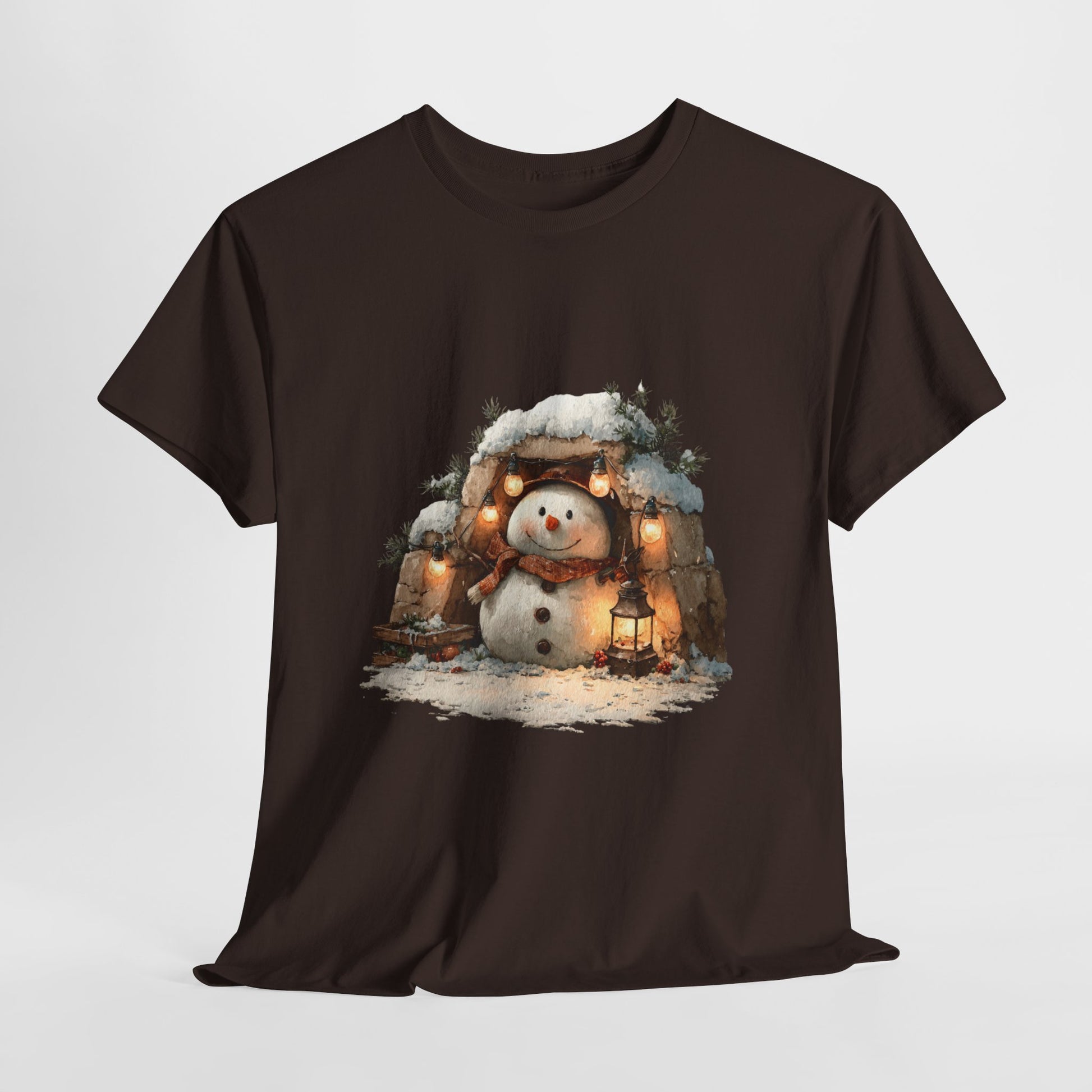 Cold outside, warm glow within. A lantern-lit snowman rests in a stone alcove beneath twinkling string lights, wrapped in a plaid scarf with wooden button details. Painterly textures, soft golden light, and evergreen accents make this an easy “no-costume” festive tee for tree runs, cocoa stops, and everything cozy.