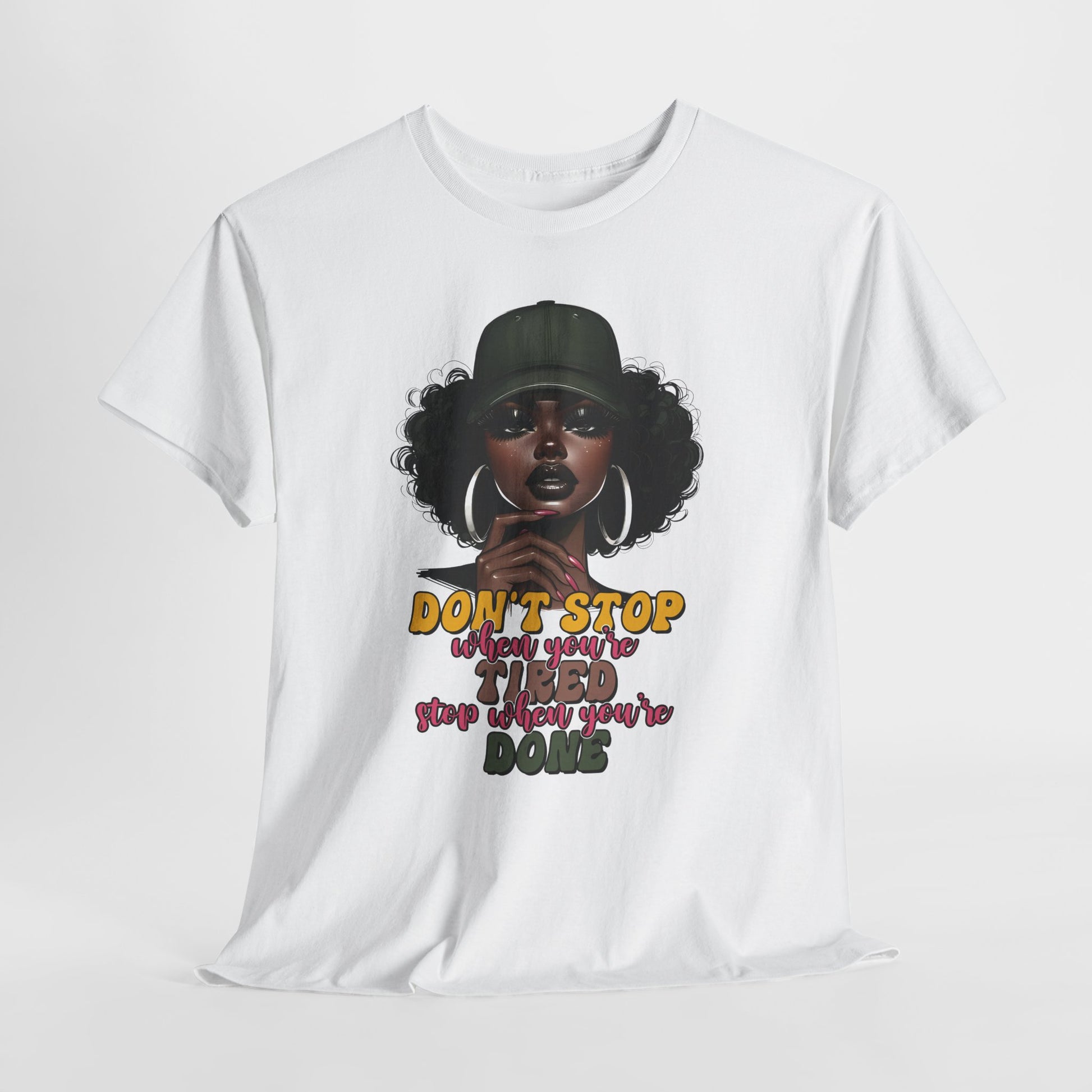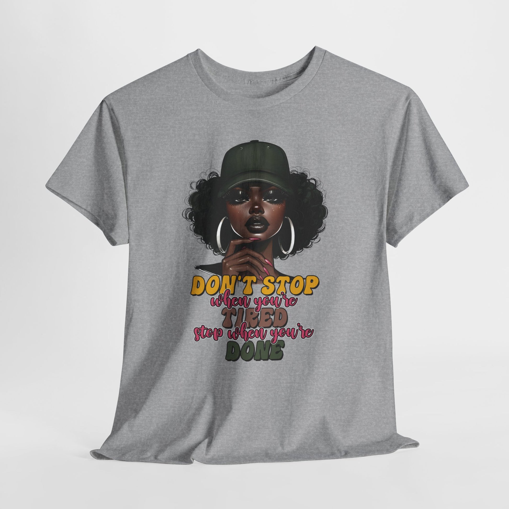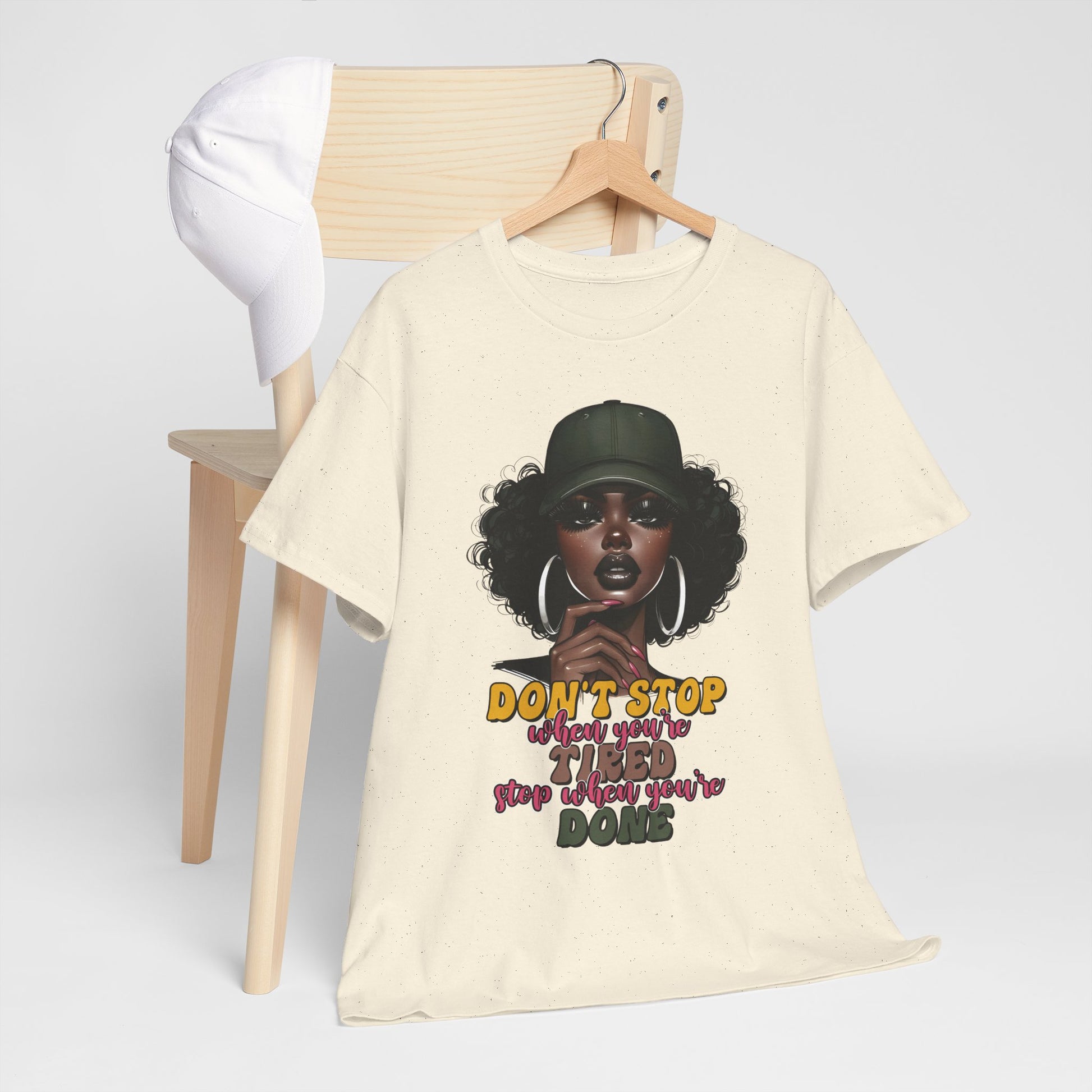 Don’t stop — especially when the drip looks this good. This bold motivational tee features a stunning melanin beauty with flawless curls, glossy lips and a “boss mode” stare. Paired with the quote “Don’t stop when you’re tired, stop when you’re done,” it’s the perfect energy boost for gym days, work days and glow-up days.