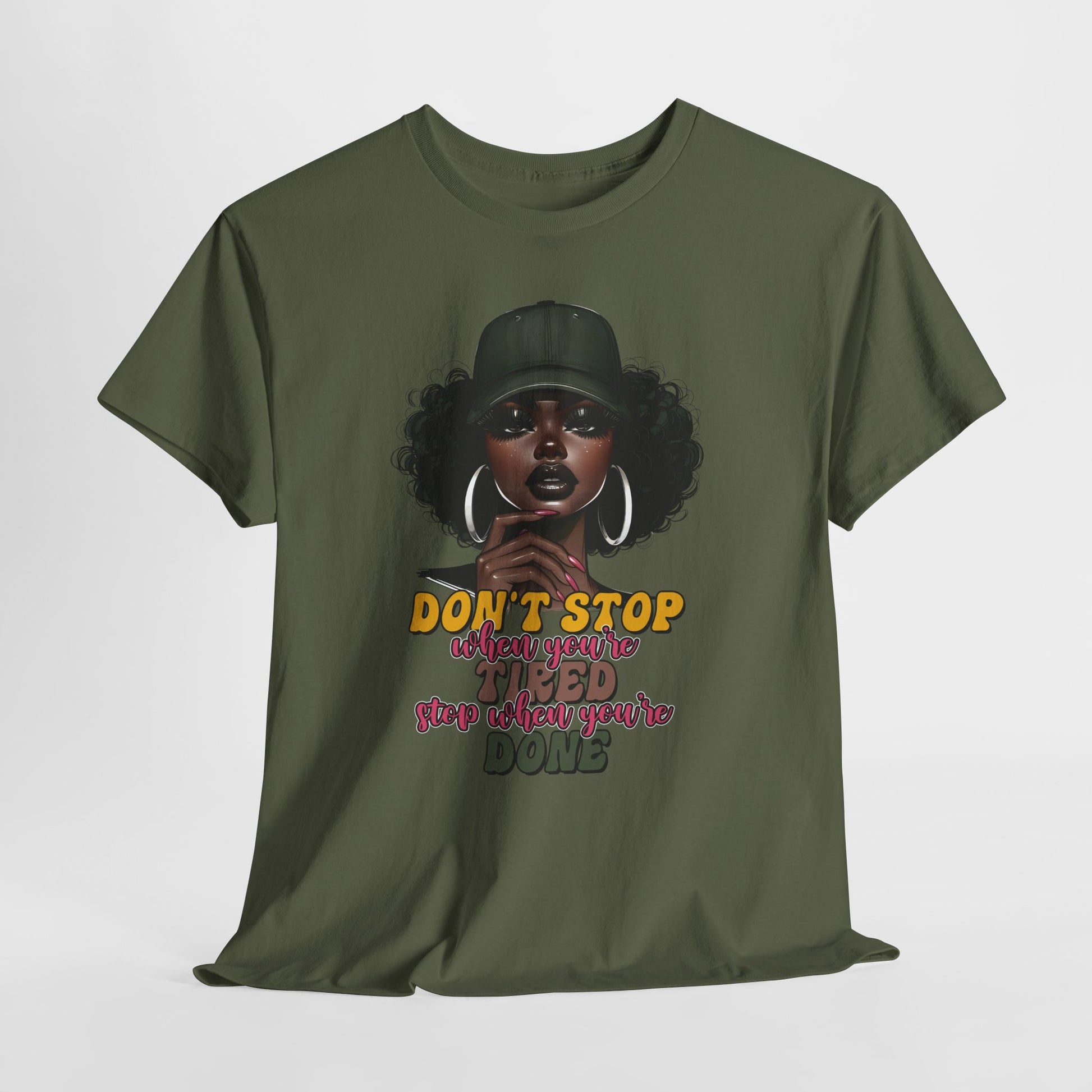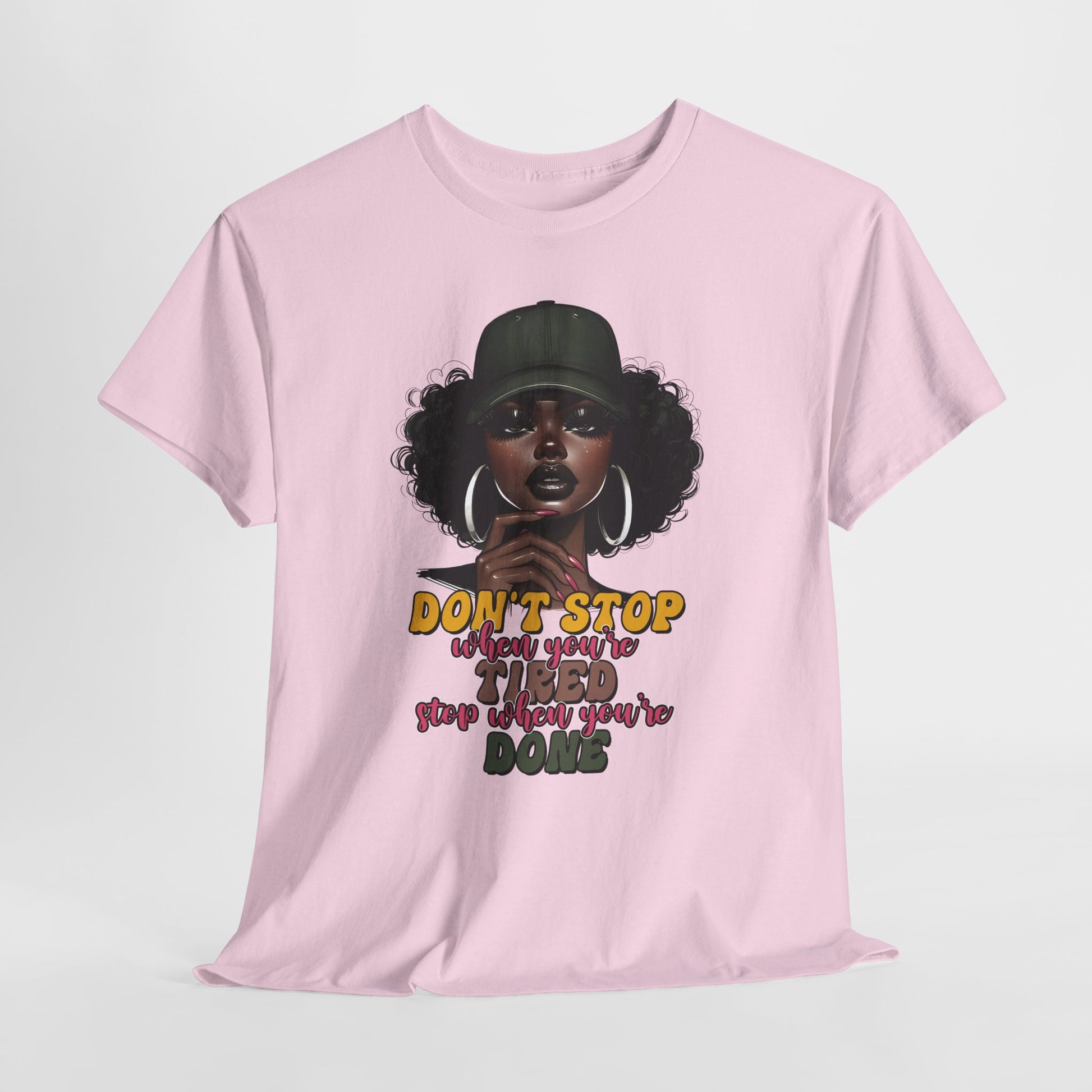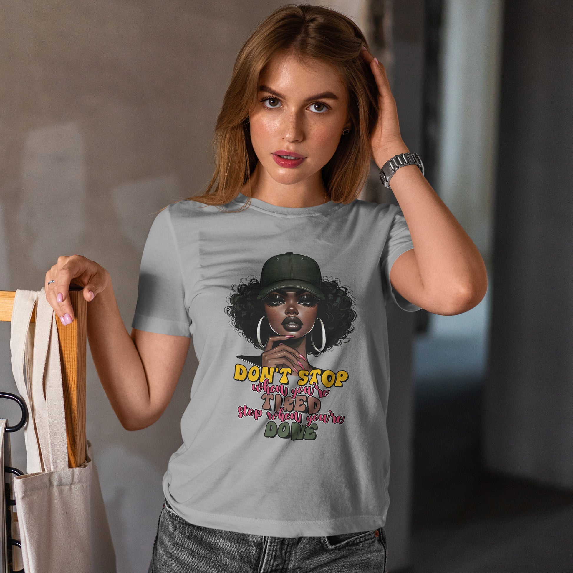 Don’t stop — especially when the drip looks this good. This bold motivational tee features a stunning melanin beauty with flawless curls, glossy lips and a “boss mode” stare. Paired with the quote “Don’t stop when you’re tired, stop when you’re done,” it’s the perfect energy boost for gym days, work days and glow-up days.