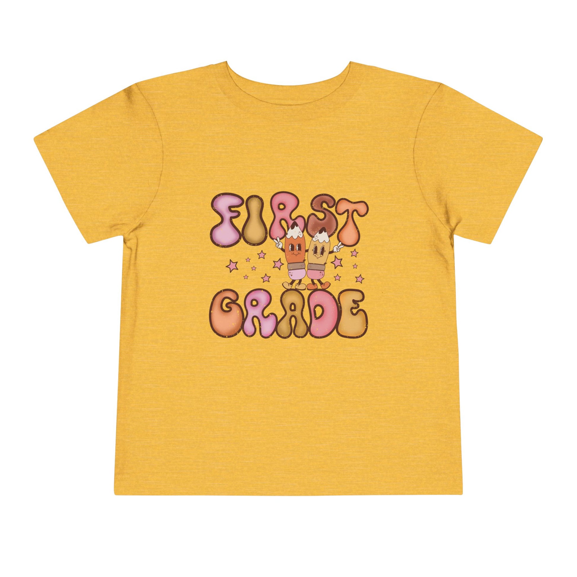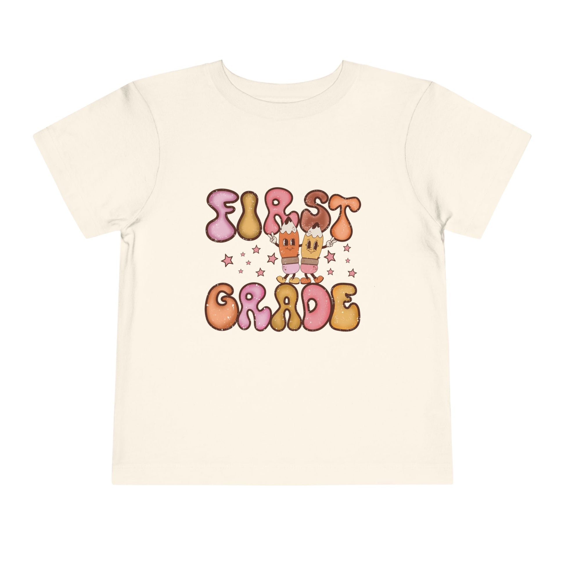 The First Grade Bubble Letters T-Shirt brings squishy retro pastels, sparkly stars, and two peace-sign pencil pals for instant first-day photo magic. Soft vintage vibe + classroom-ready comfort = A+ back-to-school style.