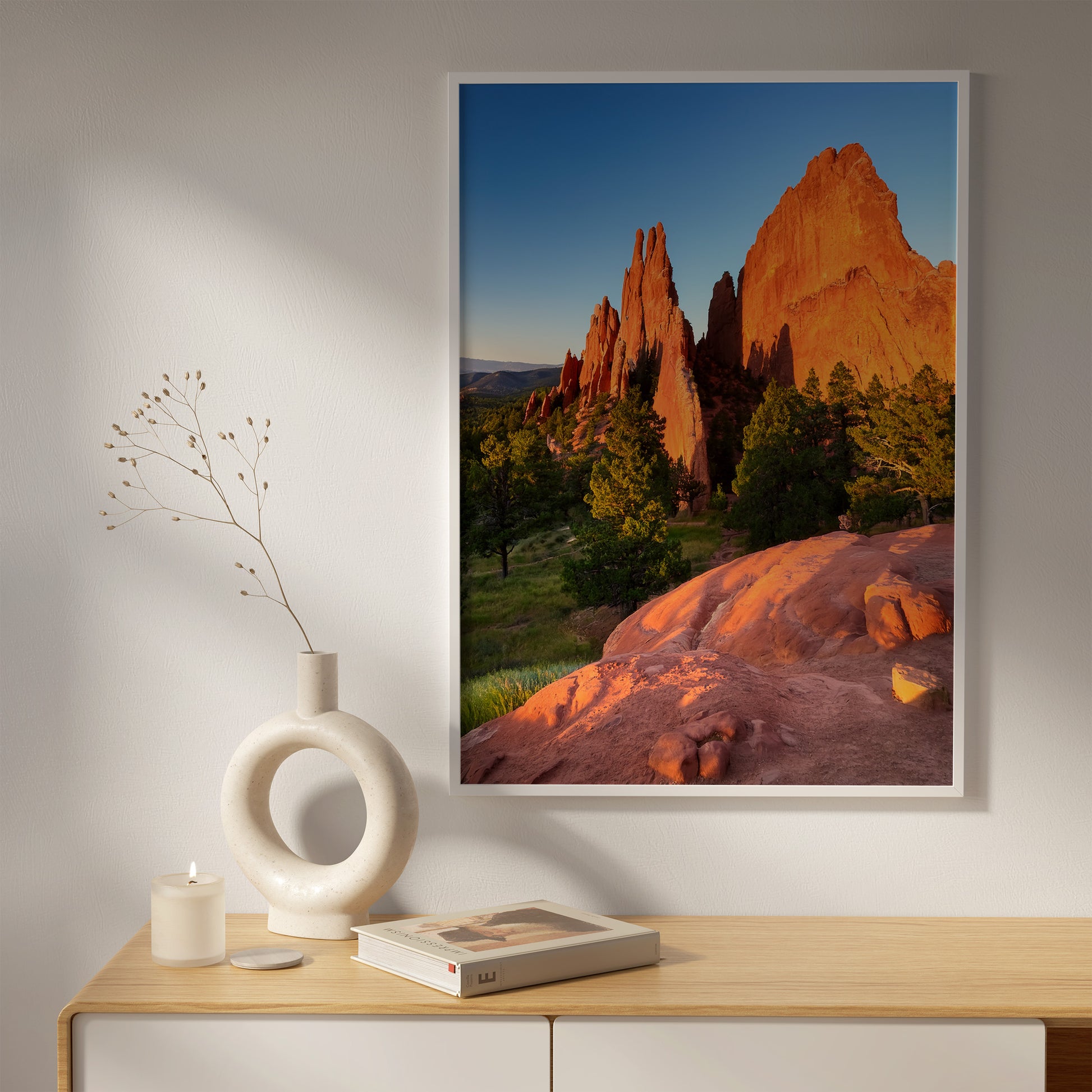 ⛰️ Towering red-sandstone fins glowing at golden hour under crystal-blue skies — Colorado’s Garden of the Gods, right on your walls.