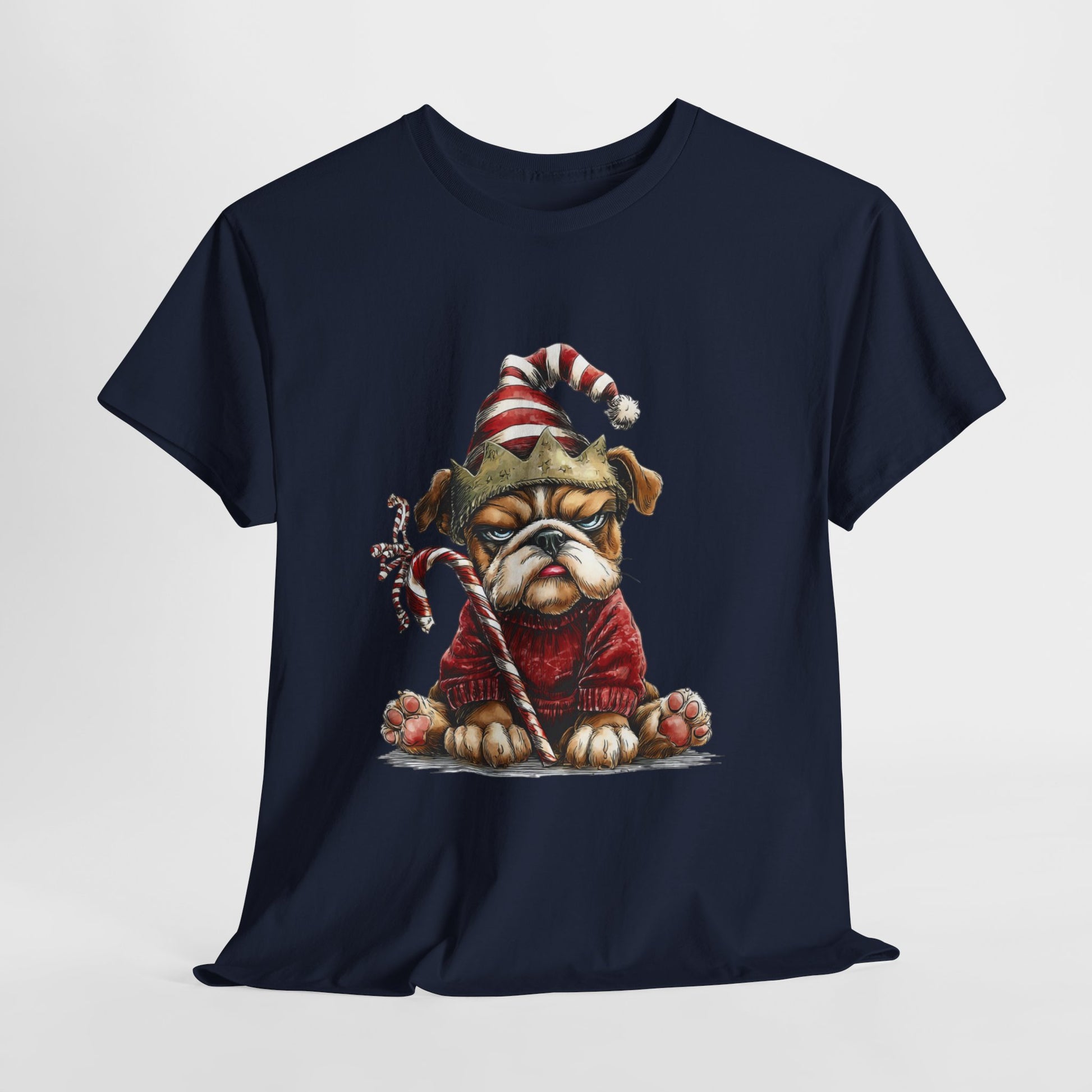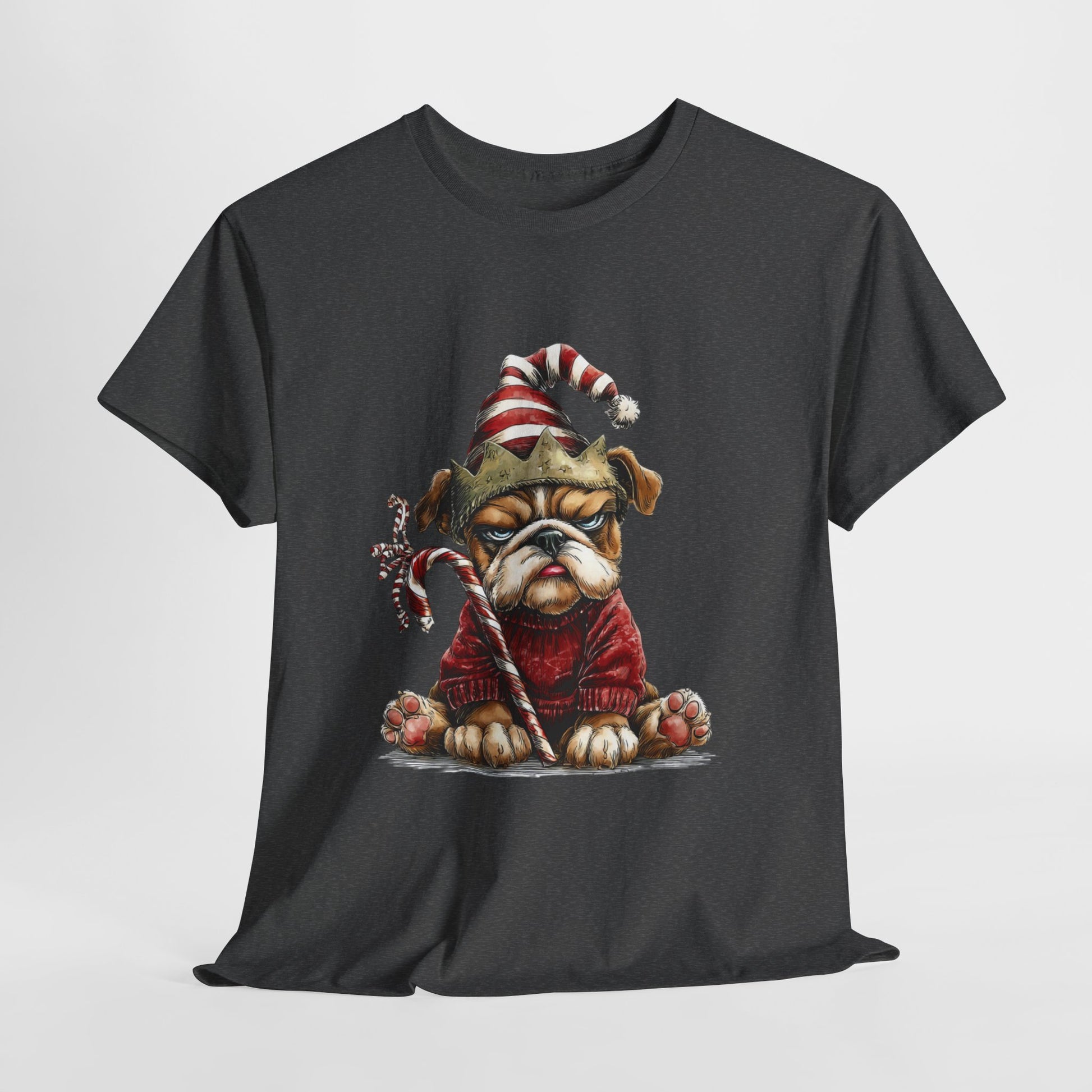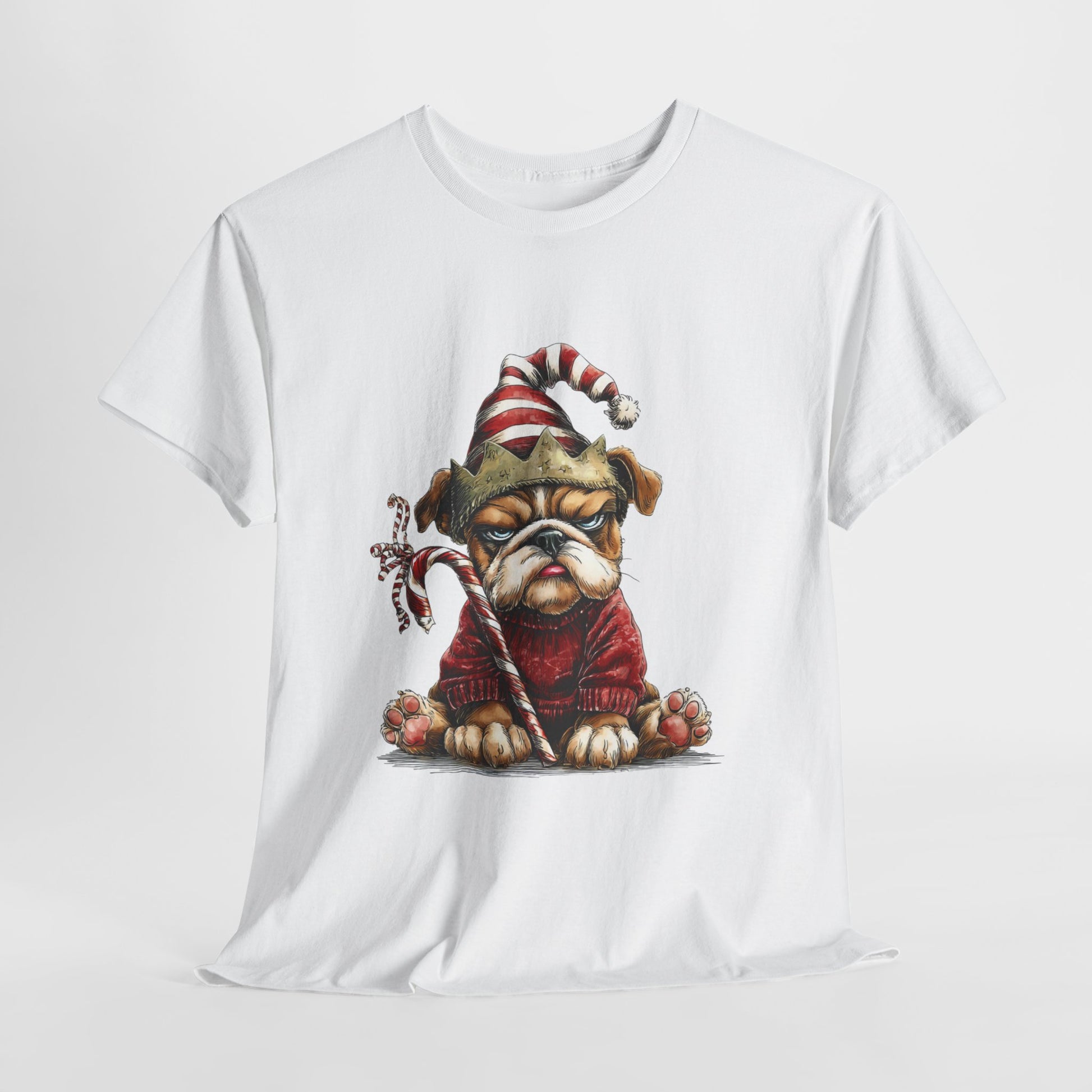 Festive outfit on - joy level pending. A magnificently unimpressed bulldog sits in a chunky red sweater with a stripey Santa hat, a paper crown, and a candy cane clenched like a scepter. Hand-drawn textures, oversized paws, and championship side-eye make this a party-ready tee for photos, cocoa runs, and sarcastic holiday vibes - a costume without the costume.