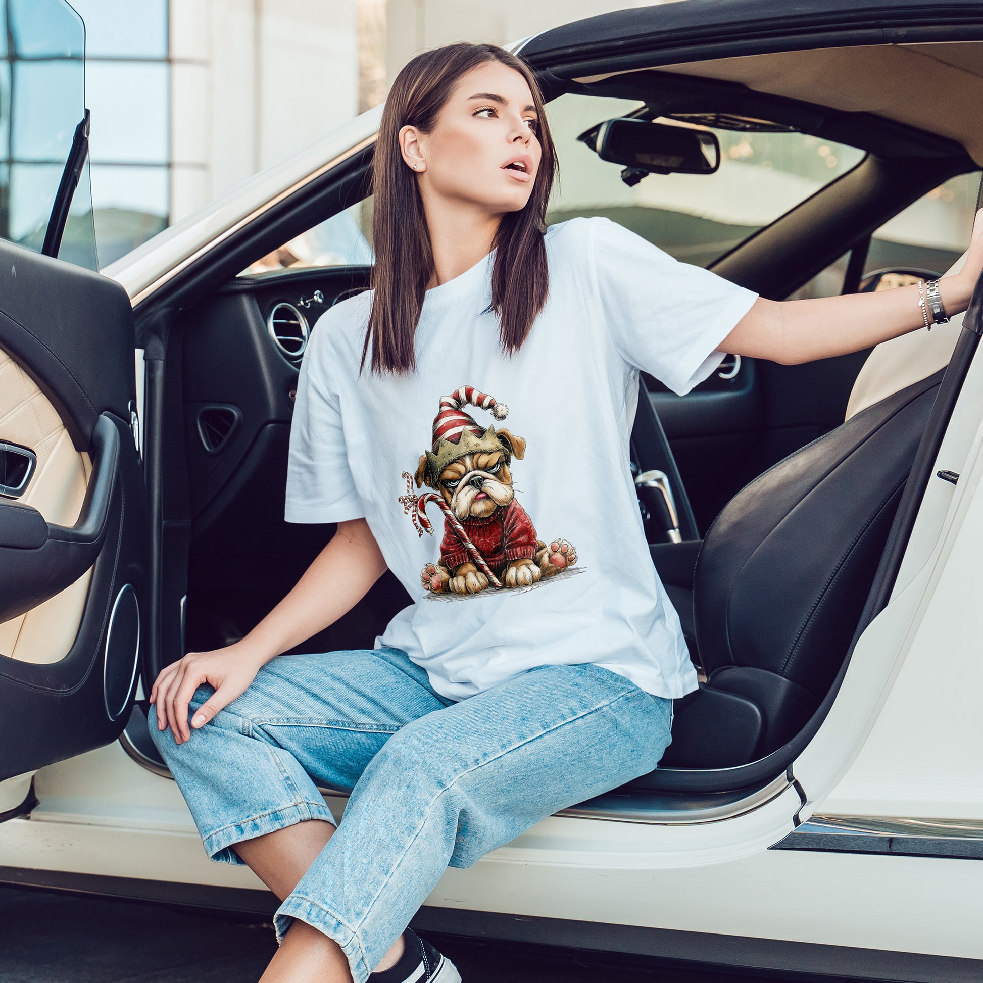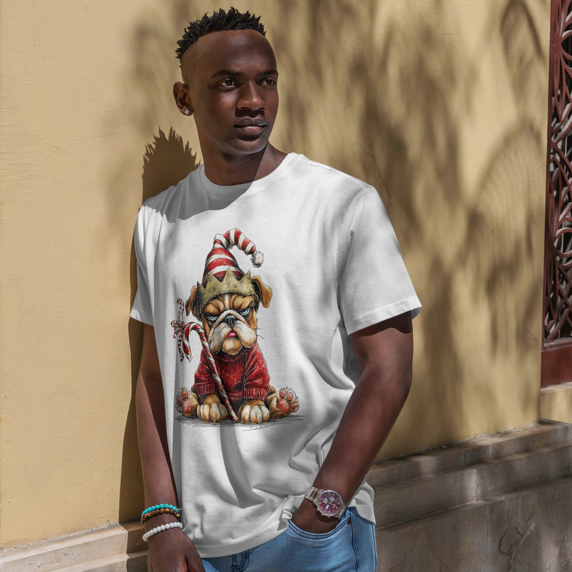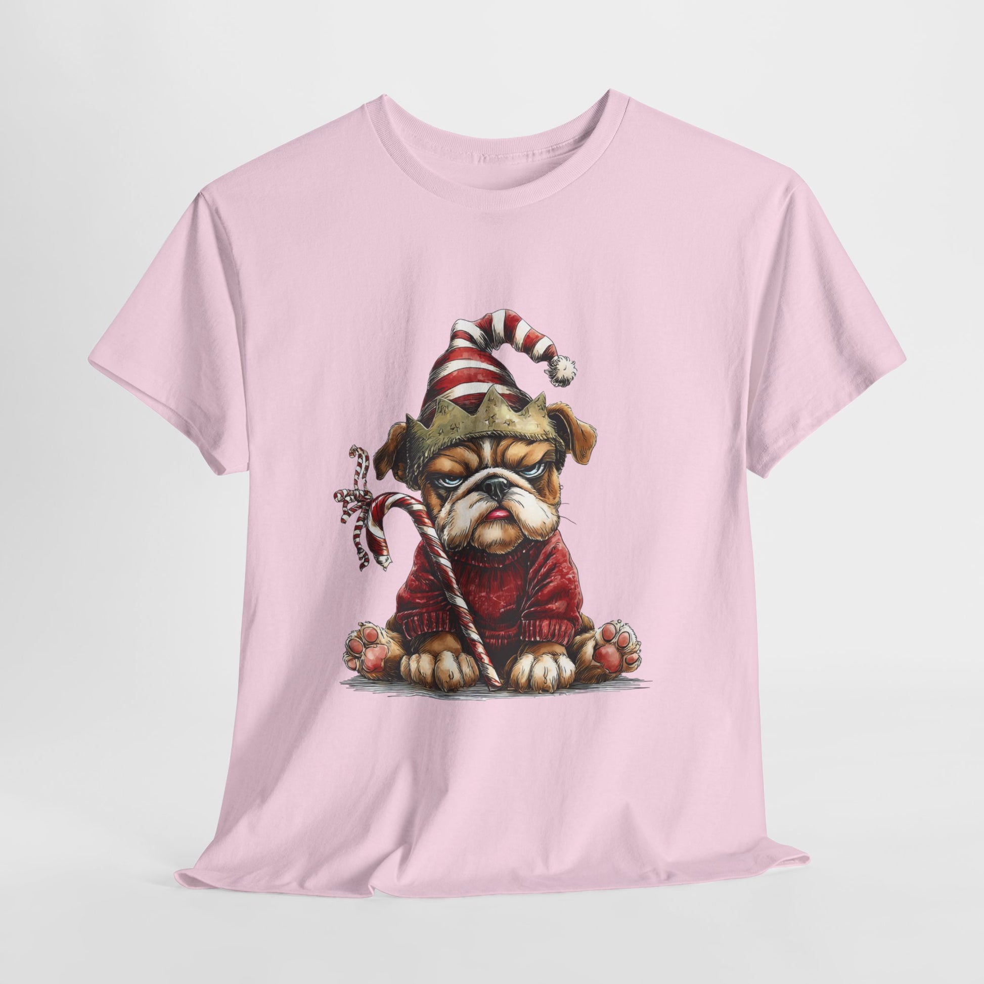 Festive outfit on - joy level pending. A magnificently unimpressed bulldog sits in a chunky red sweater with a stripey Santa hat, a paper crown, and a candy cane clenched like a scepter. Hand-drawn textures, oversized paws, and championship side-eye make this a party-ready tee for photos, cocoa runs, and sarcastic holiday vibes - a costume without the costume.
