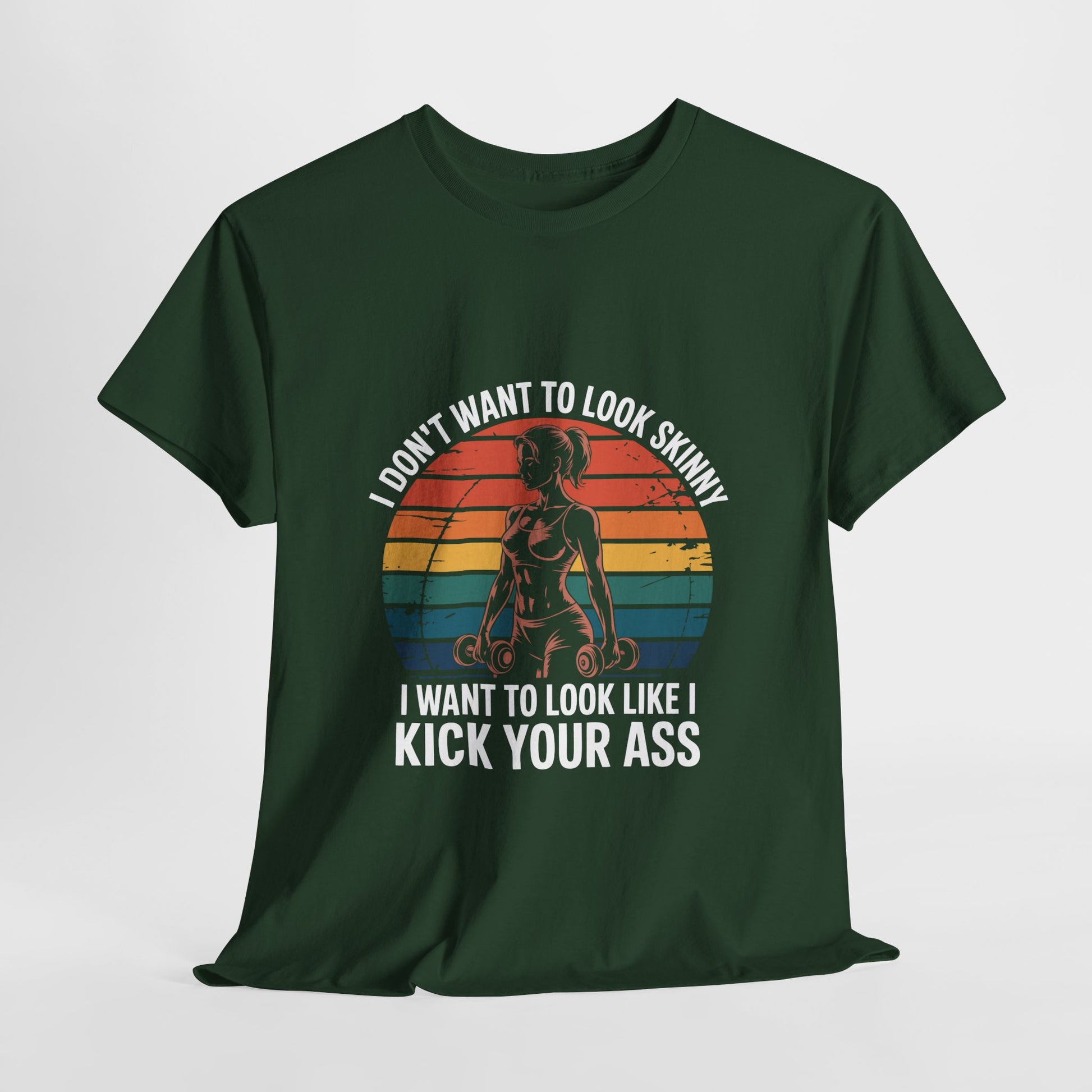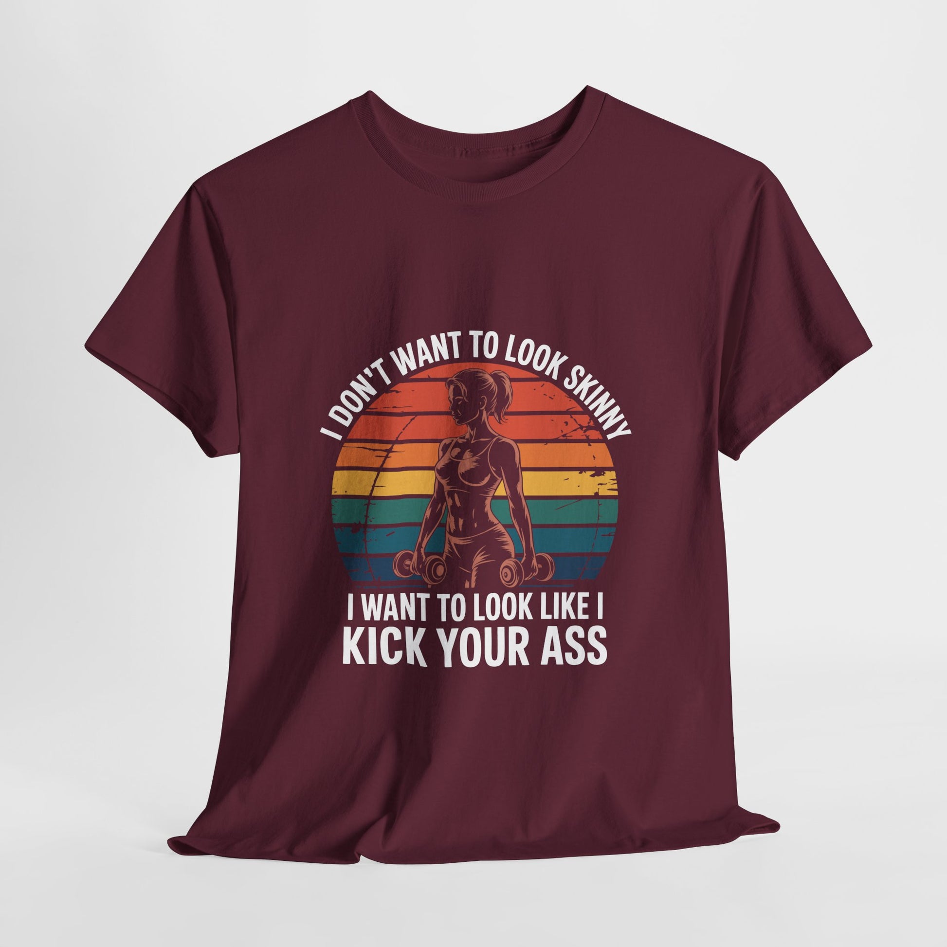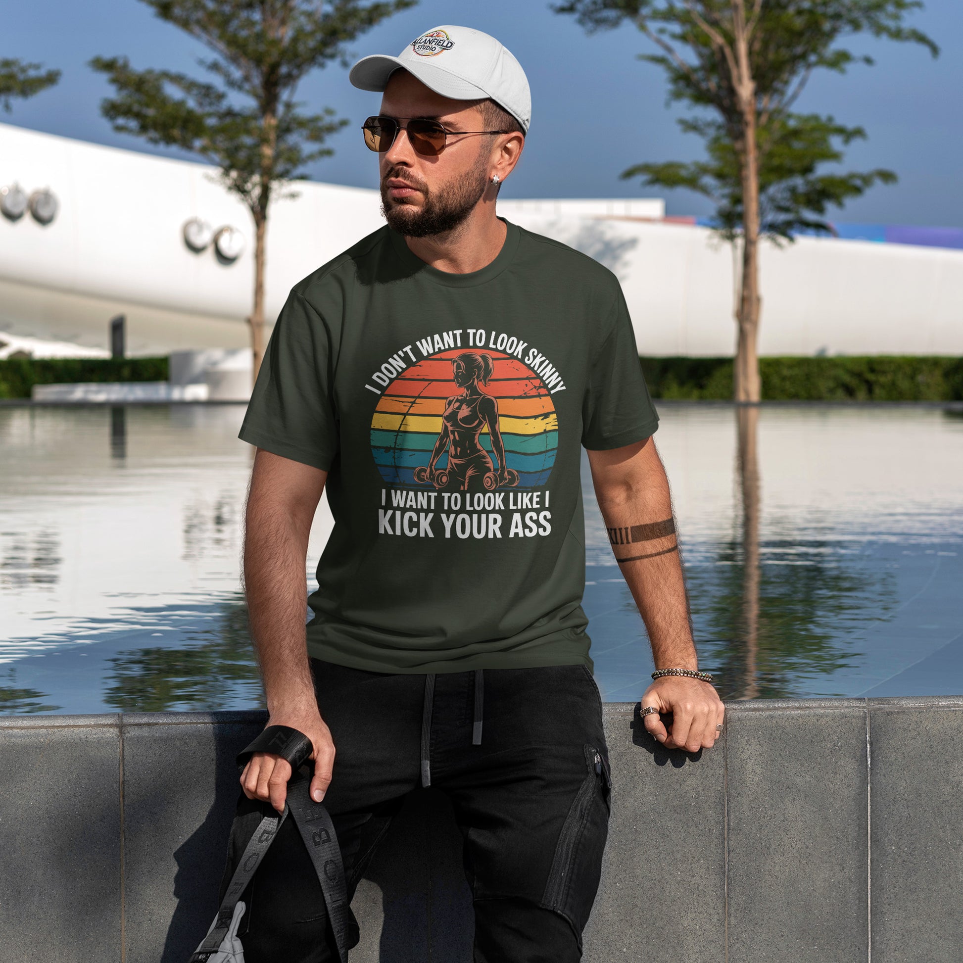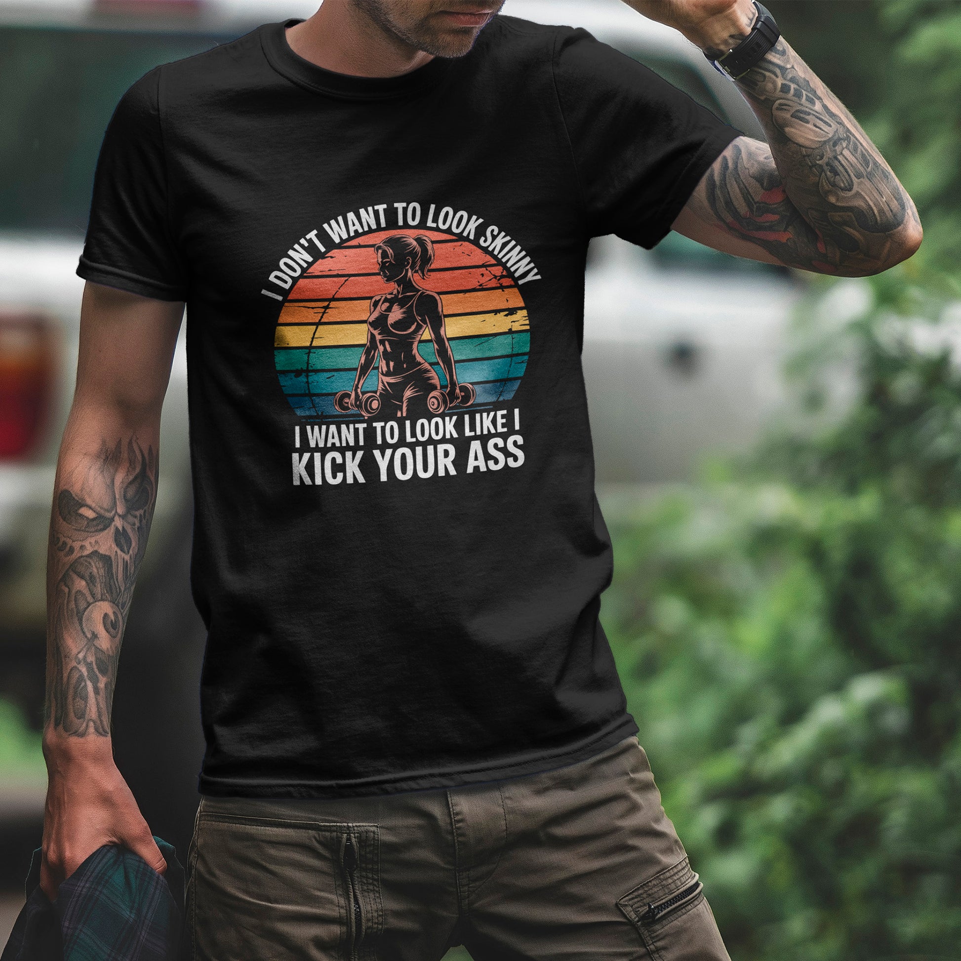 This bold fitness tee says it loud and clear: “I don’t want to look skinny. I want to look like I kick your ass.” Featuring a powerful female lifter holding dumbbells against a retro sunset backdrop, this design celebrates strength, confidence, and zero apologies. It’s not about shrinking yourself — it’s about showing up strong.