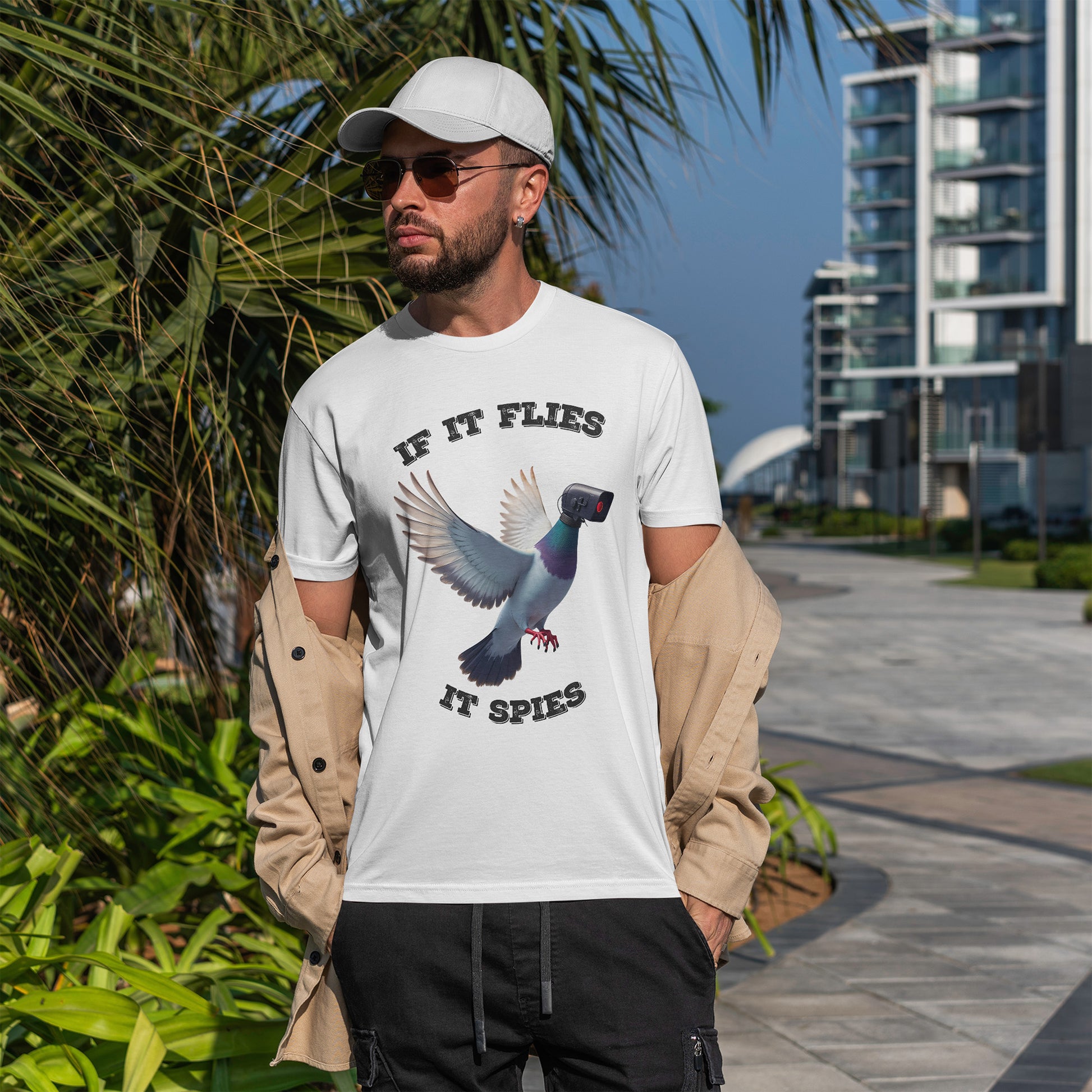 Hyper-detailed pigeon with a camera head and the line "IF IT FLIES, IT SPIES". A crisp meme tee for privacy nerds, city dwellers and anyone who side-eyes pigeons at the park. Distressed collegiate lettering and street-ready vibes make it an instant conversation starter.