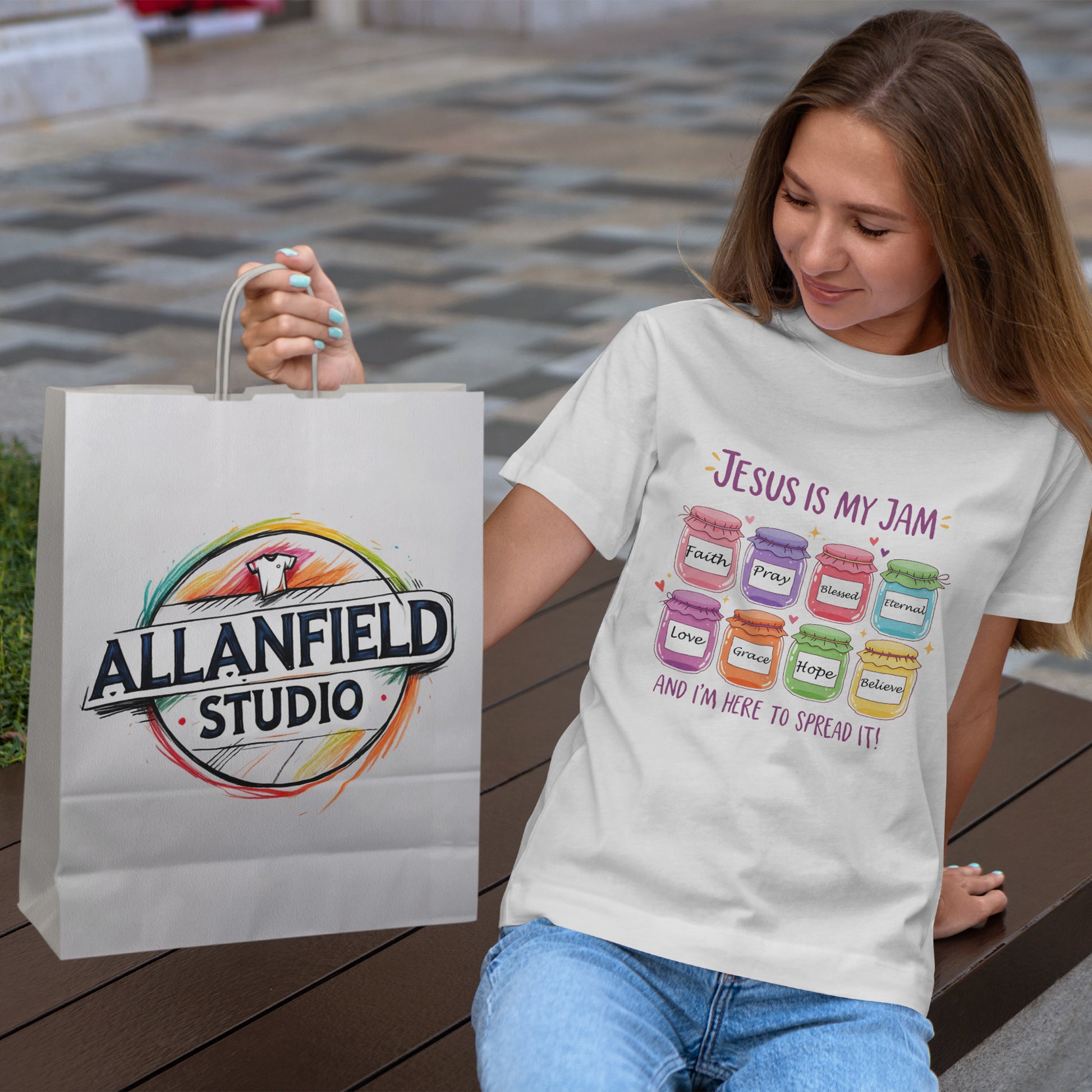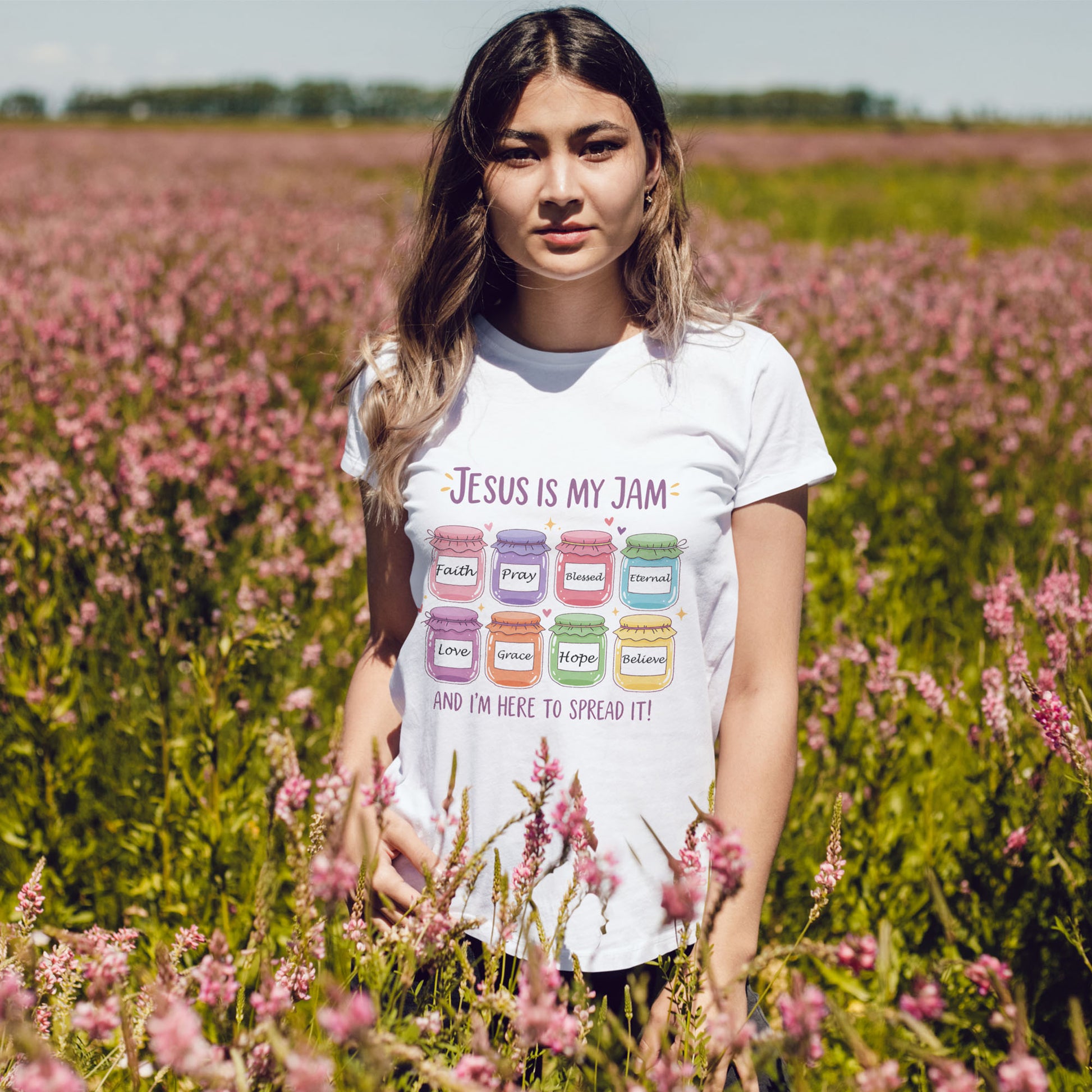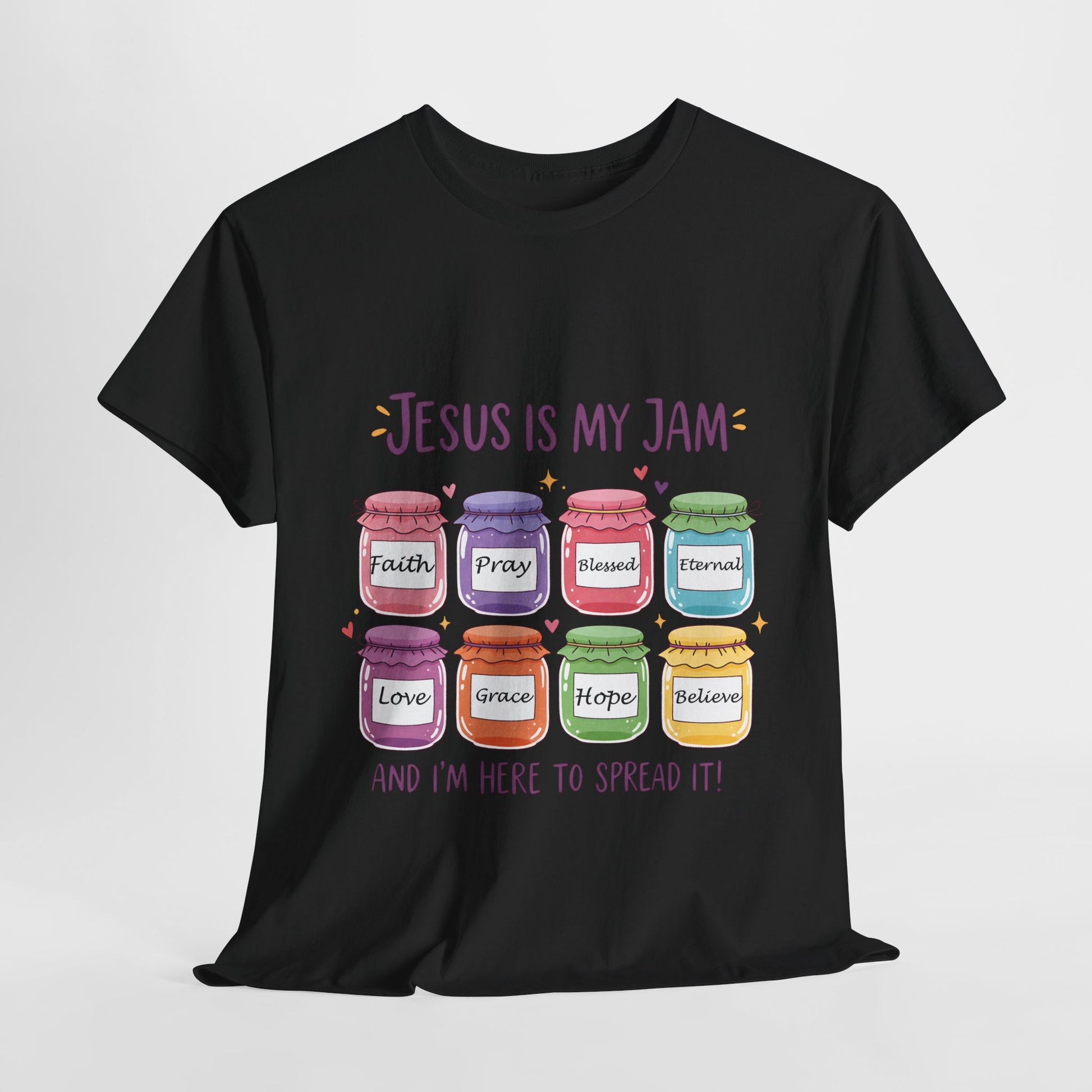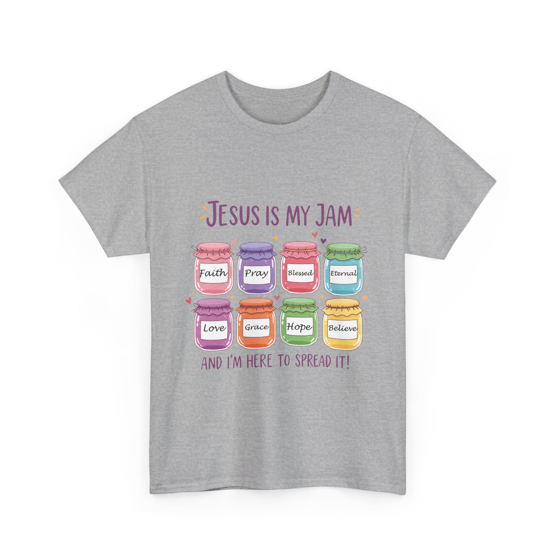 This fun and colorful Christian tee mixes faith with a playful pun. Featuring bright jam jars labeled Faith, Love, Grace, Hope, Believe, and more, it’s the perfect shirt to share positivity and joy wherever you go. Whether you’re at church, Bible study, or just out with friends, this tee spreads a little love (and a lot of smiles).