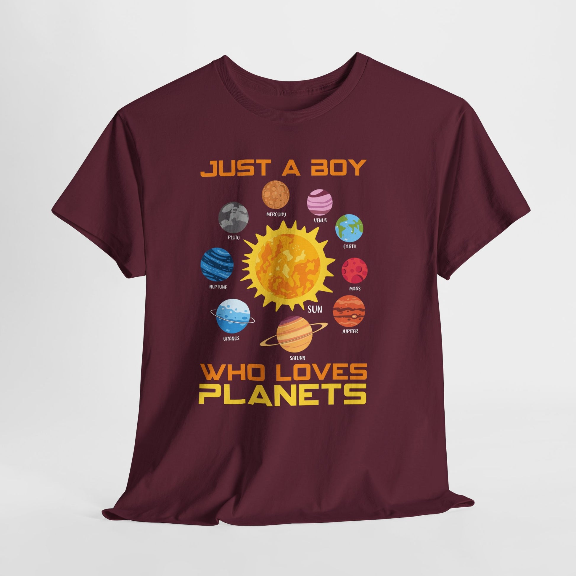 For the kid-at-heart who never stopped looking up, this tee is a whole mini universe in one design. It features a bright solar system layout with the Sun in the center and planets orbiting all around in bold, playful color. Across the top and bottom, the statement reads “JUST A BOY” and “WHO LOVES PLANETS” for a simple, proud space-loving vibe. It’s an easy everyday shirt for school days, museum trips, or weekend hangs. If planets, space facts, and starry-night daydreams are your thing, this one fits right in.