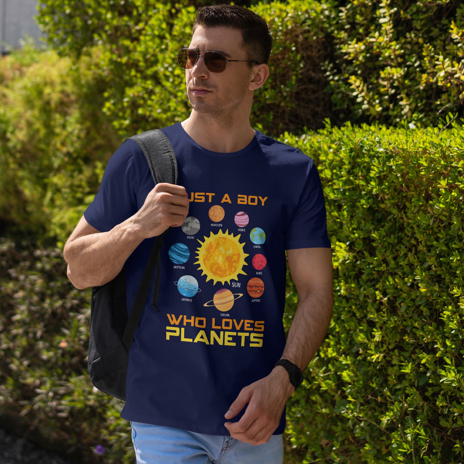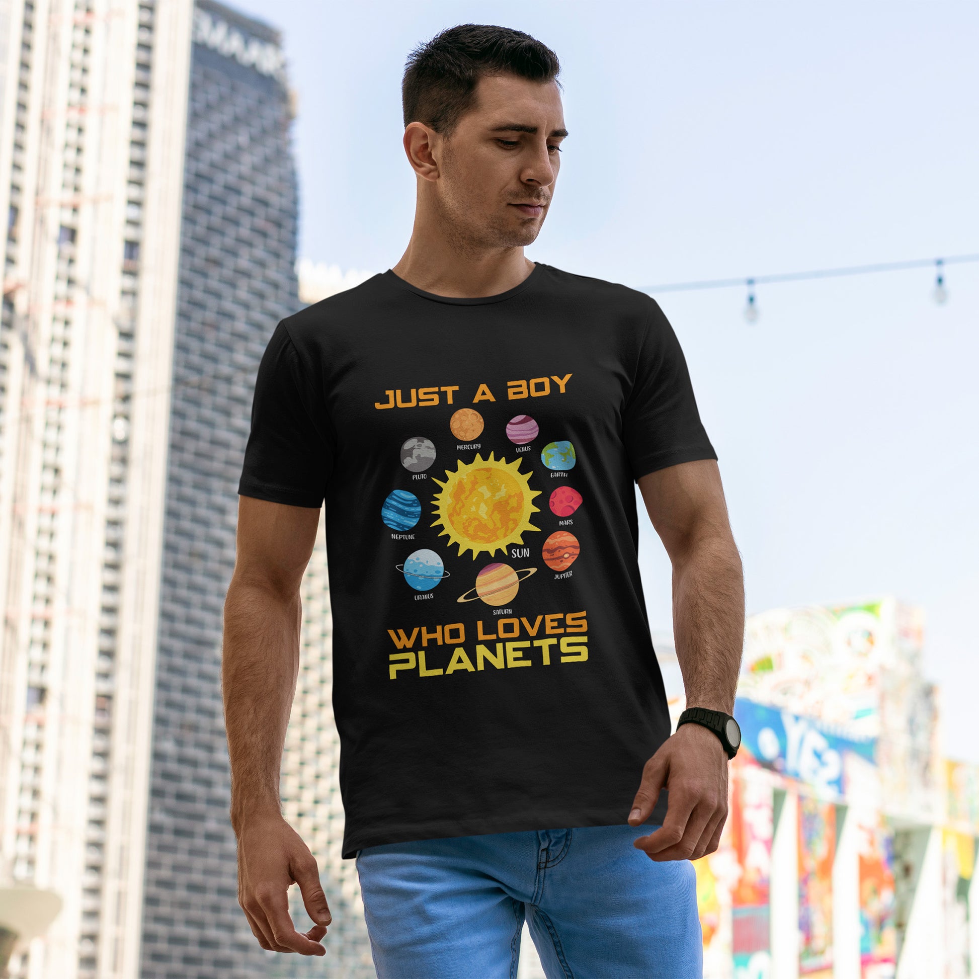 • Bold statement text that reads JUST A BOY WHO LOVES PLANETS