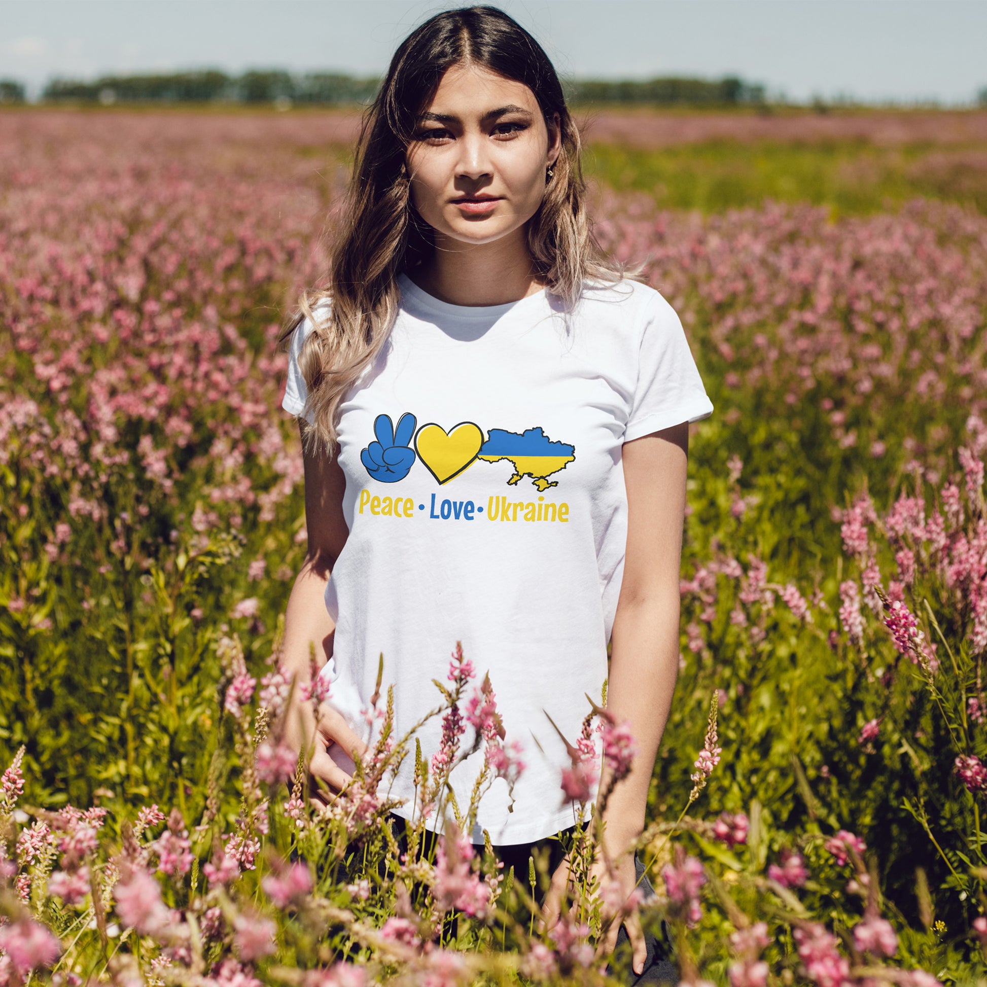 Peace. Love. Ukraine. A clean, high-visibility design featuring a peace hand, a bright heart and the Ukraine map in blue and yellow. Bold in thumbnails and easy to read from a distance at rallies, concerts and campus events — anywhere you want your stance seen.