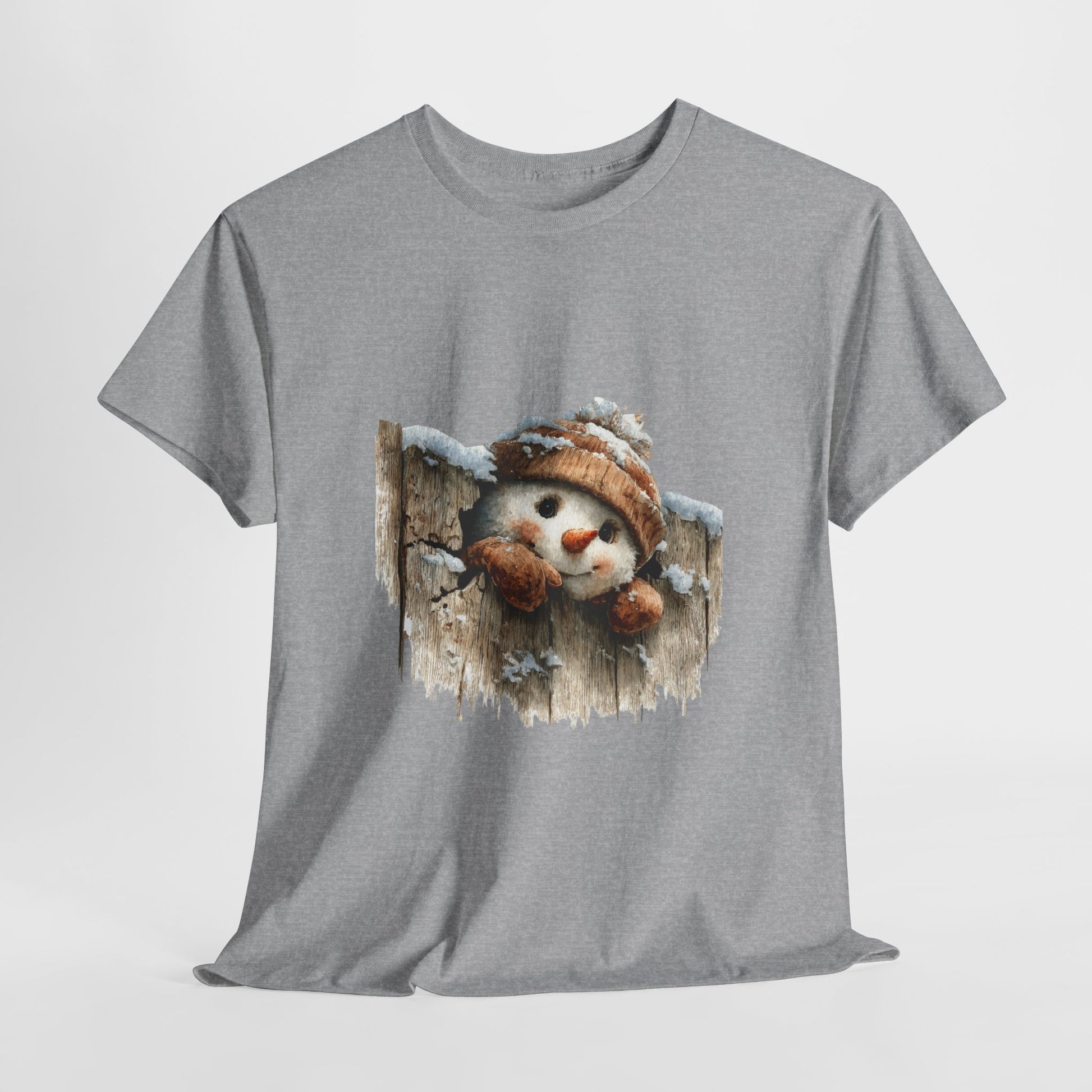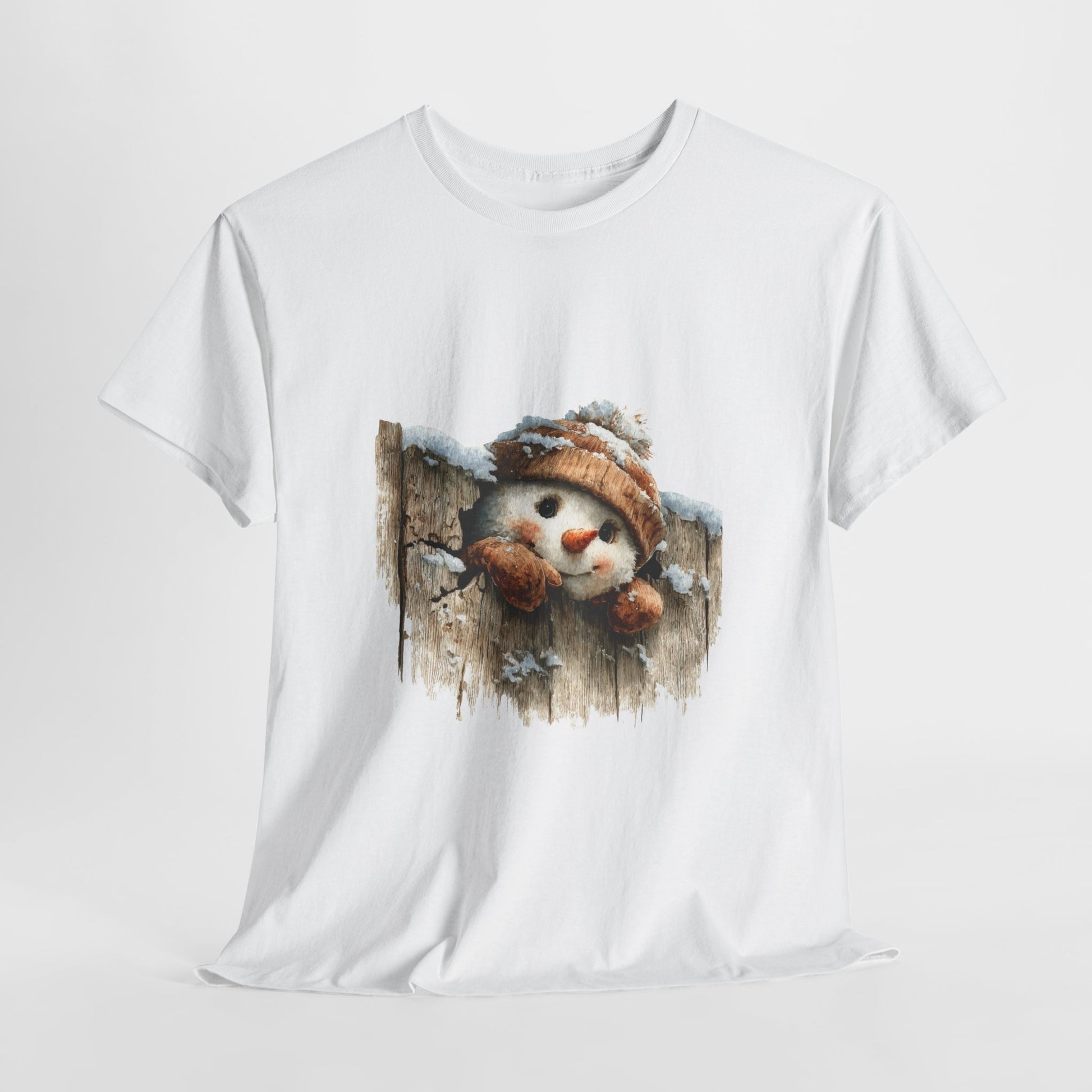 Peek-a-boo, cocoa crew. A cheerful snowman in a chunky knit beanie and mittens peeks through a rustic wood fence dusted with fresh snow. Soft watercolor texture, warm barn-brown tones, and that bright carrot nose create a cozy, vintage-leaning graphic that pops on both dark and light tees.