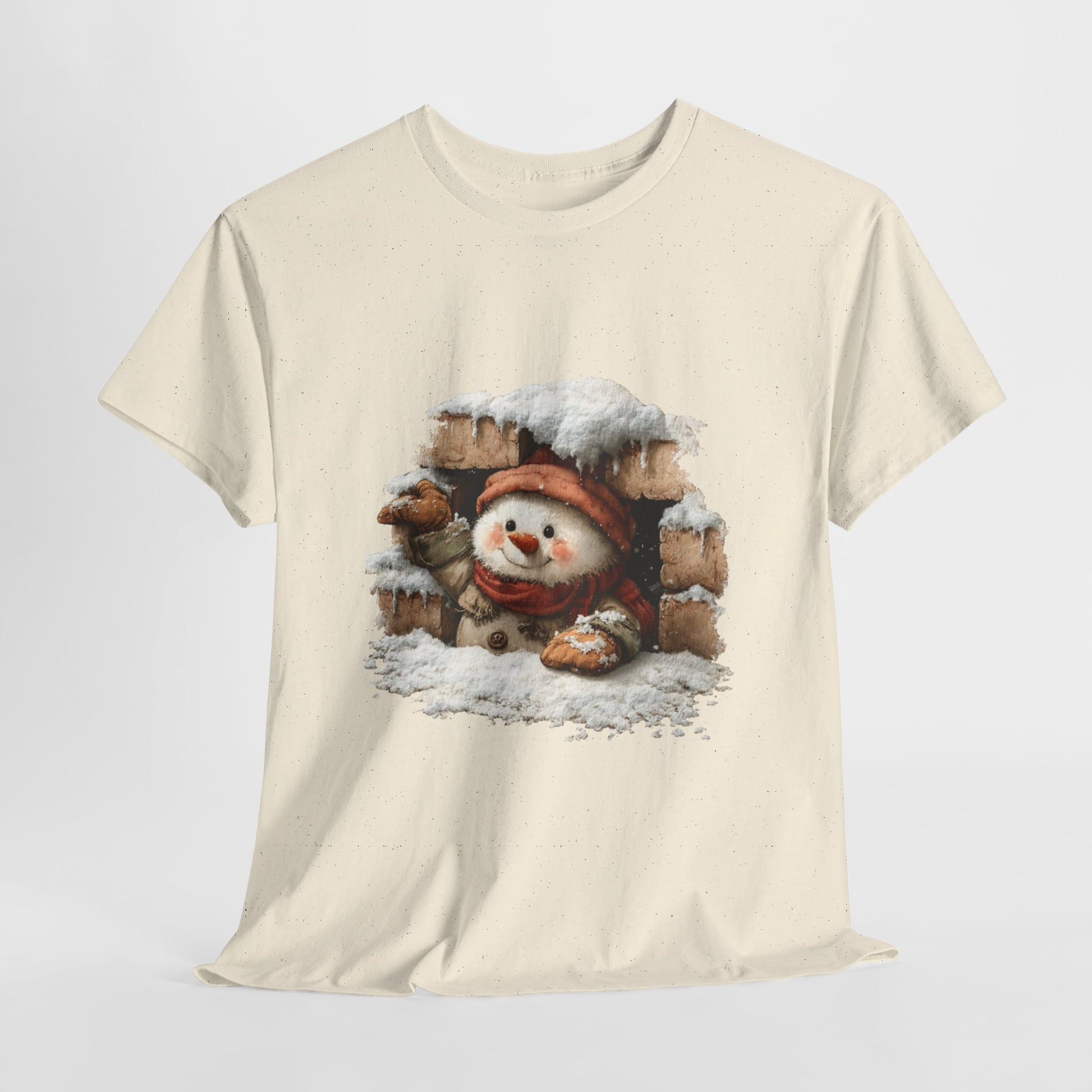 Snowy hello, cozy vibes. A cheerful snowman waves from a brick window dusted with snow, bundled in a knit beanie, warm scarf, and mittened hands. Painterly texture, soft winter whites, and rustic browns make this an easy “no-costume” festive tee for tree runs, cocoa stops, and every cuddly December day.