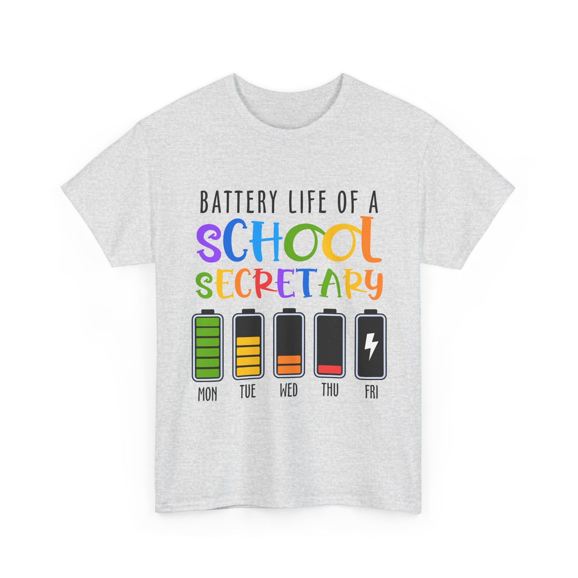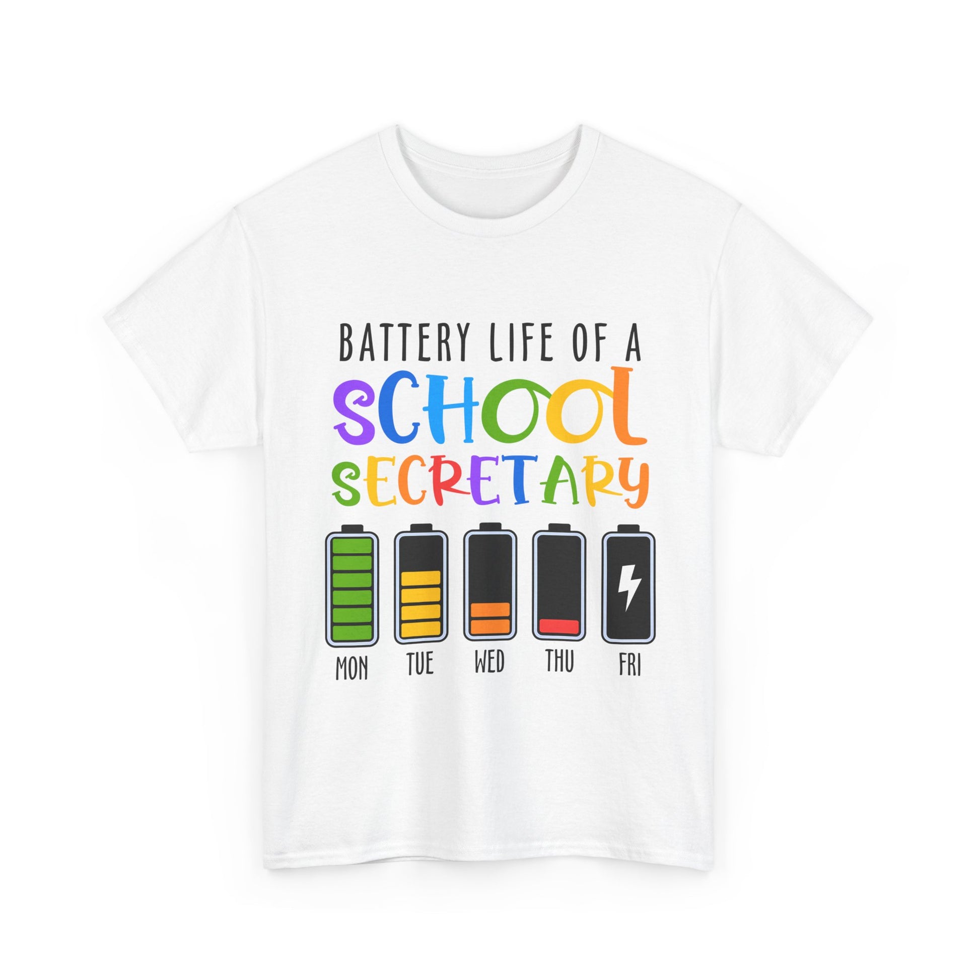School Secretary Battery Shirt - Funny Rainbow Staff Tee for School Office Life, End of Year Exhaustion Gift for Secretaries