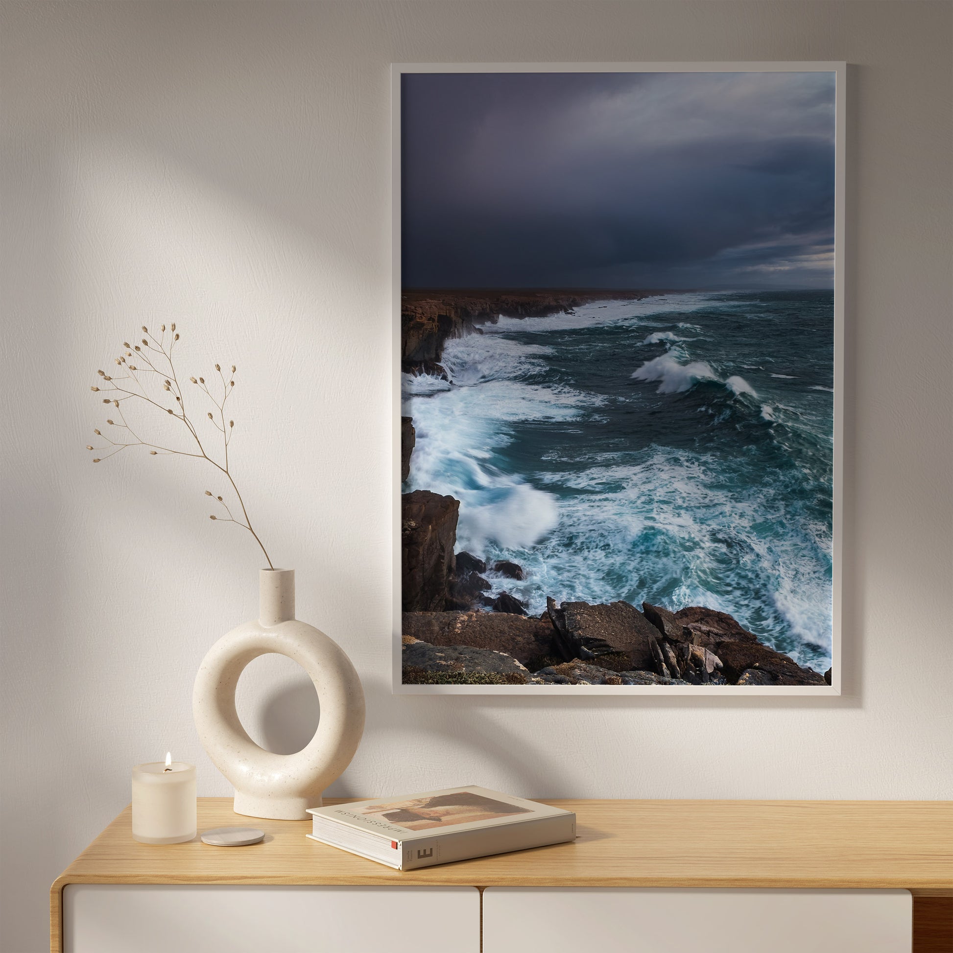 🌊 Thunderclouds, rugged cliffs, and crashing turquoise surf - bring the wild coast home.