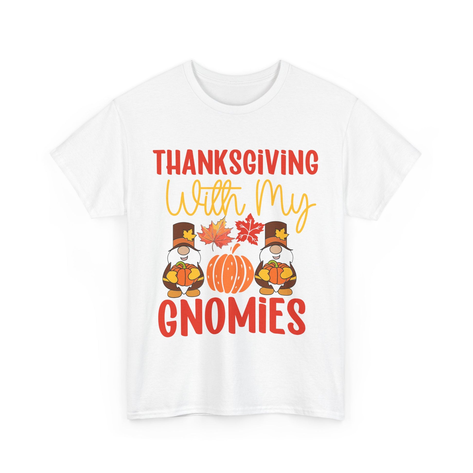The Thanksgiving With My Gnomies T-Shirt brings cozy, playful fall vibes. Two festive gnomes with pumpkins, leaves, and the cheerful phrase “With My Gnomies” make this the perfect tee for family gatherings, Friendsgiving, and pumpkin patch photos.