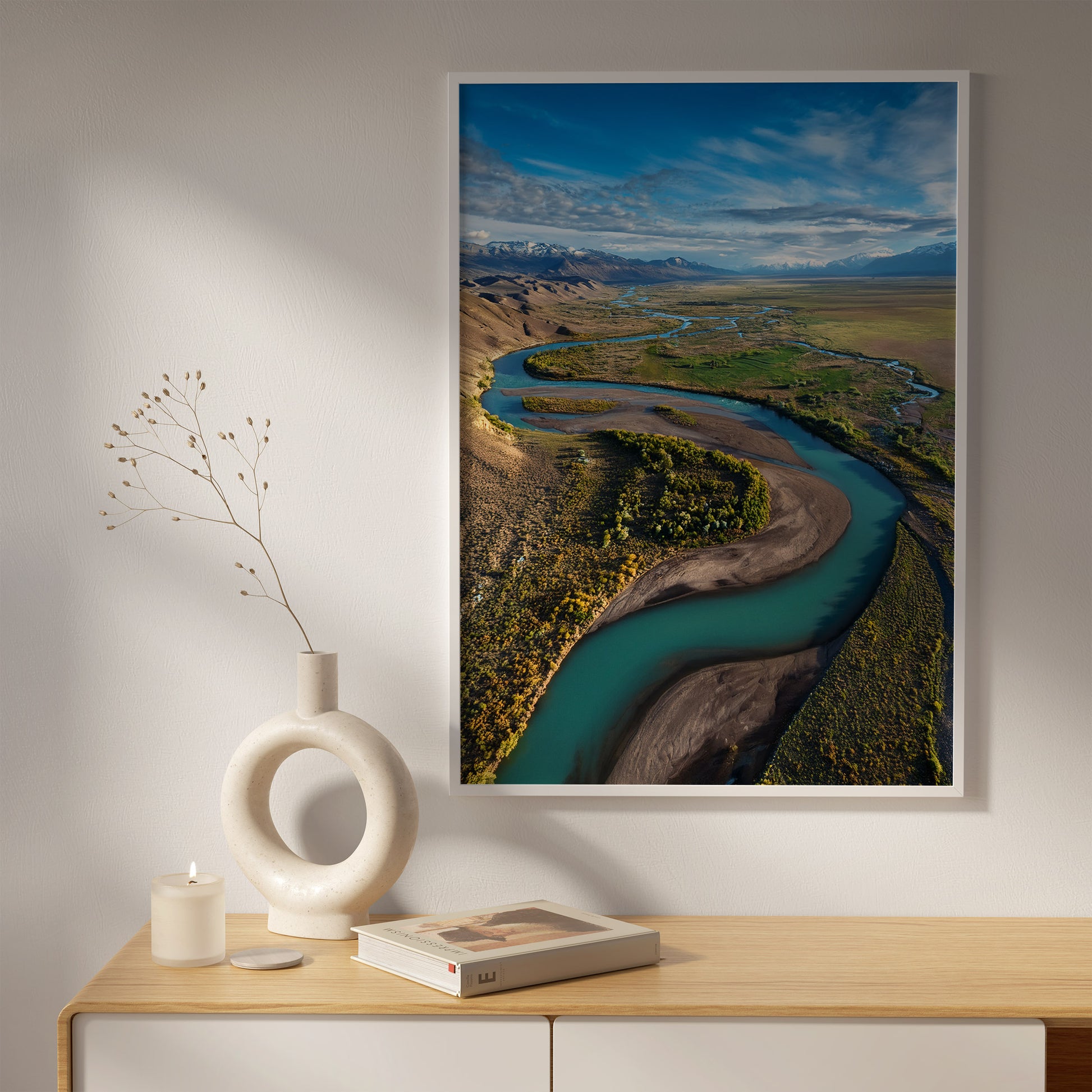 - Hang the widest river-bend image in the center and flank it with the tighter valley views for a natural left-to-right flow. Matte or luster paper keeps gradients in the water soft and elegant.