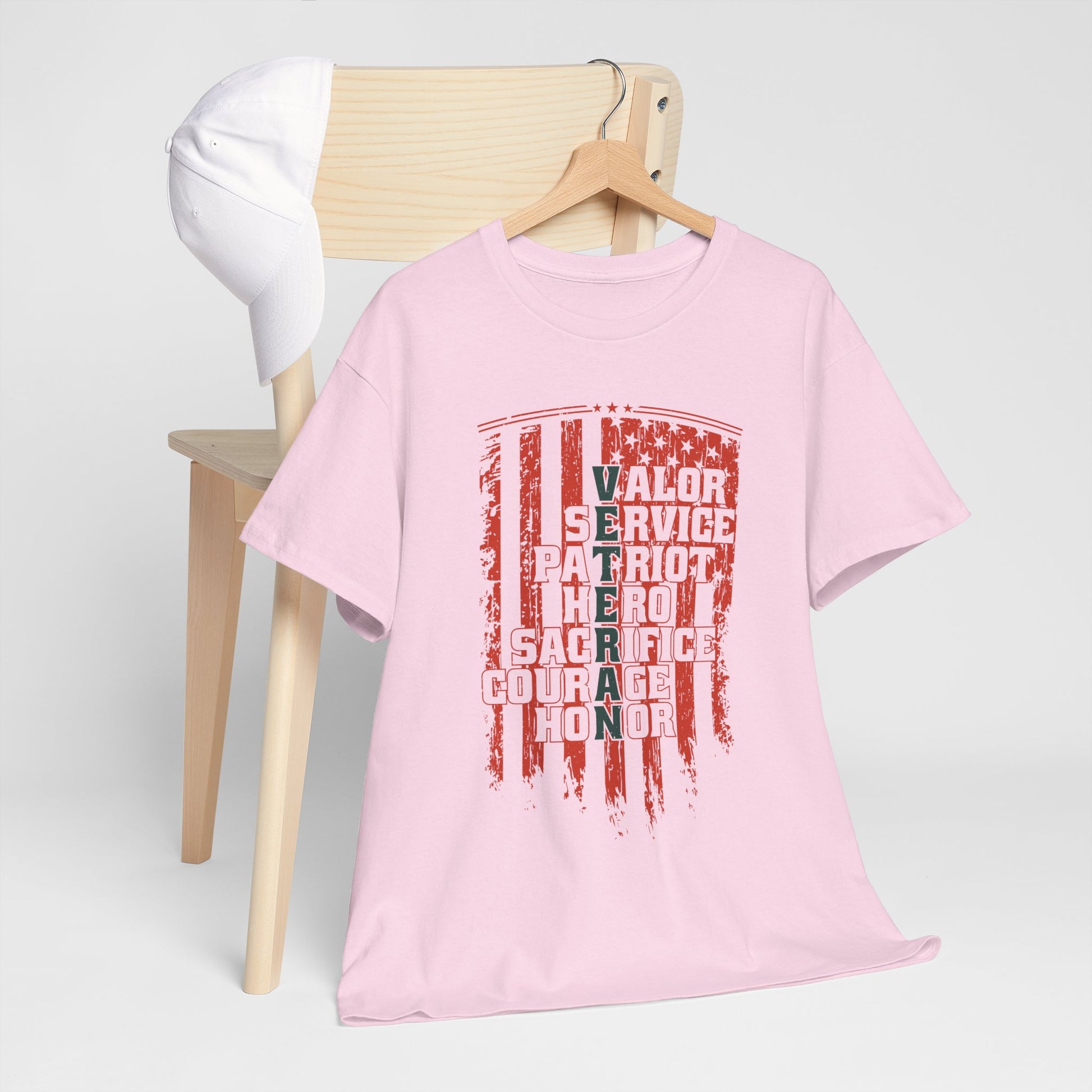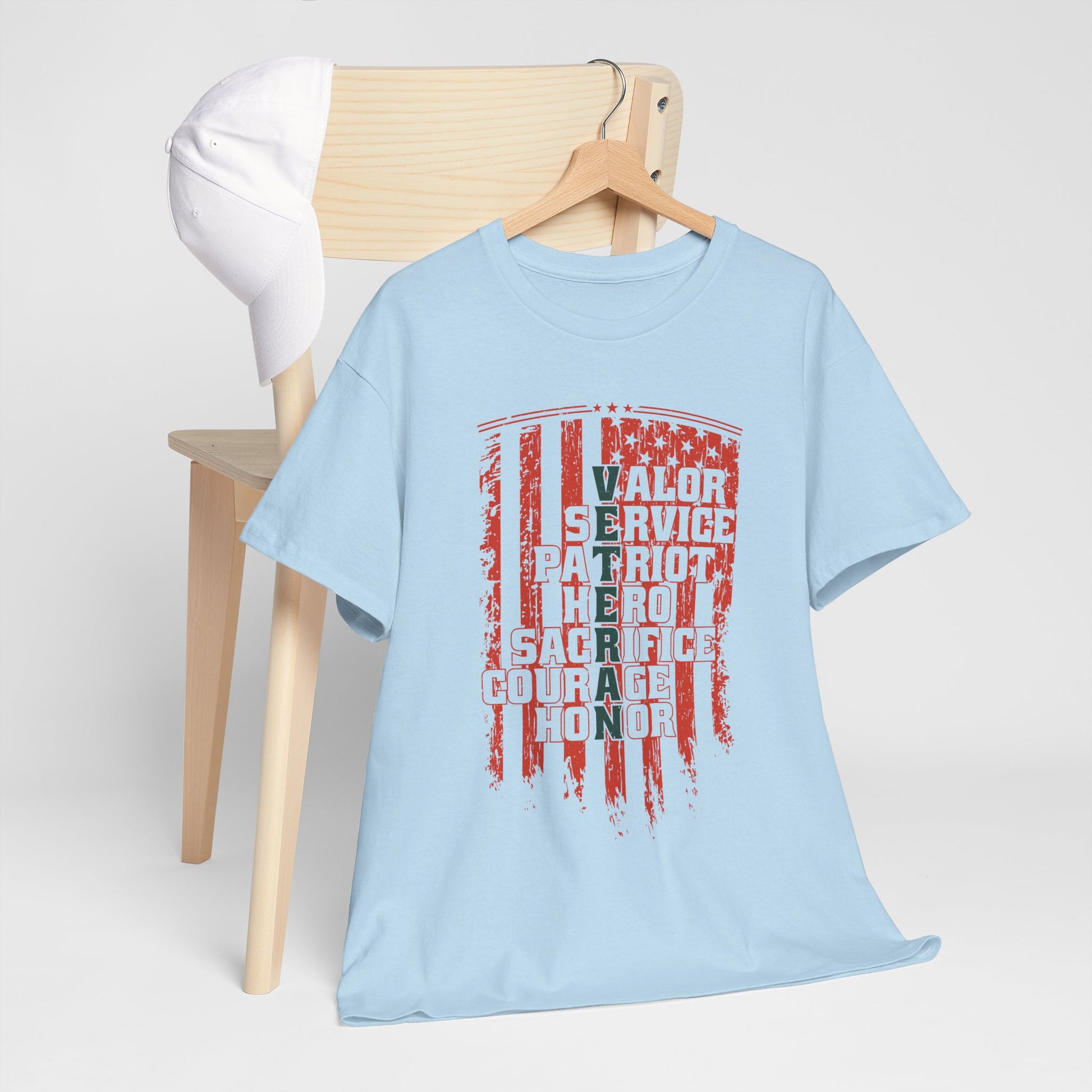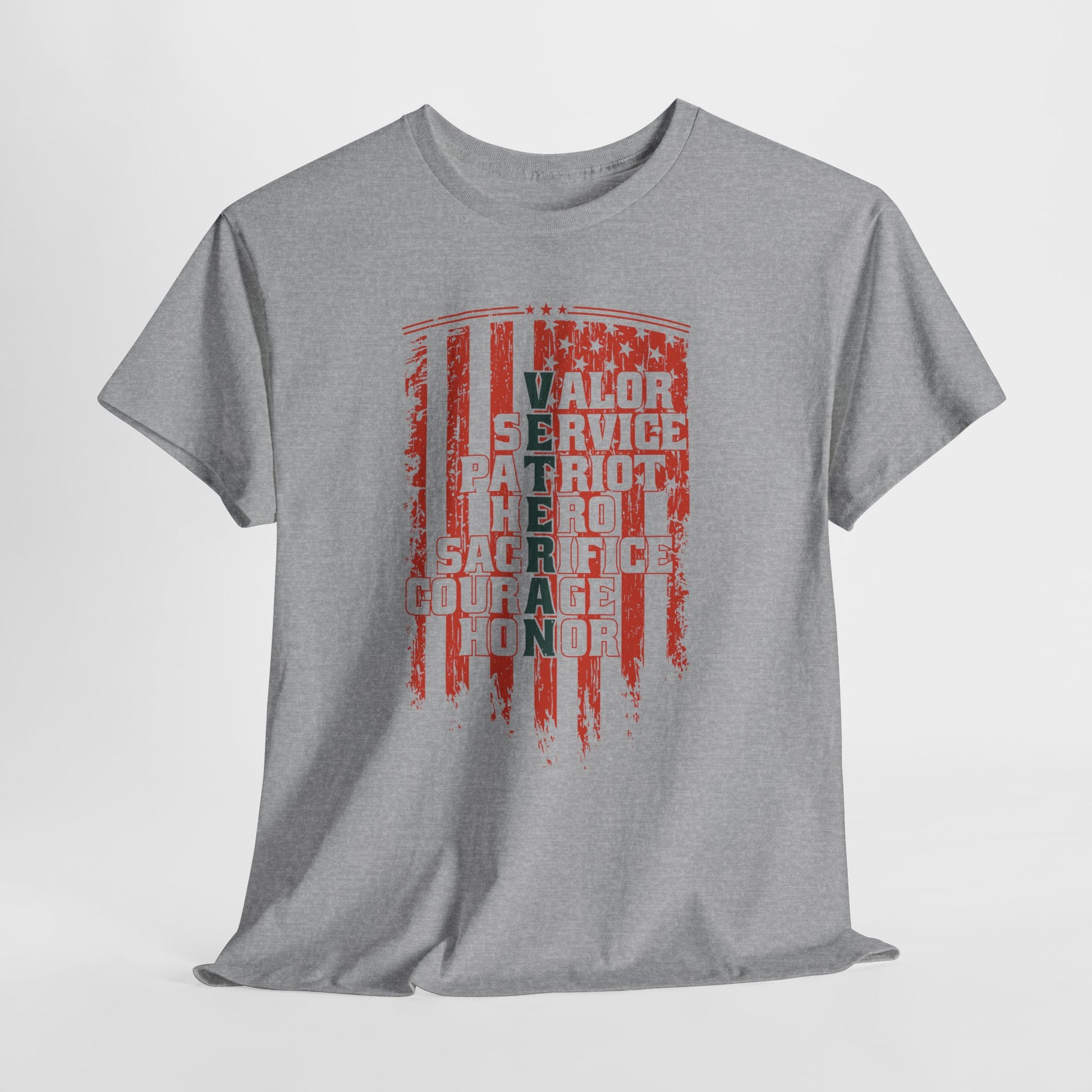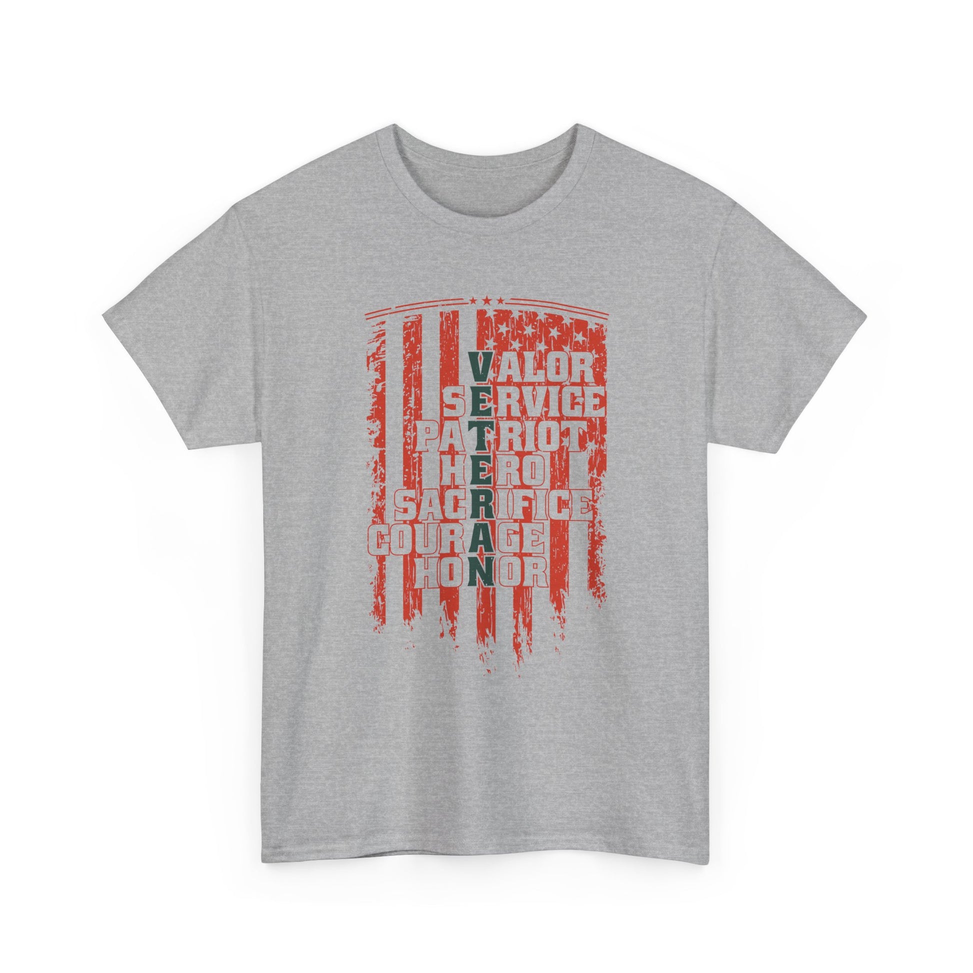 Wear your honor, letter by letter. V - E - T - E - R - A - N spells out what service truly means - valor, honor, courage, sacrifice and duty - over a distressed U.S. flag. Not just clothing - a declaration for those who served, still serve and never forget.