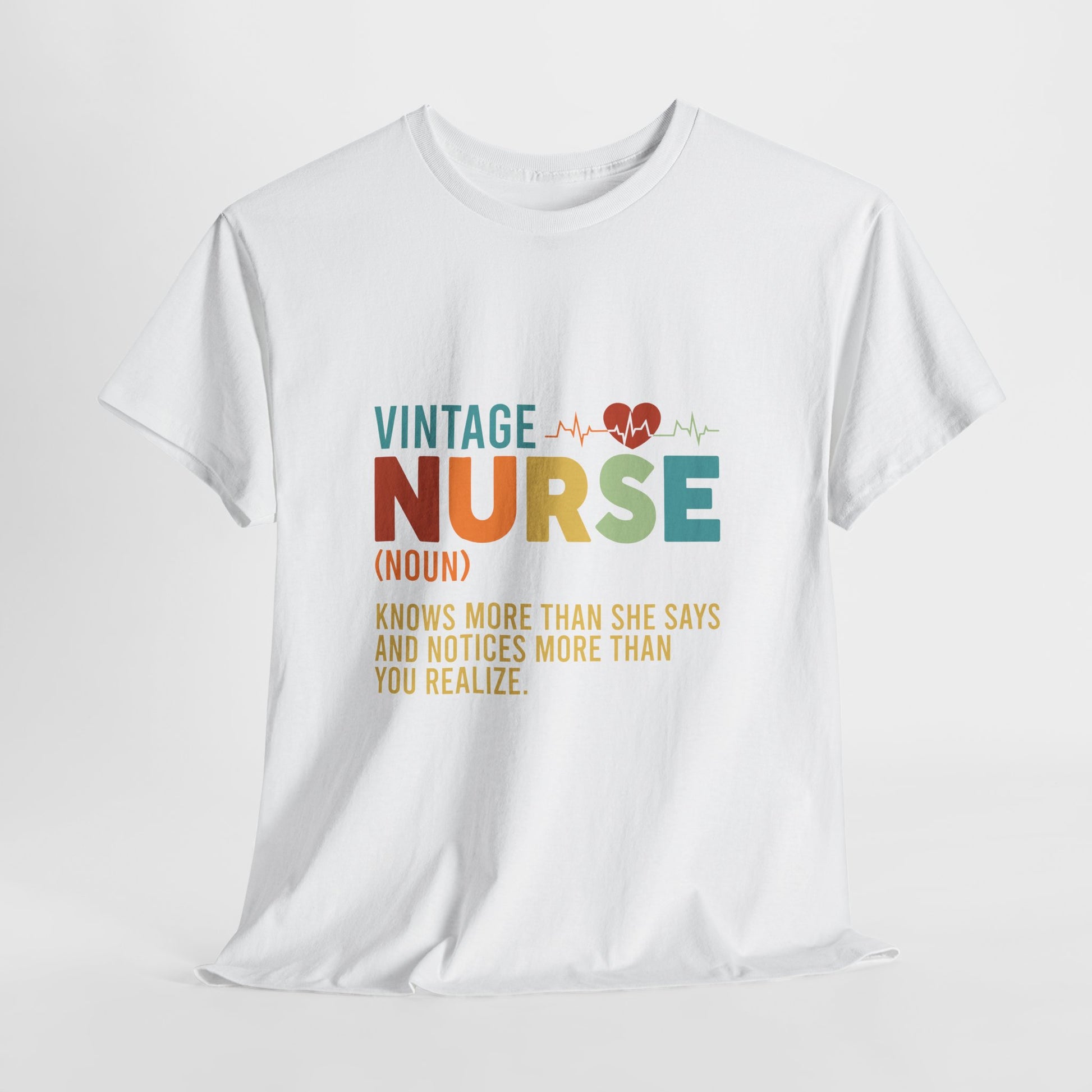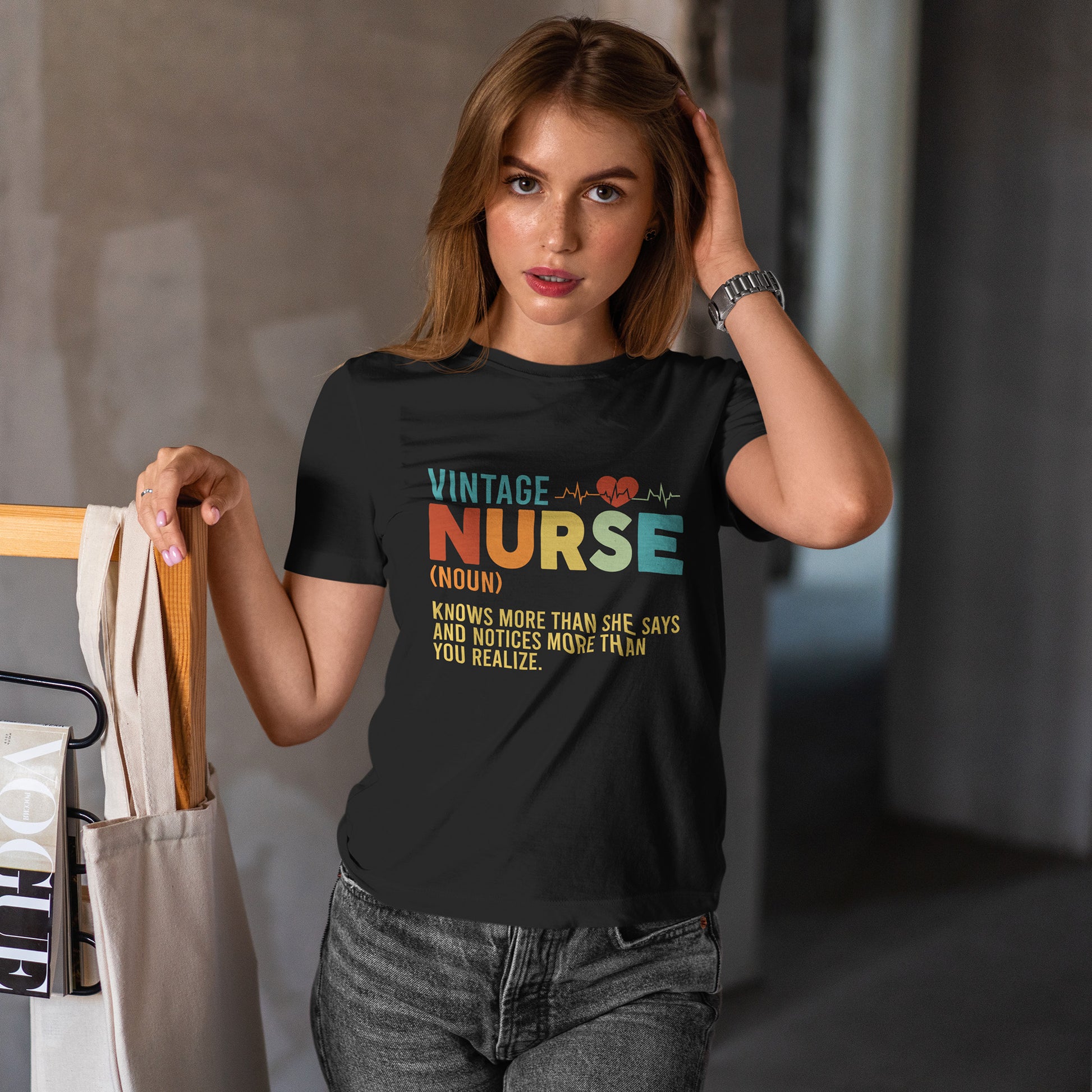 Experience > textbook. This retro-palette “Vintage Nurse (noun): knows more than she says & notices more than you realize” tee salutes the quiet legends on every floor. Bold block lettering and an EKG heart line read perfectly in thumbnails and across the nurses’ station.