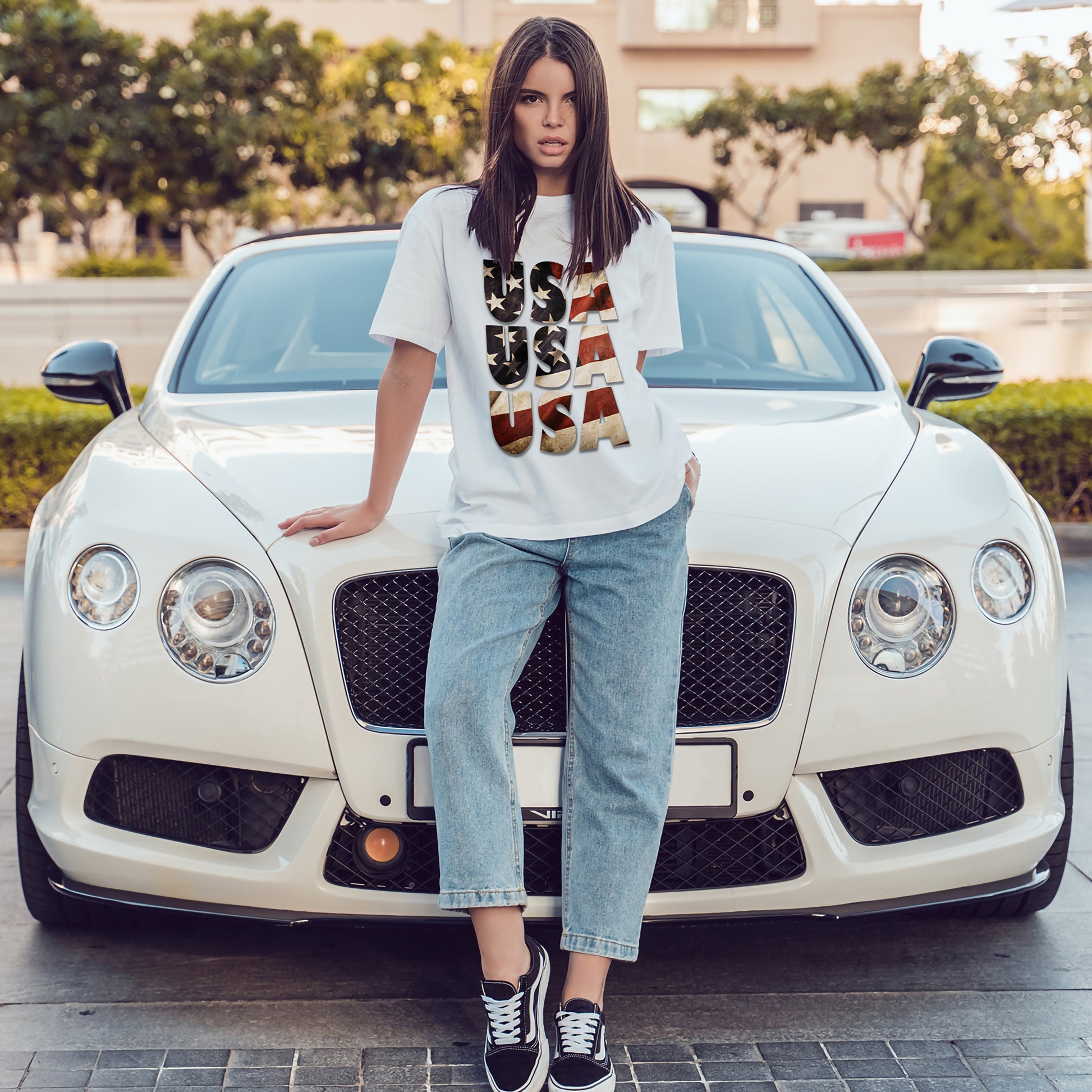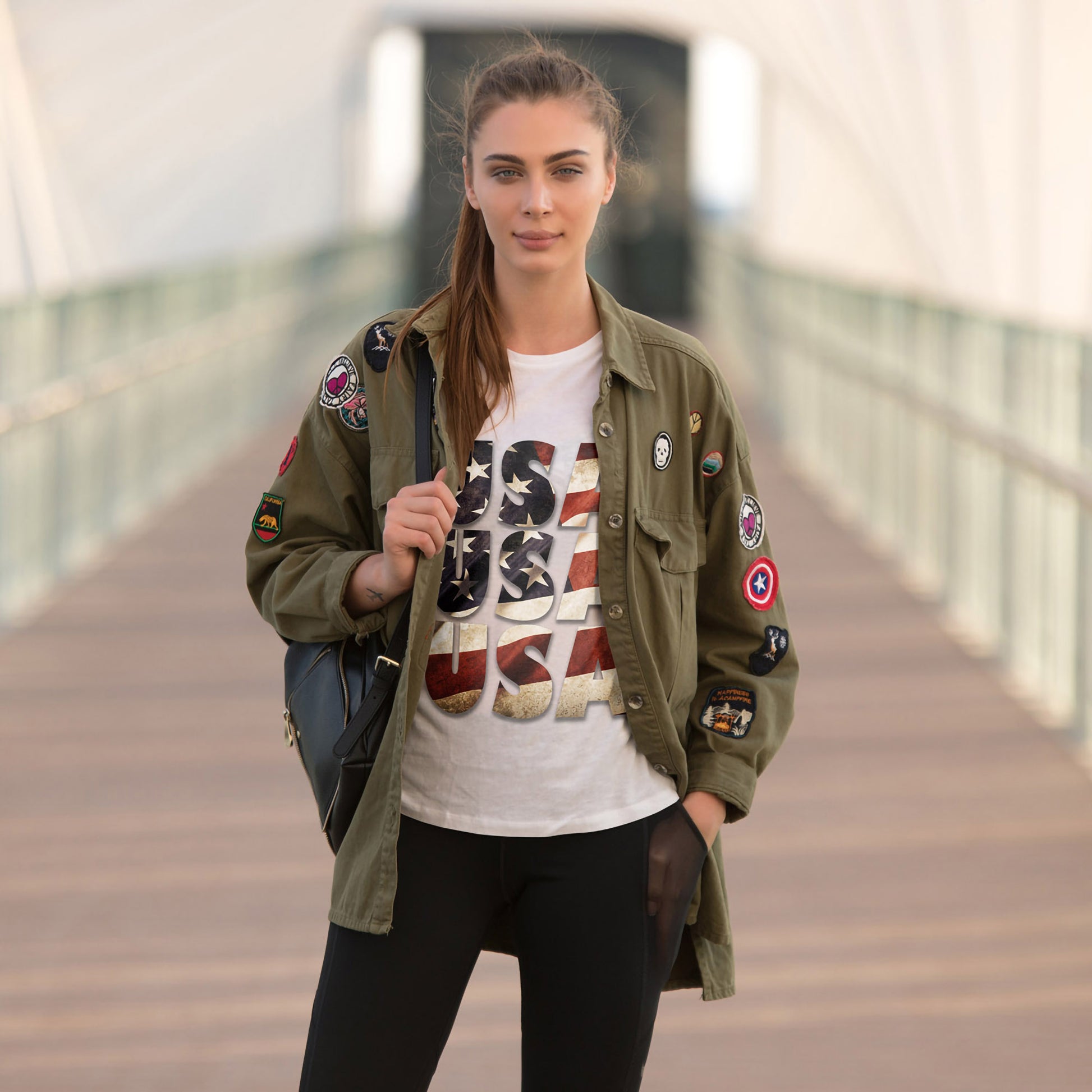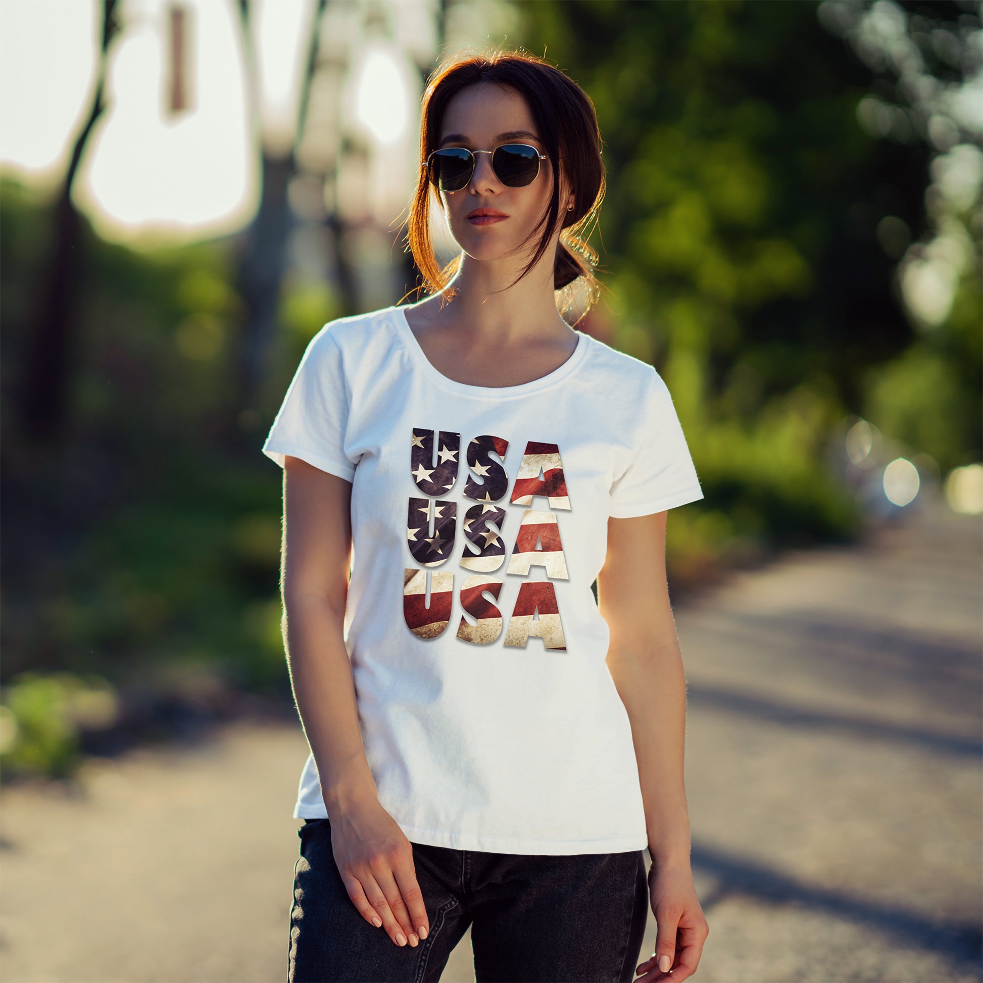 - Vintage-inspired distressed USA flag graphic